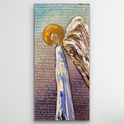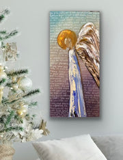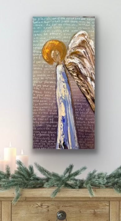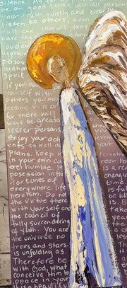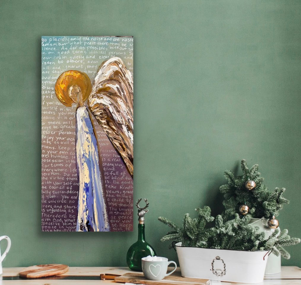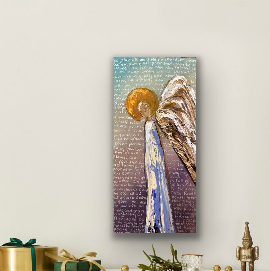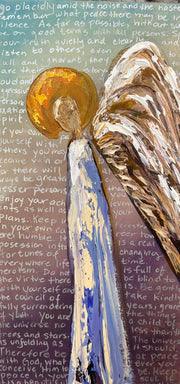 "Desiderata" features a serene angel against a gradient background of blue and aubergine, adorned with silver accents and hand drawn words from the beloved poem of the same name by Max Ehrmann. Originally written in the early 1920s, “Desiderata” gained popularity in the form of posters during the 1960s and 1970s. As such, this painting holds a special place in my heart and I hope it brings joy to others as well.