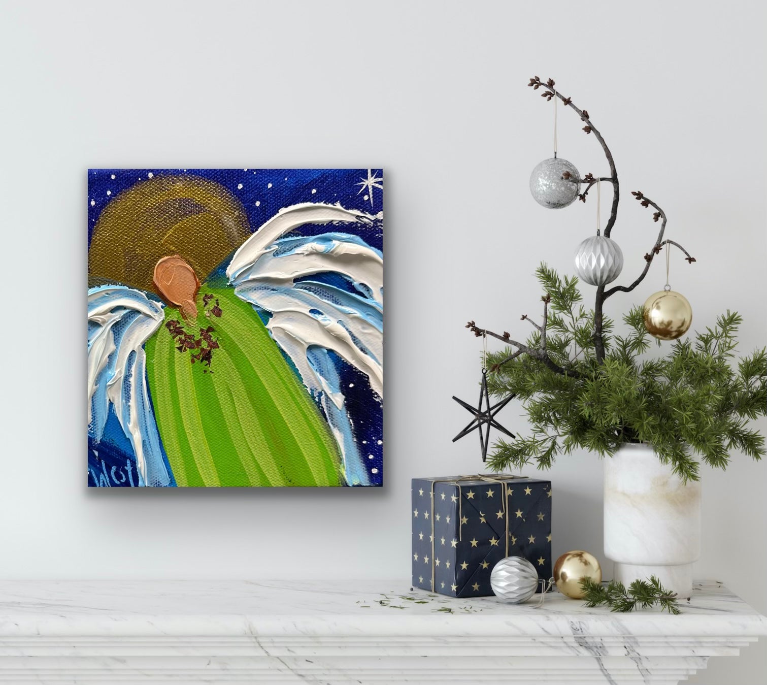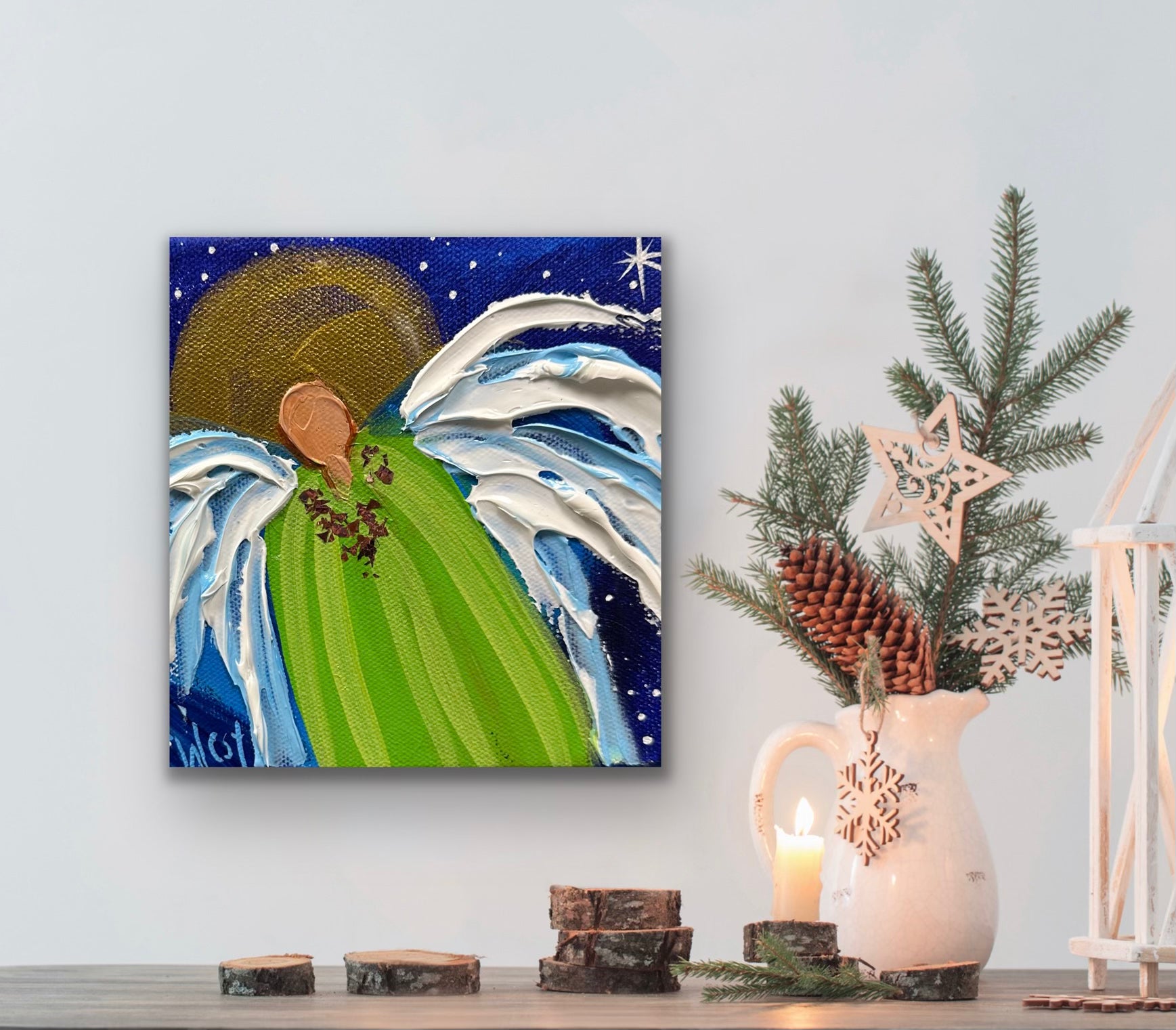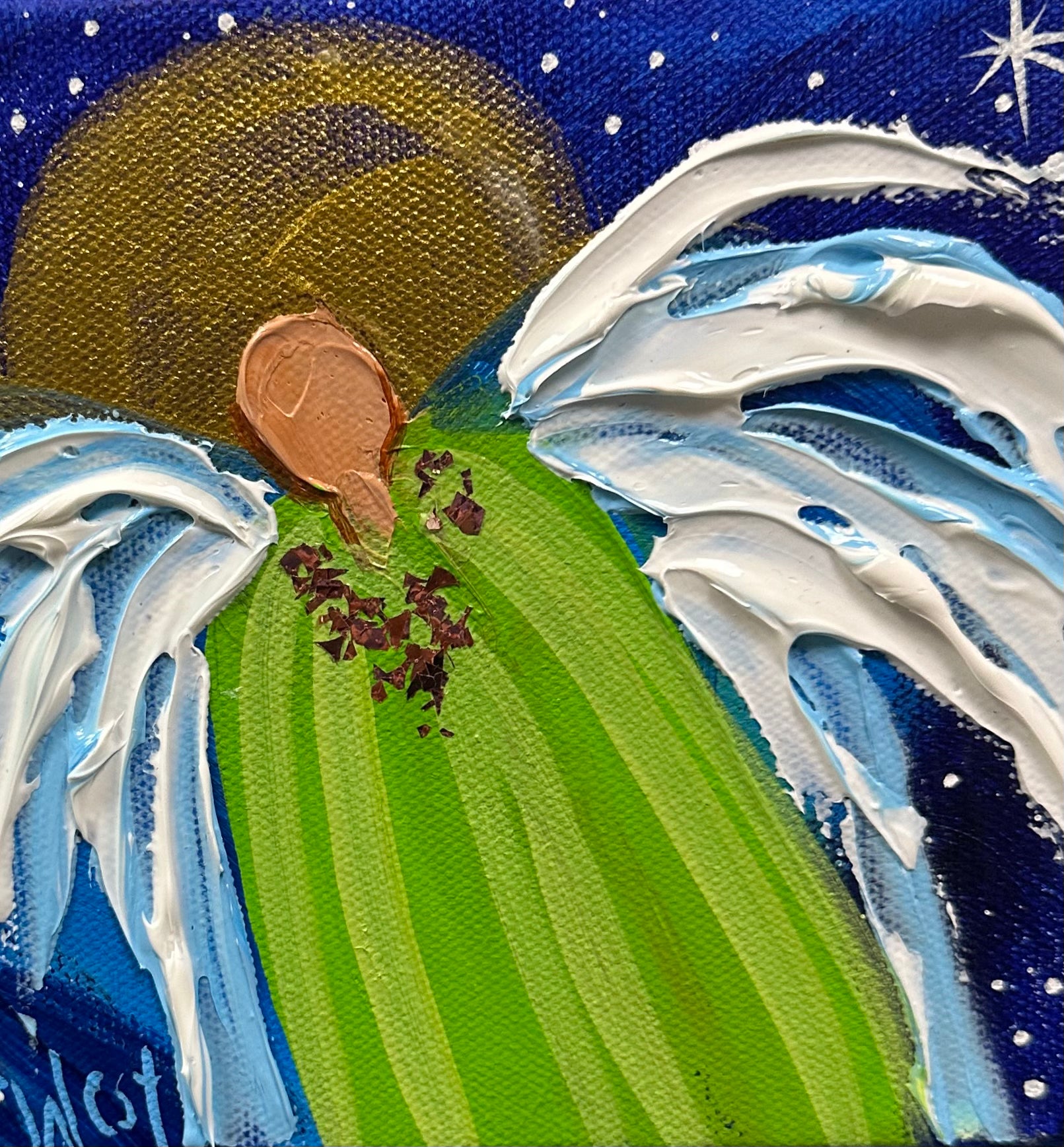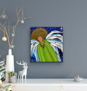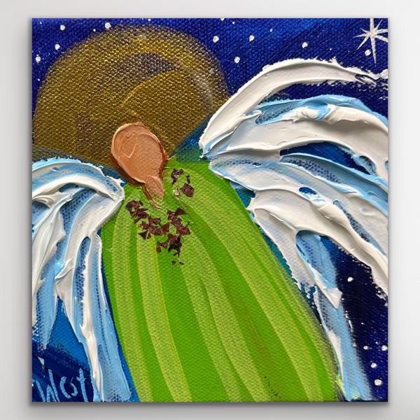 "Divine Guardian" features a lovely guardian angel designed exclusively for the holiday season. Adorned with a rose gold collar and a stunning two-toned green robe, this unique painting shines with the divine radiance of its golden halo. You will own the original piece, not a reproduction, to cherish for years to come. Whether for yourself or a loved one, this piece is sure to bring joy to your holiday and every day!