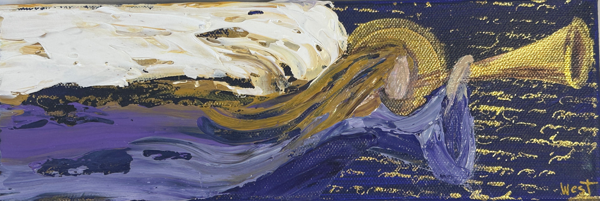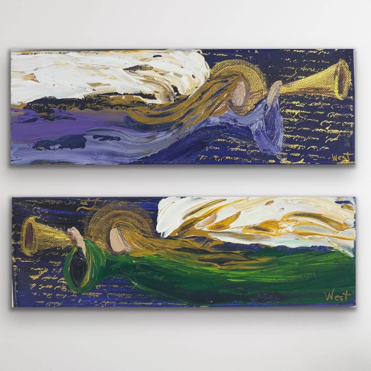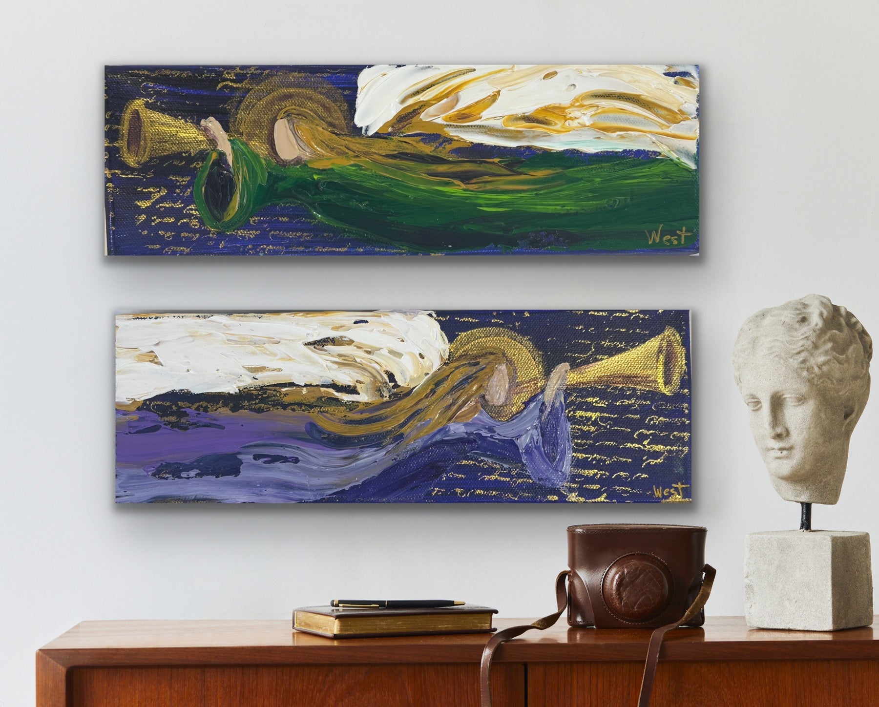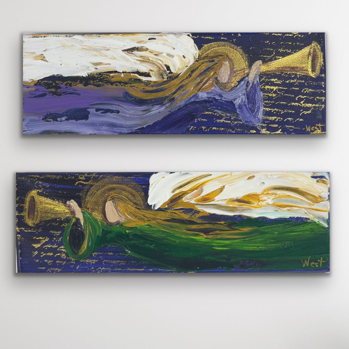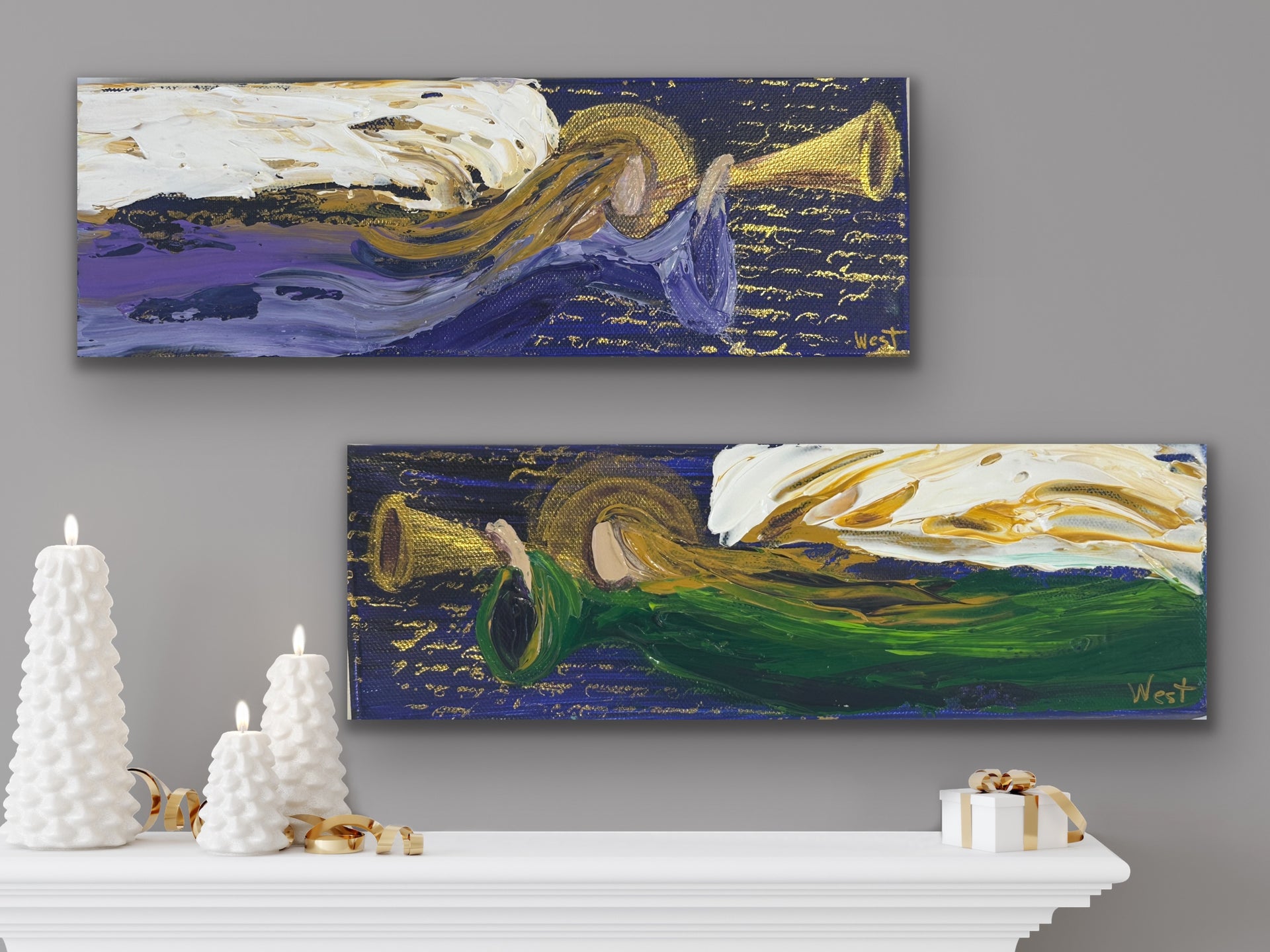 This pair of herald angels was created to evoke a sense of peace and divine presence just in time for the holiday season. With thick, textured wings and flowing gowns—one in deep purple, the other in vibrant green—they stand against a rich blue background, each holding a golden trumpet. The background features subtle gold handwriting, like whispers of ancient messages, adding to the mystery of their message.