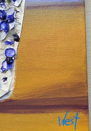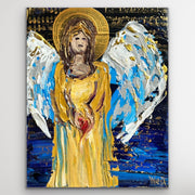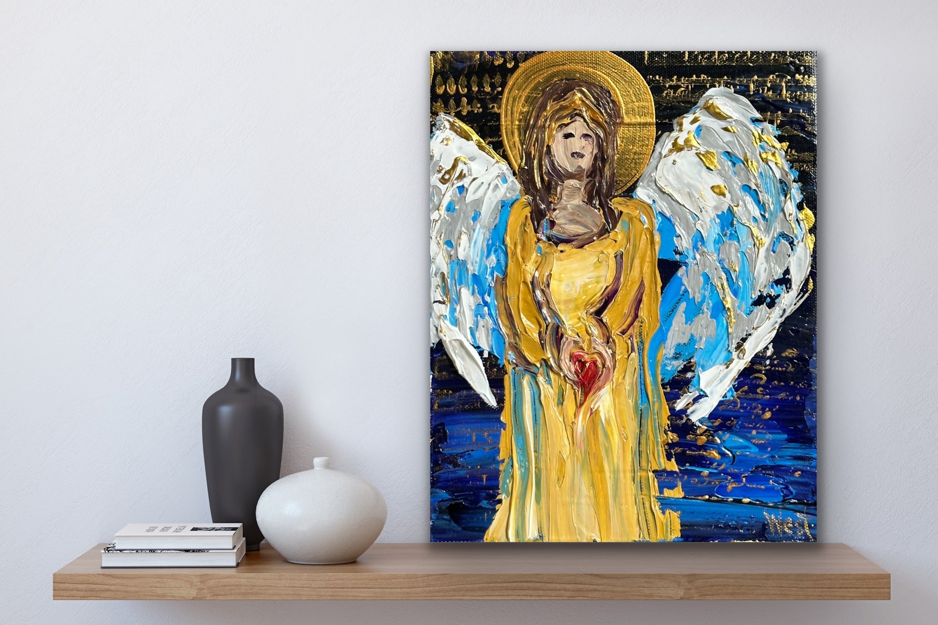"Wings Around My Heart" is a piece that came from a place of quiet reflection. This lovely Angel, with thick, textured wings, gently holds a heart, its warmth captured in the layers of paint. A deep blue background contrasts with delicate gold details—musical notes and handwritten script—that add a subtle, ethereal touch. The combination of soft colors and rich texture gives the piece a peaceful, protective feeling. It was a joy to create, hoping it conveys both serenity and love.