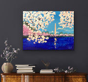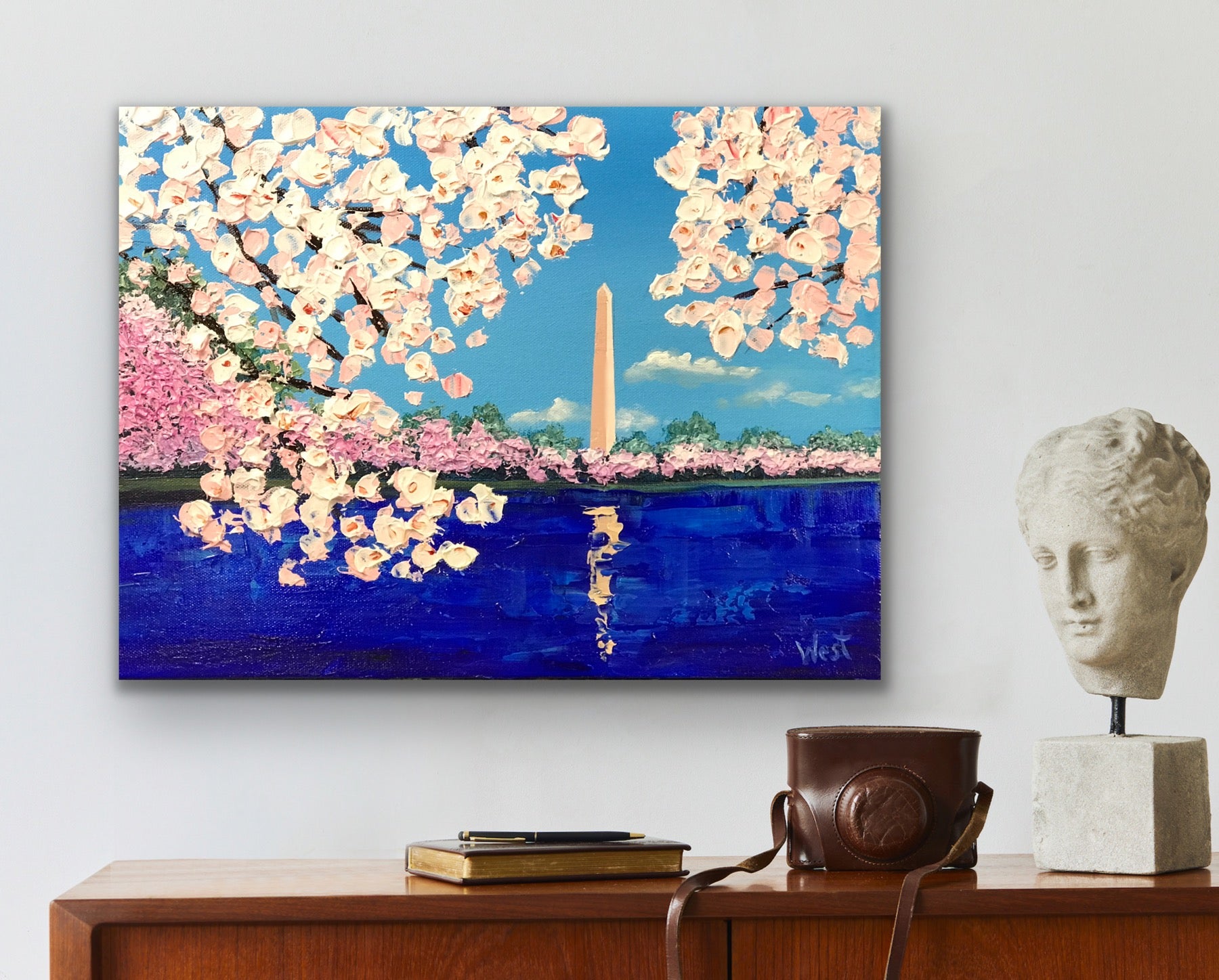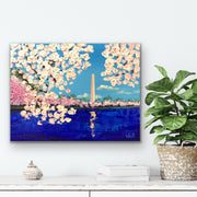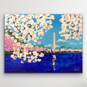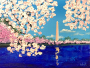 The blooms are painted with thick, textured strokes, their soft pinks and whites set against a clear blue sky. The blossoms seem to lean toward the reflecting pool below, where the monument’s image shimmers in deep, vibrant blues. This piece is about the feeling of standing there in person — the sense of peace, renewal, and quiet awe that comes when beauty and history meet in the heart of the nation’s capital.