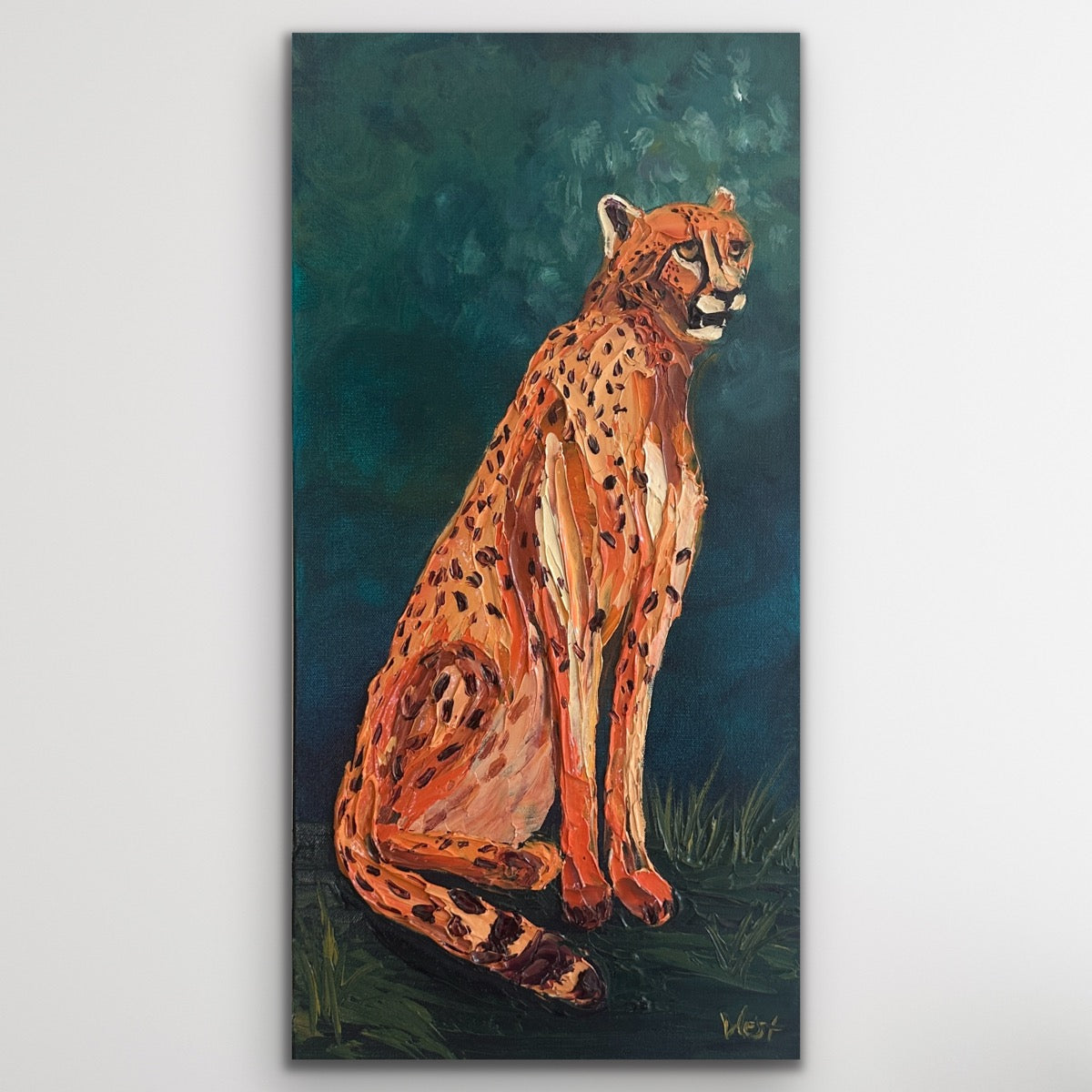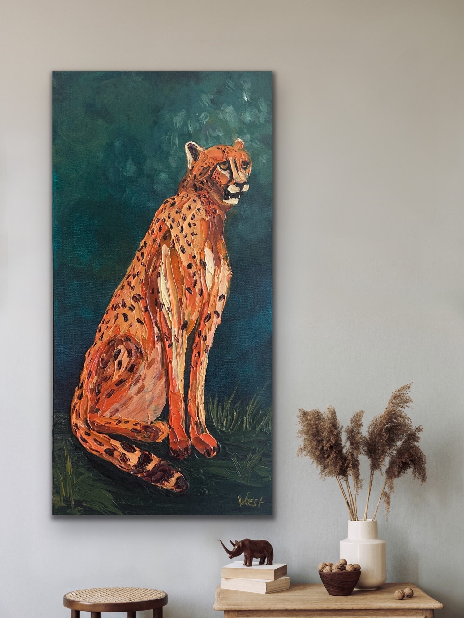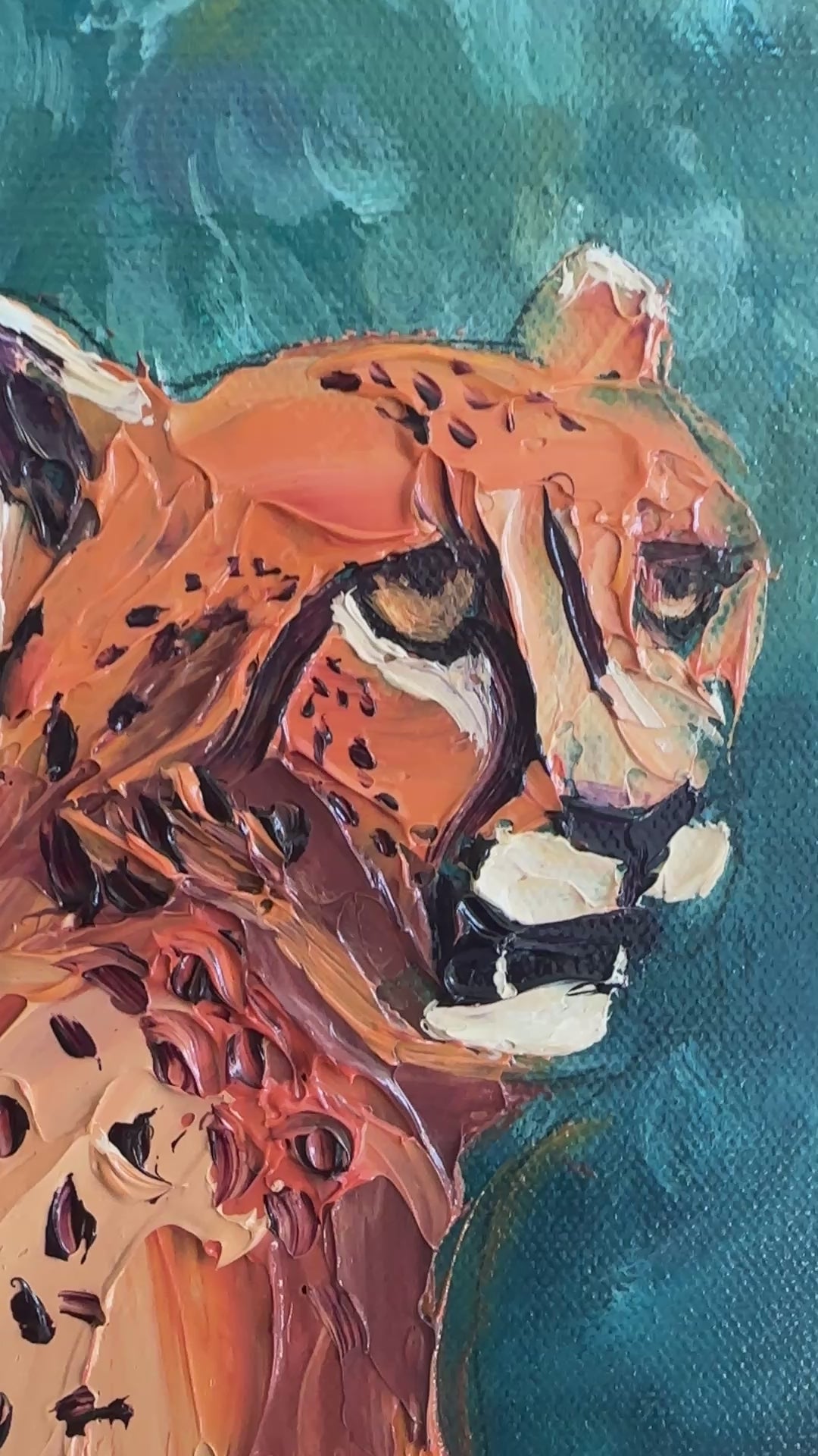 This piece gave me the chance to focus on one of the things I love most—using texture to bring an animal to life. I wanted to capture the cheetah’s alert energy, the elegance of his posture, and the beautiful rhythm of those spotted patterns across his fur. The thick strokes helped me suggest both the softness of the coat and the tension of a wild animal sitting perfectly still, yet seeming ready to move at any moment.