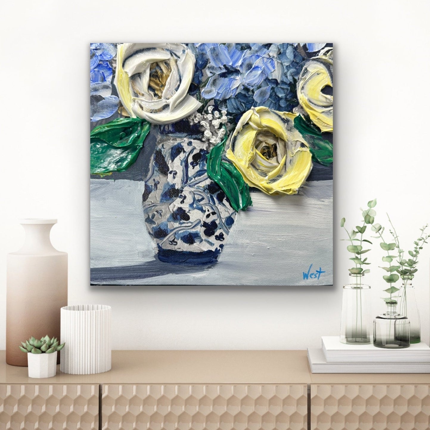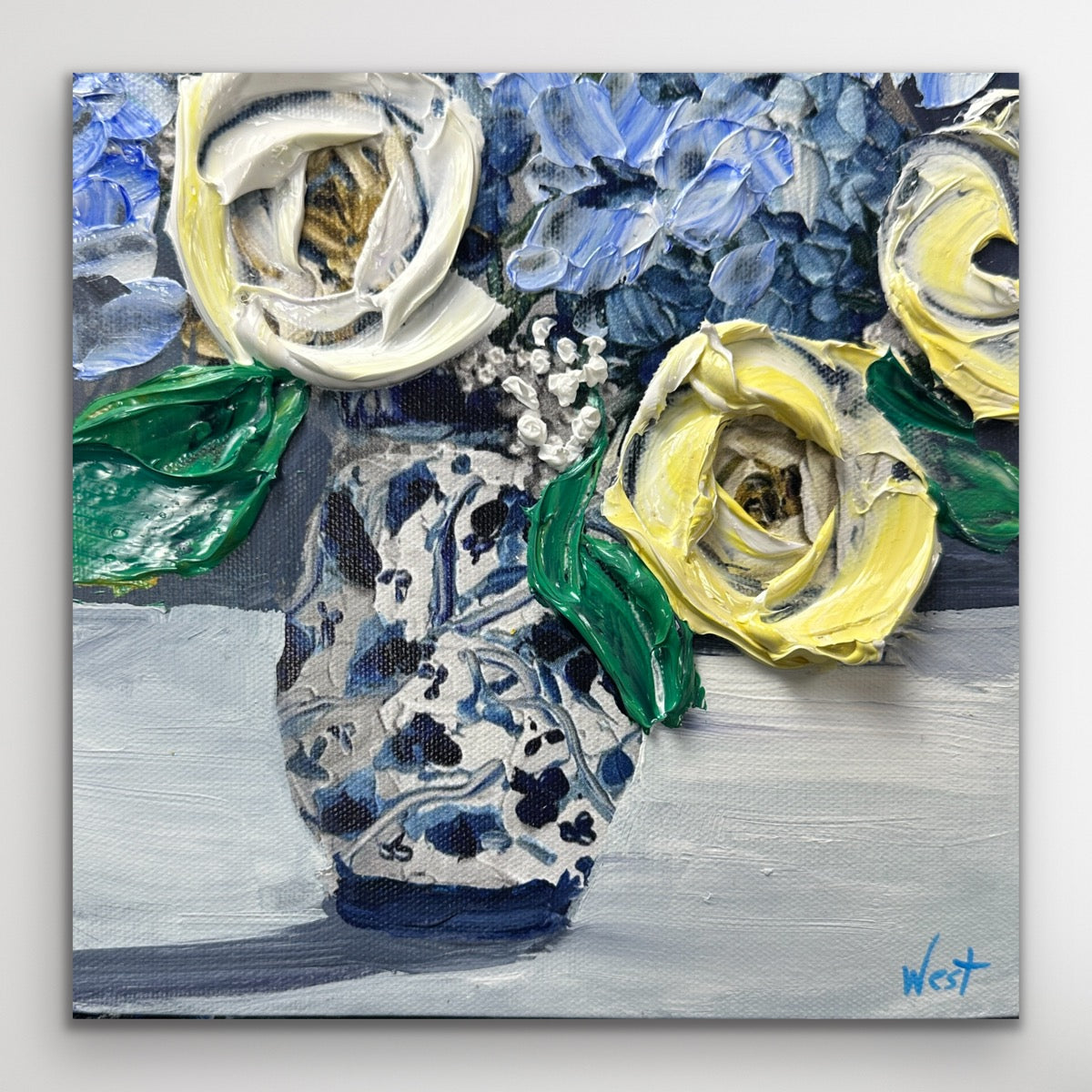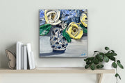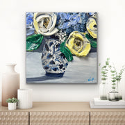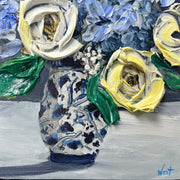 Soft yellow and ivory roses bloom beside delicate blue hydrangeas, all gathered in a timeless patterned ginger jar vase. The palette is serene yet full of life—cool blues, creamy whites, and fresh greens dancing together in thick, textured strokes.