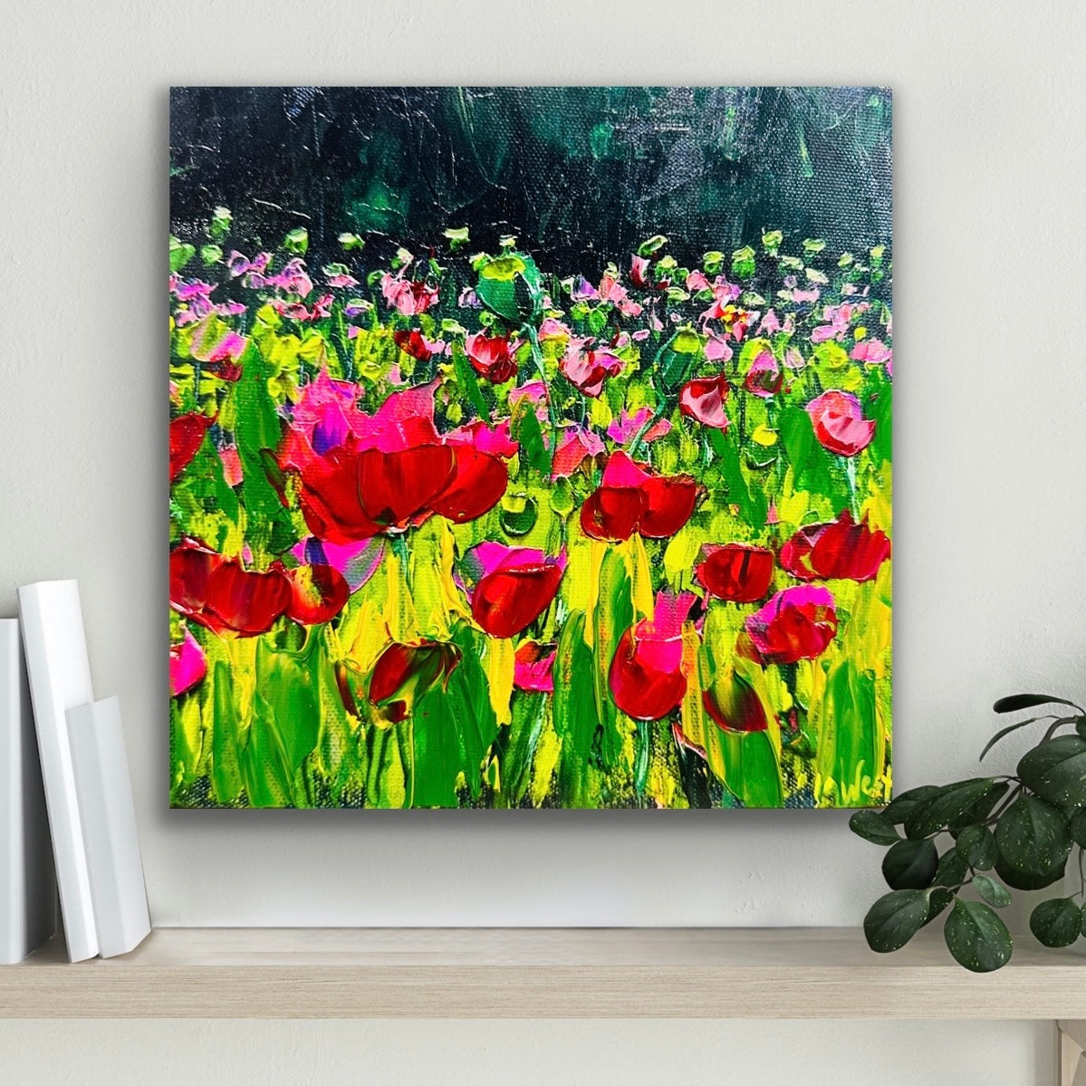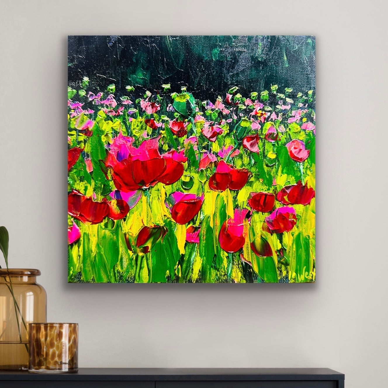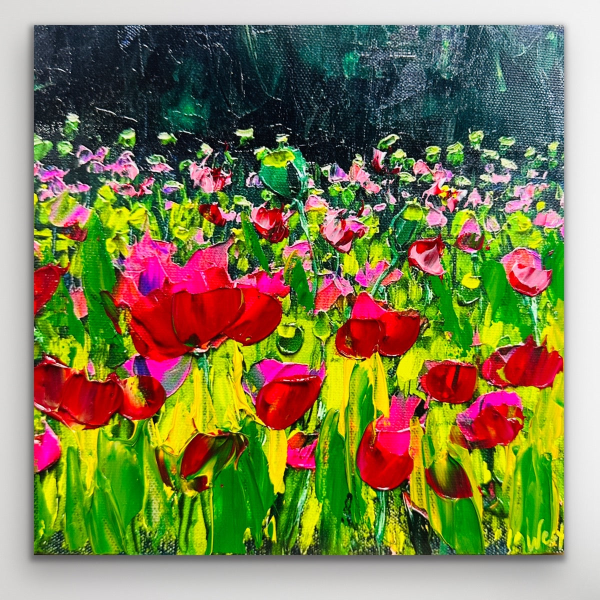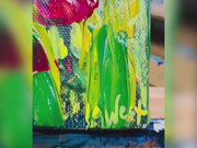 "Fuchsia Dream" is a joyful scene where fuchsia tulips play among lush, bright green fields, against a textured backdrop in shades of deep green. This painting will bring happiness to your space, turning it into a peaceful place filled with cheerful, dreamy vibes. This signed limited edition hand-embellished reproduction is enhanced by me, making each one one-of-a-kind. I hope you love the lush texture and color as much as I do.