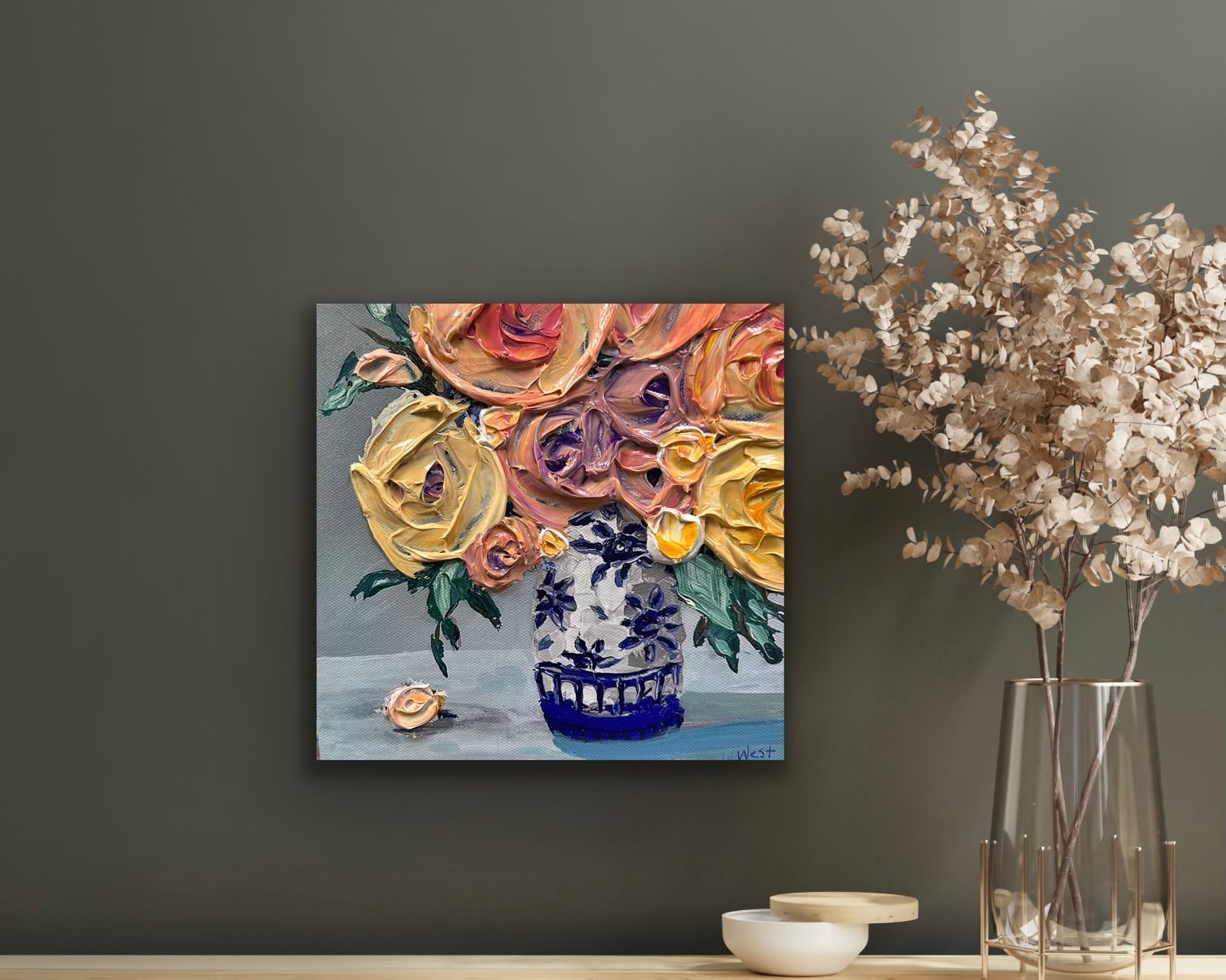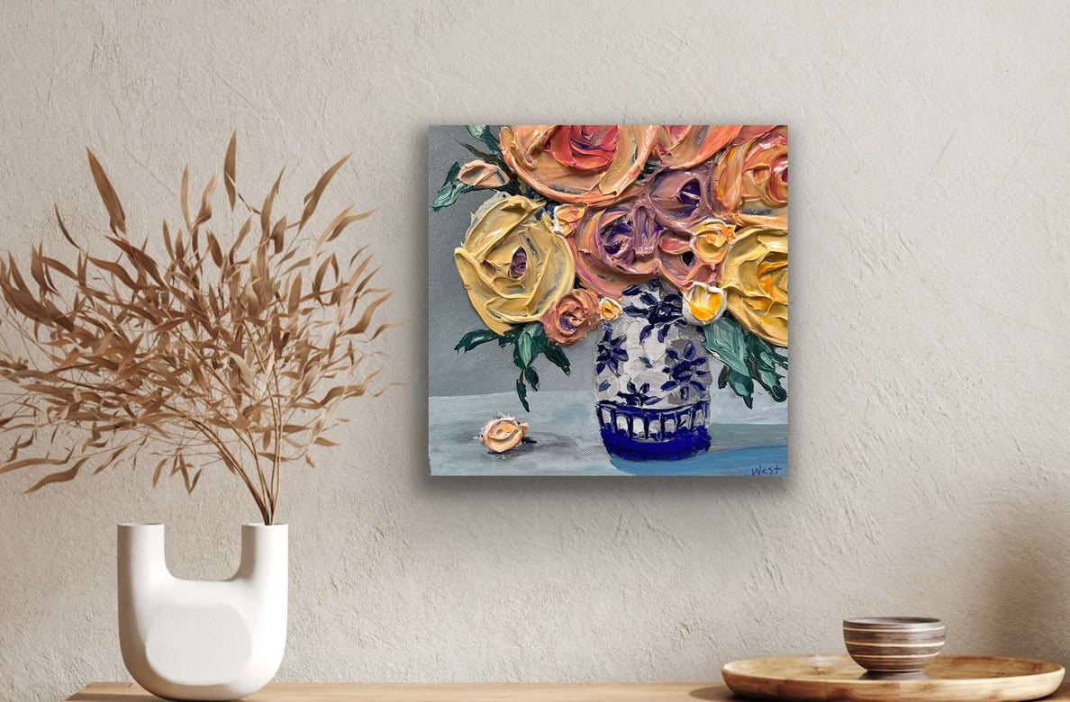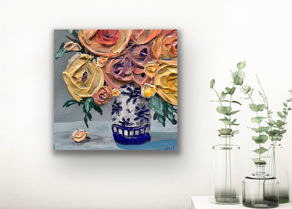 "Ginger Jar Blossoms" features highly textured and vibrant rose blossoms that are practically bursting free from the canvas. This signed limited edition giclee reproduction is one-of-a-kind. I hope you love the lush texture and color as much as I do.