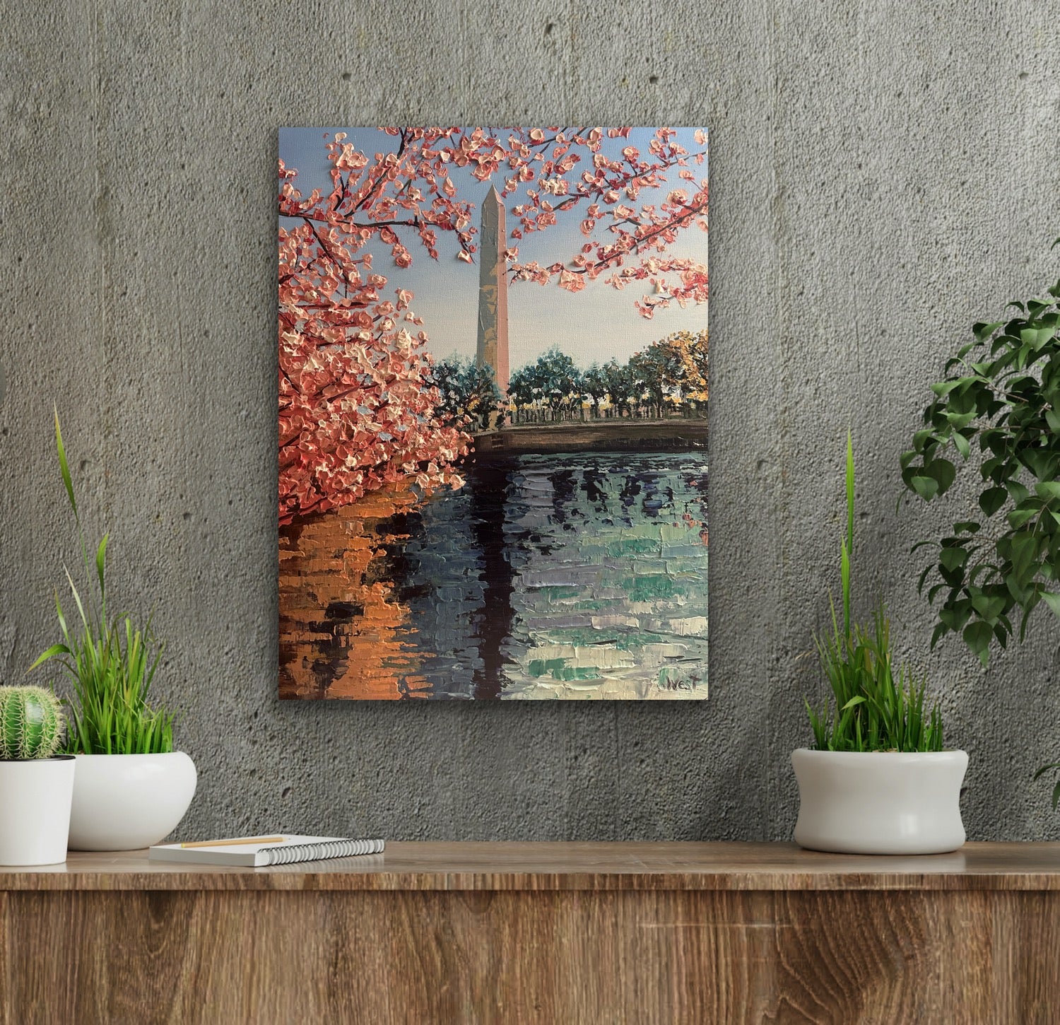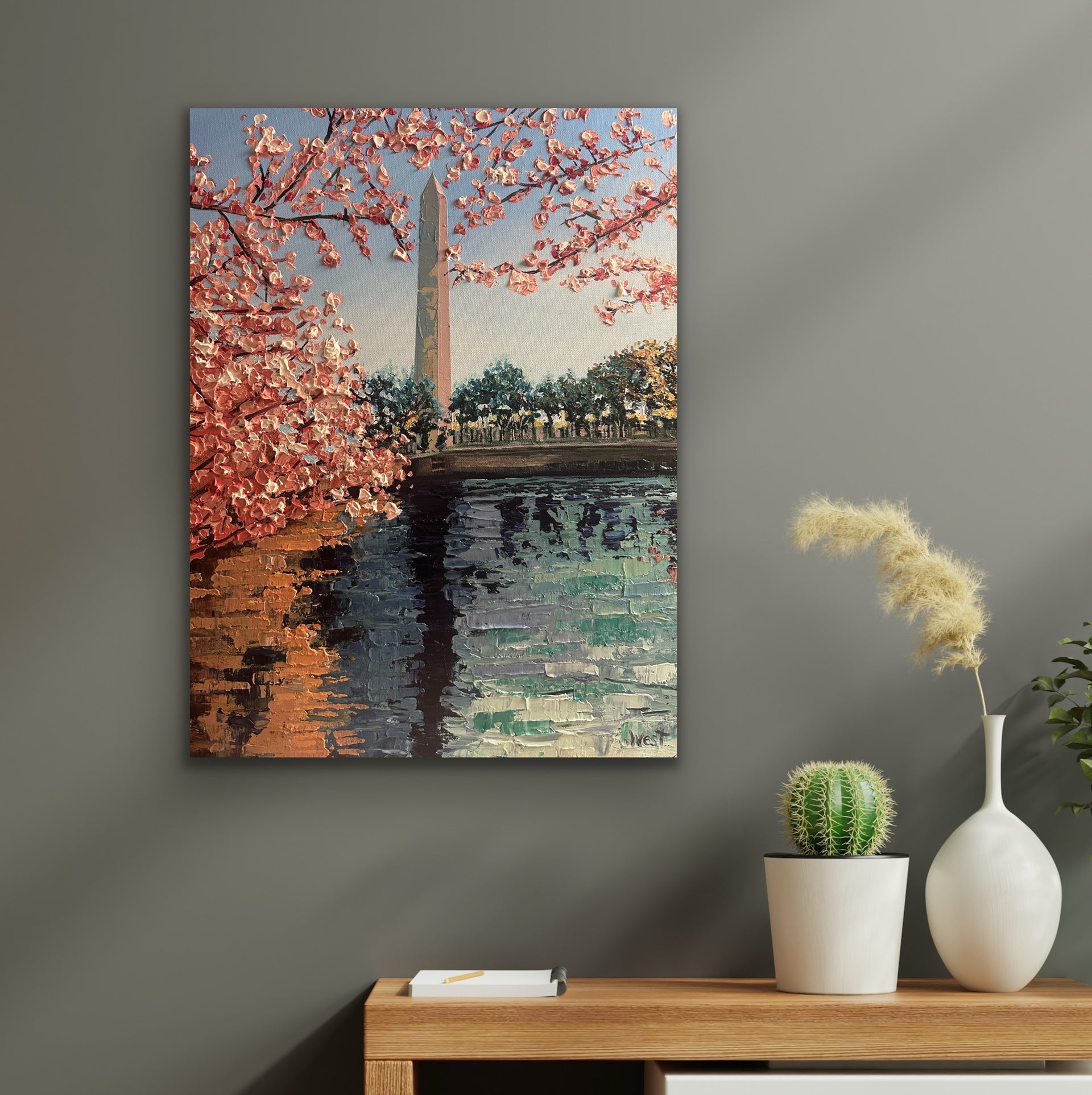 Experience the charm of springtime in Washington, D.C. with Monumental Bloom, a limited edition hand-embellished canvas print inspired by my original palette knife painting. This piece showcases the iconic Washington Monument framed by cherry blossoms at their peak—soft pink and white petals dancing in the breeze, symbolizing renewal and hope.