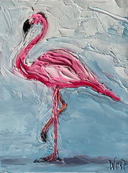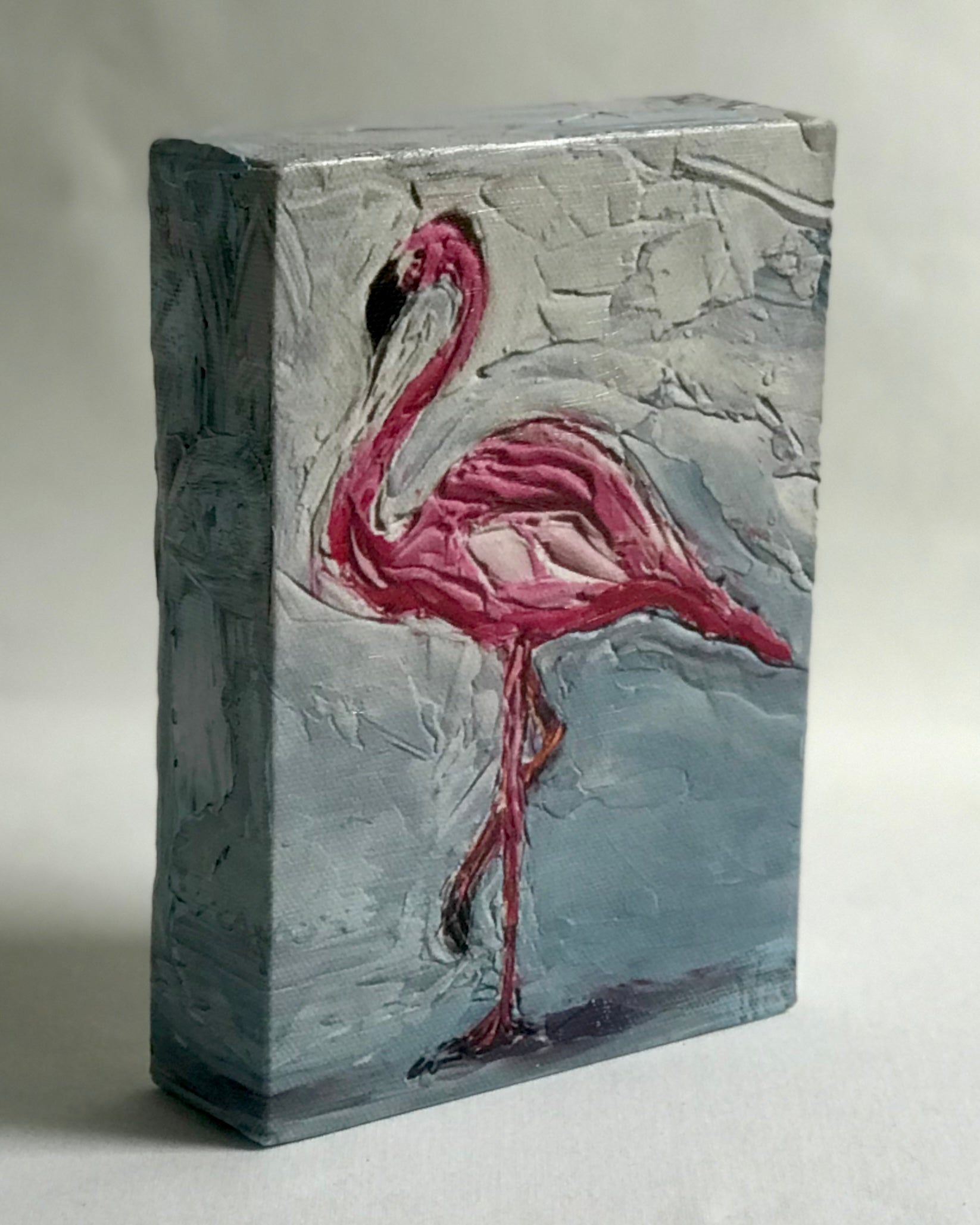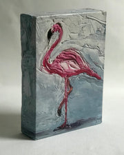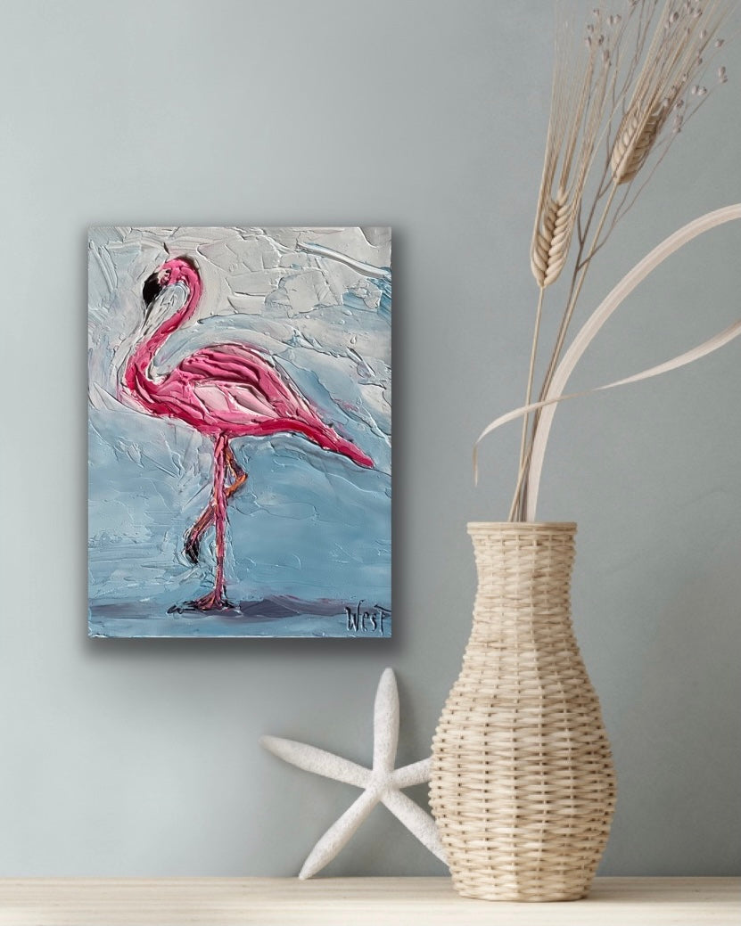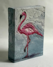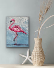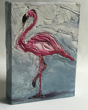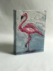 You'll love my “Flamingo Joy” - my sweet 7“ x 5“ x 1 1/2“ thick profile pink flamingo! This is a hand embellished and signed limited edition canvas reproduction of an original piece was created using acrylic paint and palette knives and texture medium.