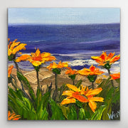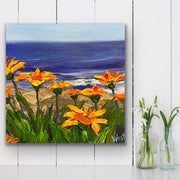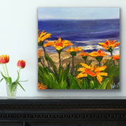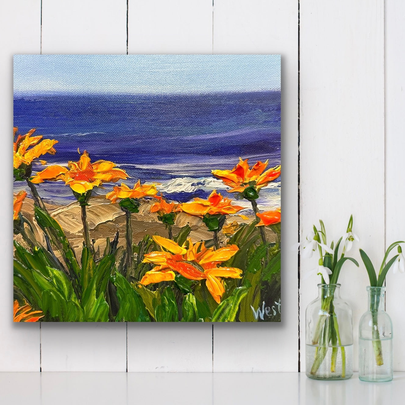 "Seaside Beauty" captures the lovely bright orange gazania cliff flowers enjoying a sunny day by the sea. You can feel the ocean breezes as you gaze on this happy scene. This signed limited edition giclee reproduction is one-of-a-kind. I hope you love the lush texture and color as much as I do.