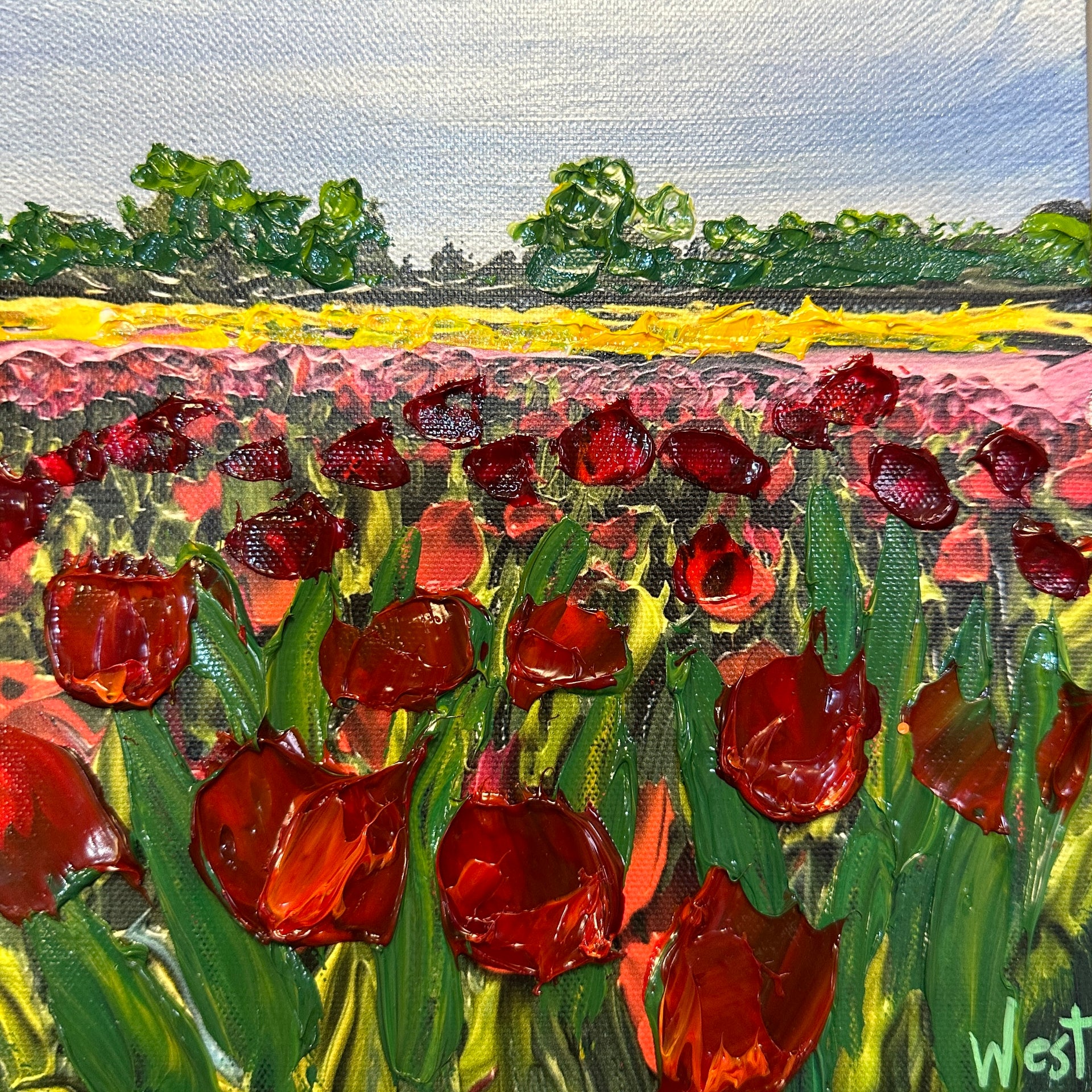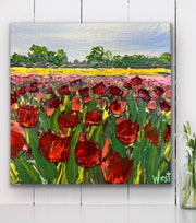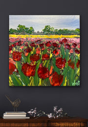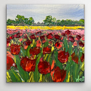 "Tulip Tapestry" invites you to step into a joyful meadow where red and pink tulips mingle with a backdrop of sunny yellow blooms and stately trees. It's a painting that radiates happiness and a dreamy charm, turning your space into a peaceful haven filled with cheerful vibes. Each brushstroke and color choice is a heartfelt creation, making this signed limited edition giclee reproduction one-of-a-kind. The rich textures and vibrant colors of "Tulip Tapestry" promise to fill your surroundings with a warm and friendly touch, celebrating the simple yet beautiful moments in nature.