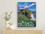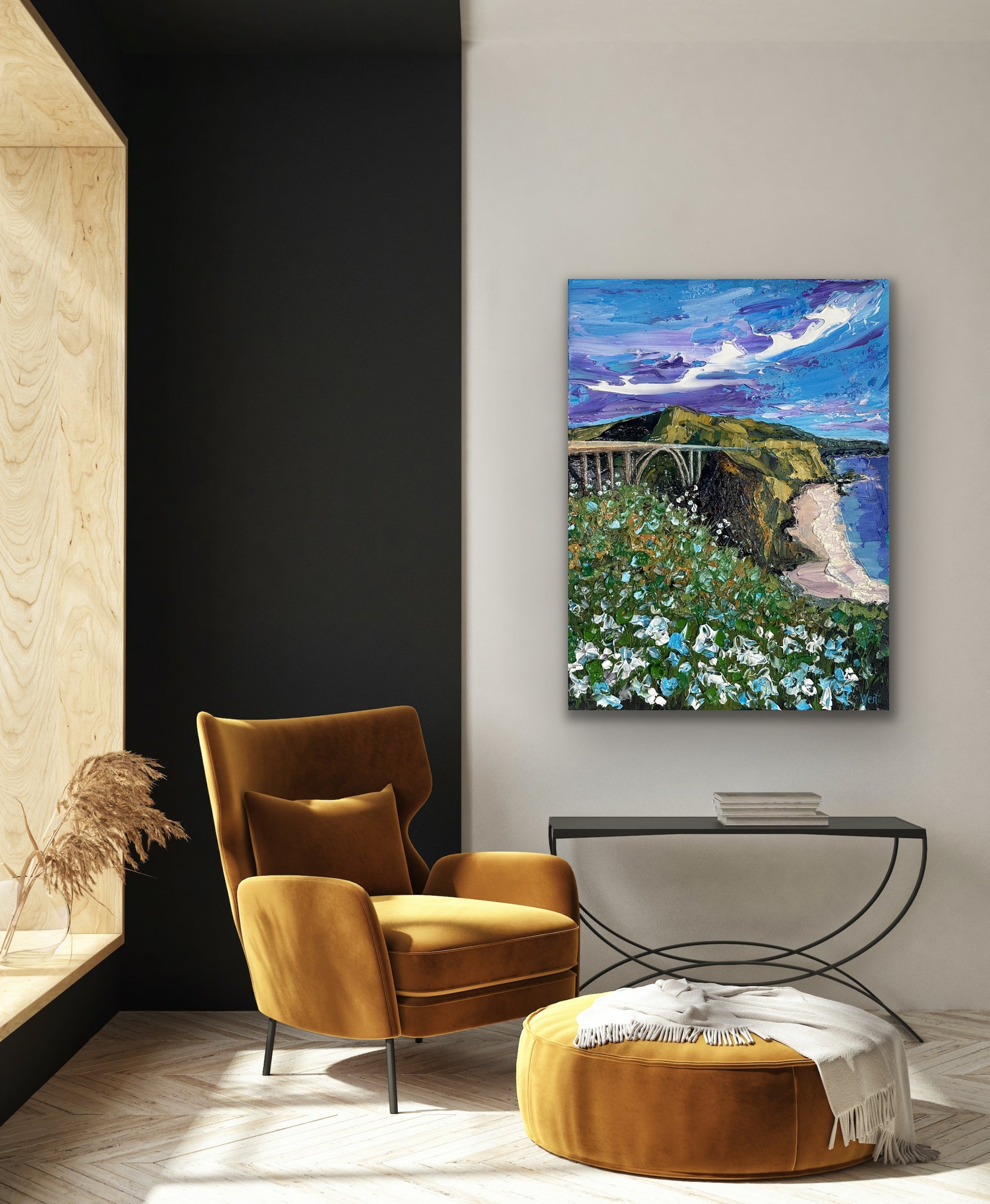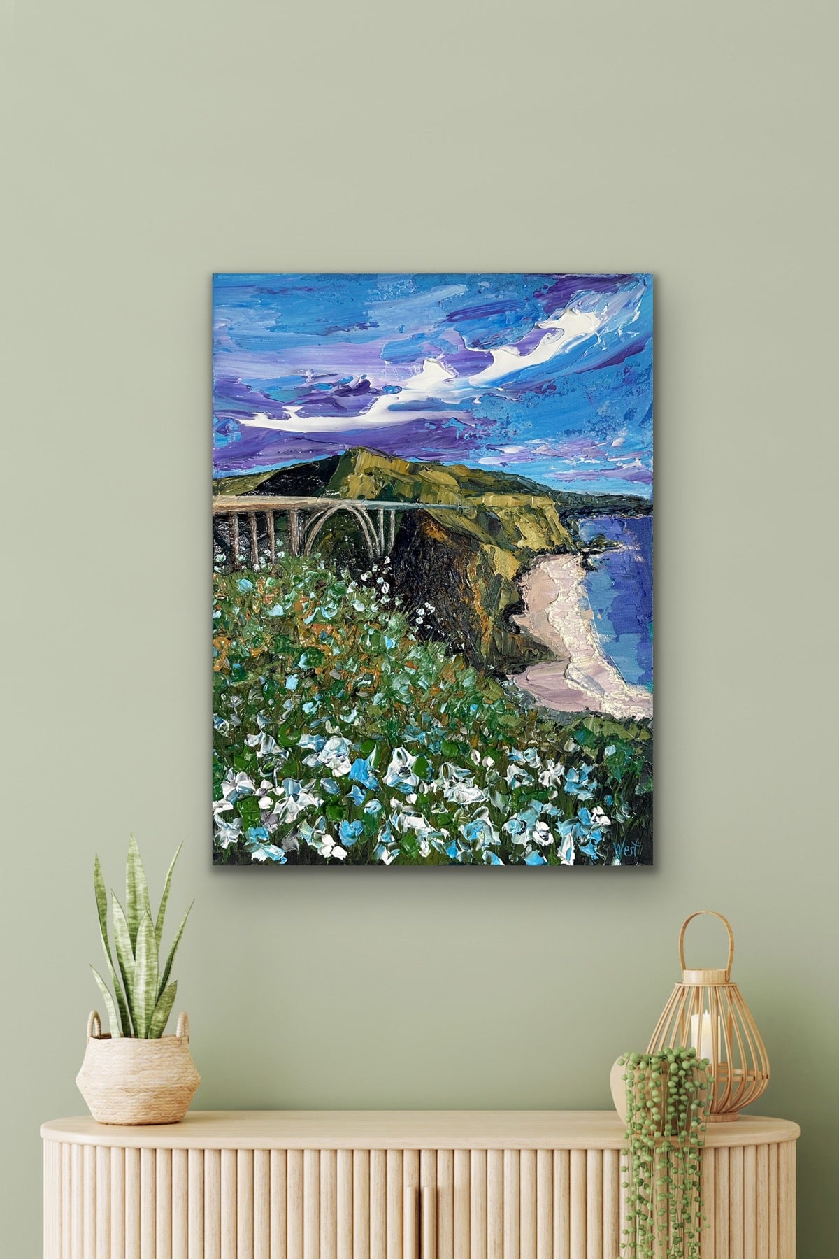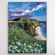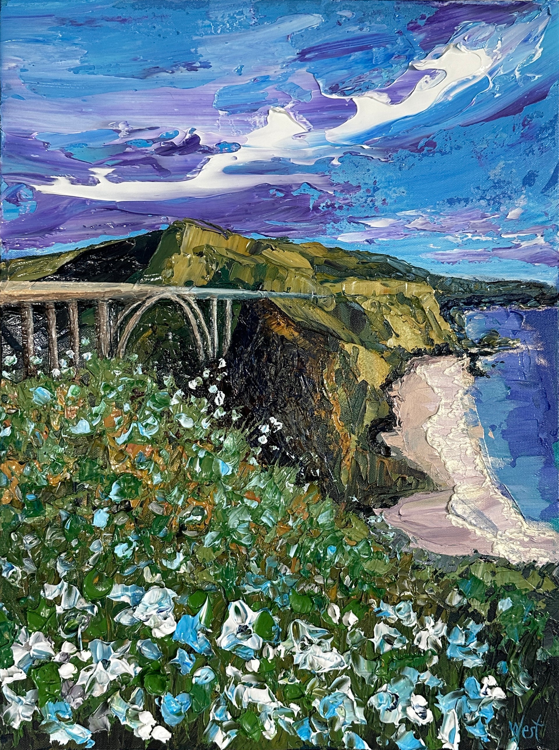 This piece captures the iconic Bixby Bridge in Big Sur, one of California’s most breathtaking coastal landmarks. I was inspired by the way the wildflowers bloom with such abandon in spring—blanketing the cliffs in soft whites and blues—while the sky above dances with dramatic purples and sweeping clouds.