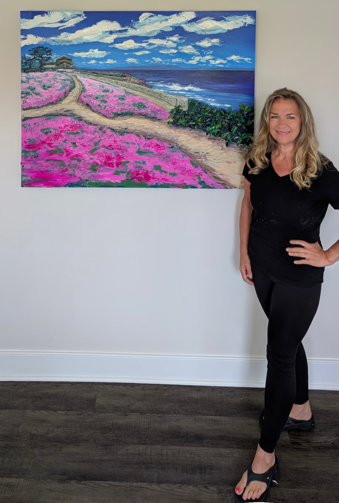 In Magic Bloom by the Pacific, I used thick palette knife strokes to evoke the lush texture of the ice plant, framing the meandering path that leads toward the deep, sparkling blue of the Pacific. The clouds above dance with movement, echoing the waves as they meet the shore.