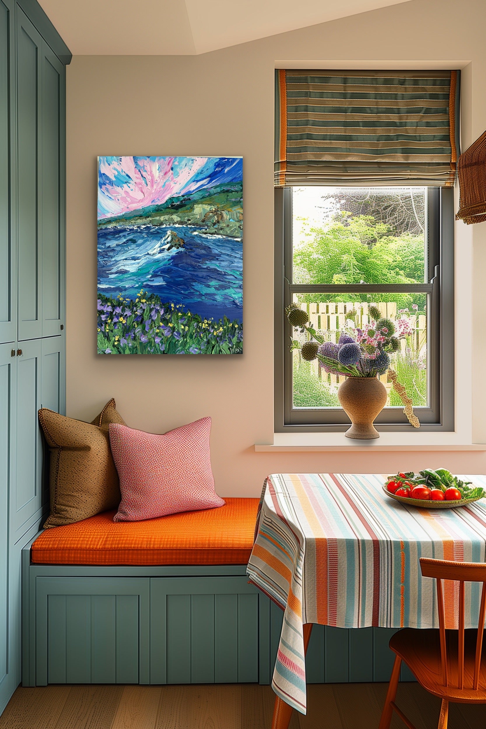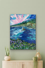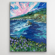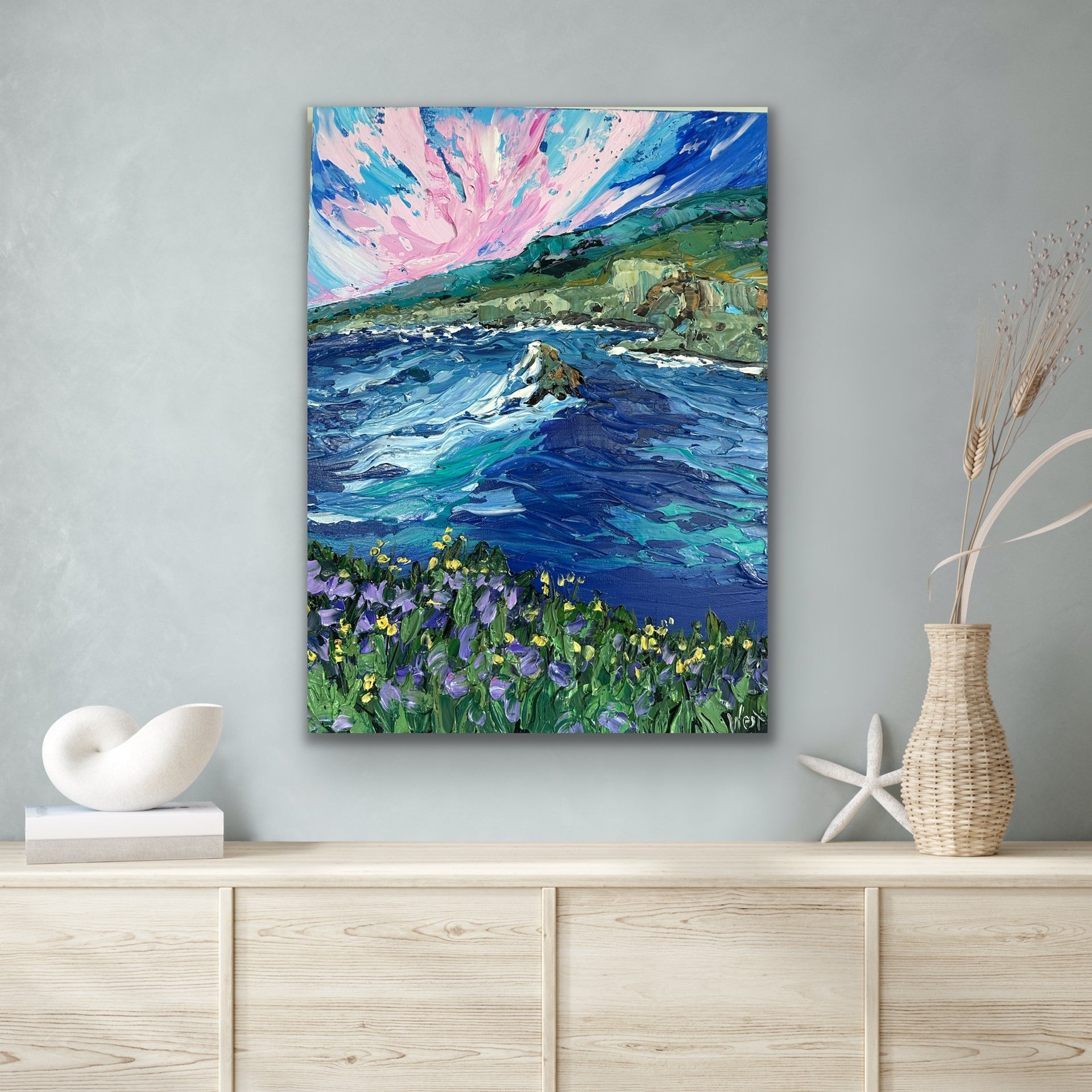 Inspired by the breathtaking coastal views of Carmel-by-the-Sea, this piece captures the wild beauty of the Pacific as waves crash against the rugged cliffs under a brilliant, ever-changing sky. That day, the clouds swirled in joyful motion—blushing pinks and blues that felt like a dance overhead.