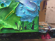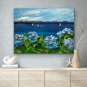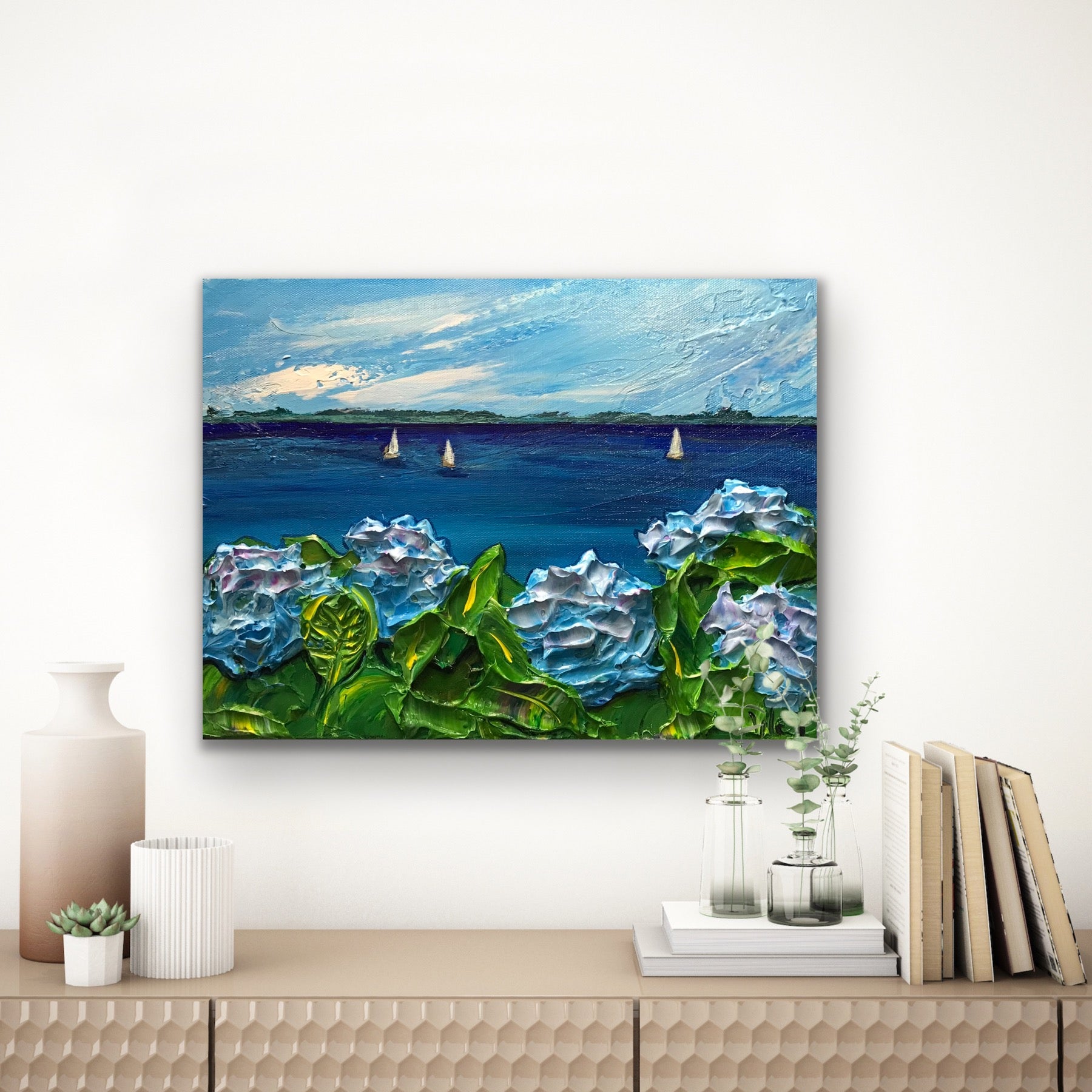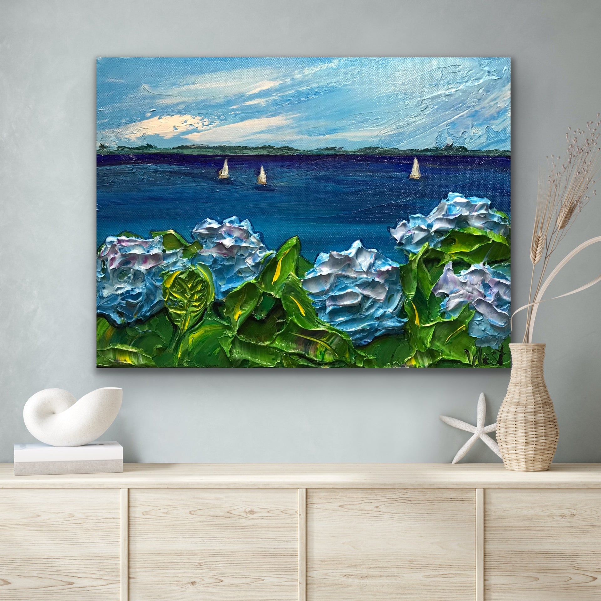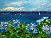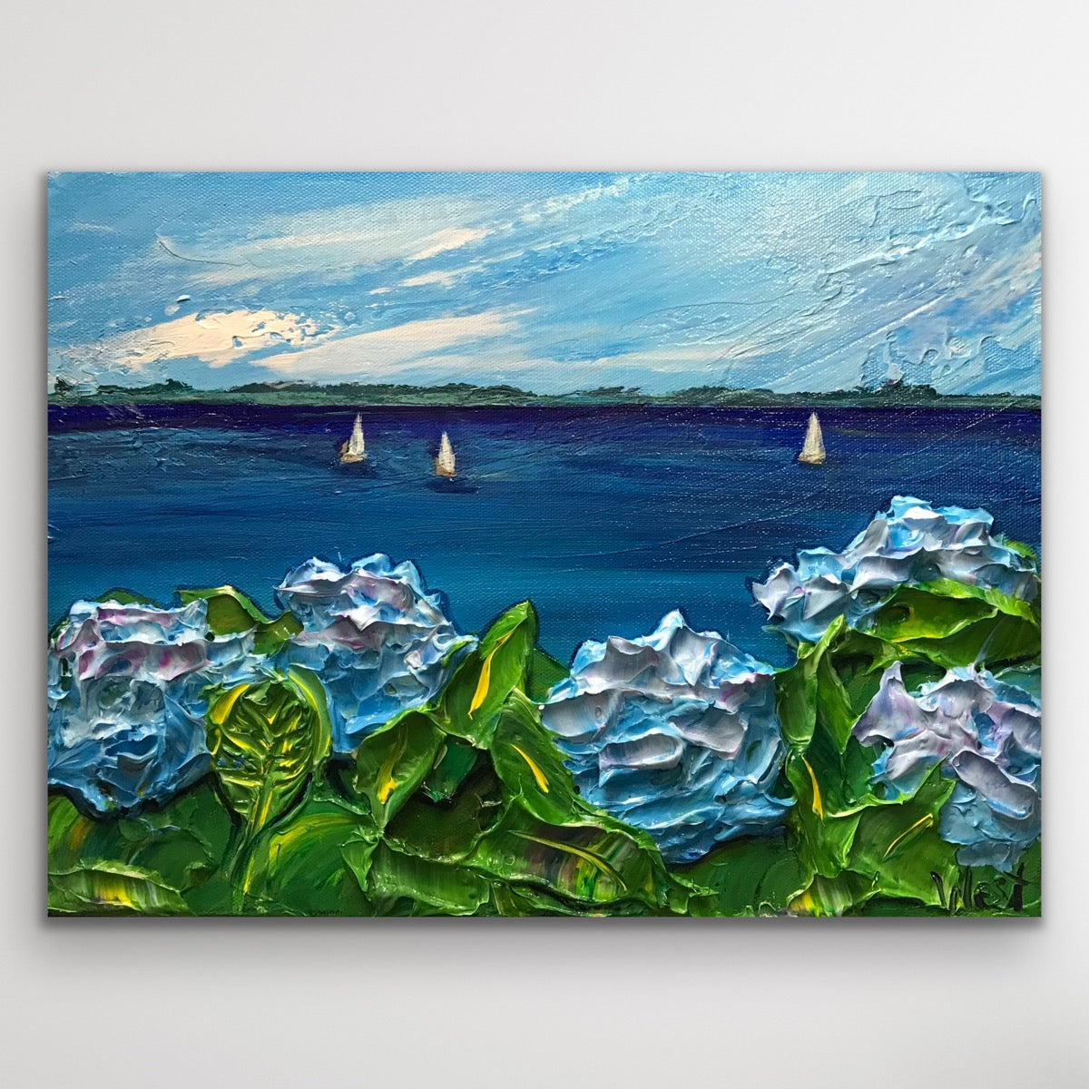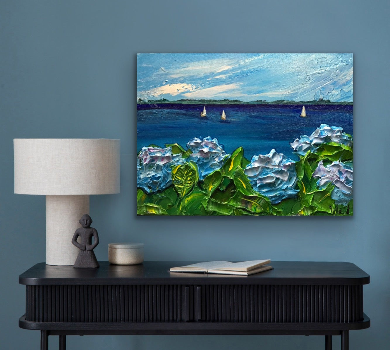 This palette knife impasto painting celebrates the timeless beauty of summer by the sea. Thick, textured hydrangeas bloom in the foreground, their soft blues and violets recalling the classic coastal gardens so often found in Northeast harbors. Beyond them, white sails drift across a tranquil bay, glowing against distant hills and sky.