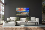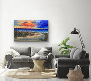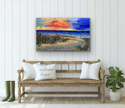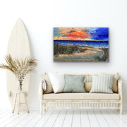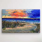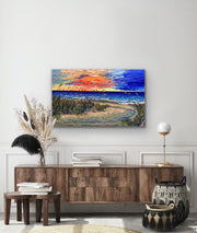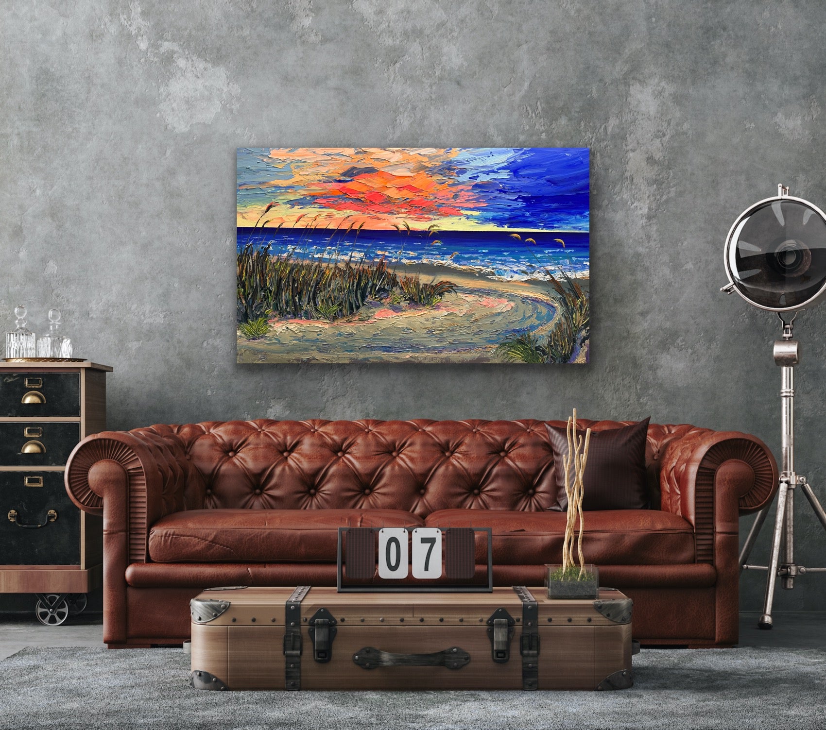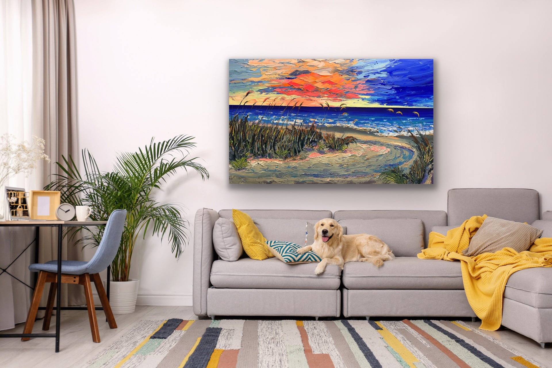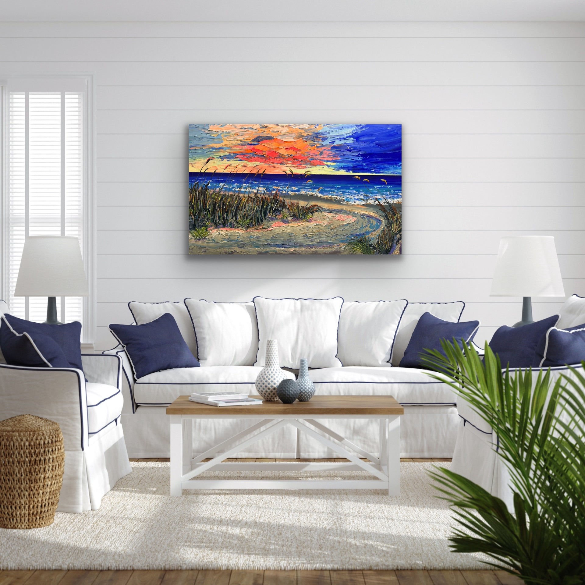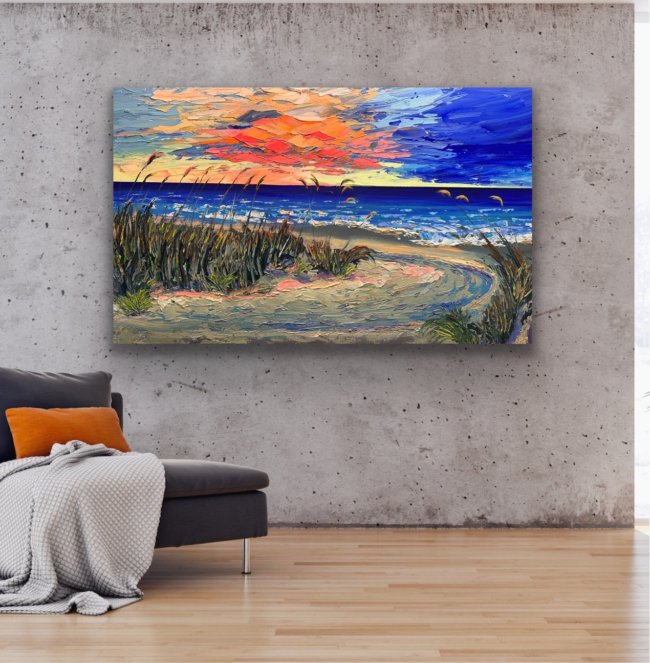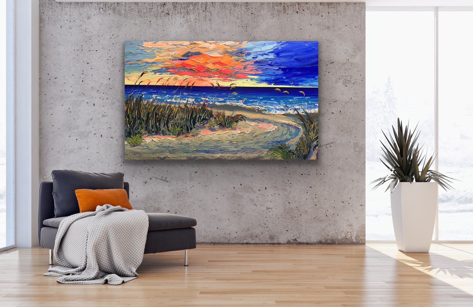 If you are looking for the perfect beach painting to hang over your sofa, look no further than "Luminous Morning"! This large scale (4-feet wide!) impasto palette knife painting captures the vibrant and emotional essence of a gorgeous beach sunrise. The sky is a stunning explosion of bright oranges, yellows, pinks, and blues, blending together in a mesmerizing dance of colors that evoke feelings of joy and serenity. Thick, textured strokes of the palette knife bring the sky to life, creating a radiant and dynamic backdrop.