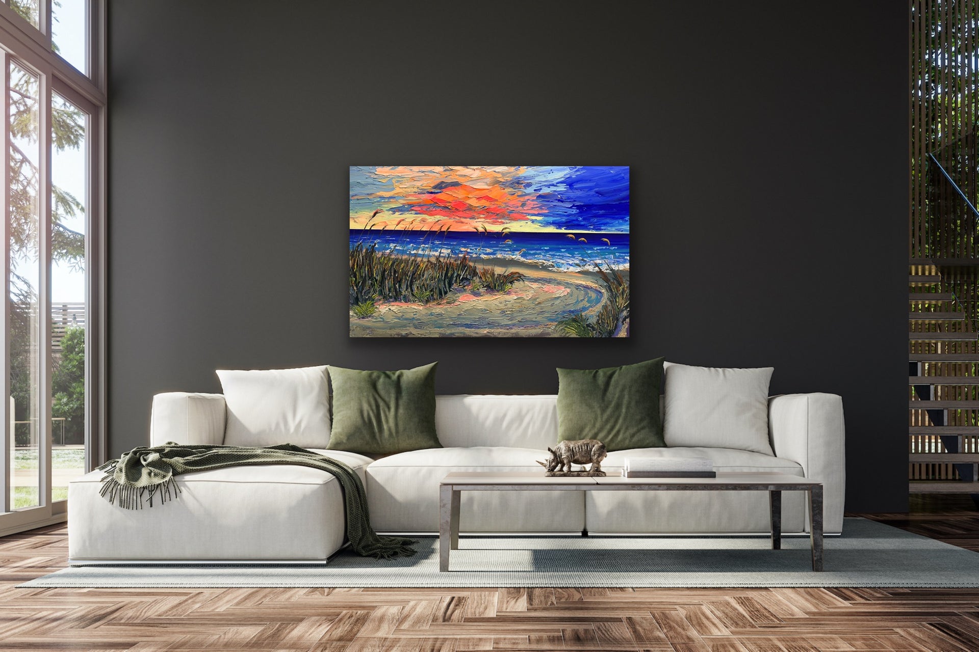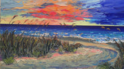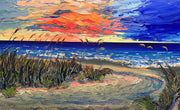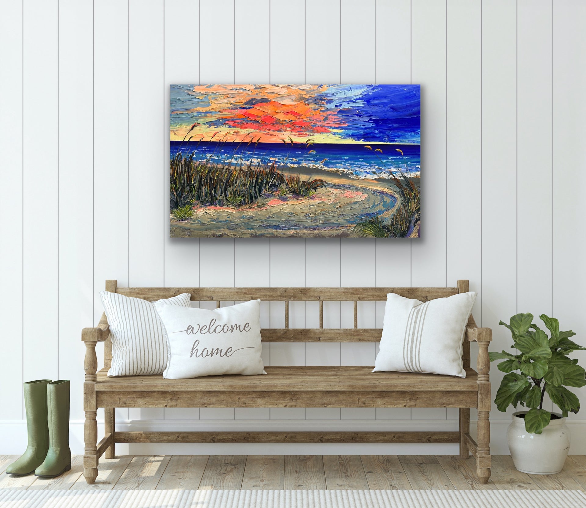 In the foreground, a beautiful pathway lined by delicate sea oats leads the viewer's eye towards the tranquil ocean. The pathway, rendered in rich, tactile layers of paint, invites you to walk down to the water's edge and experience the peacefulness of the morning. The contrast between the luminous sky and the calming blues of the ocean creates a harmonious balance, making the scene both exhilarating and soothing. "Luminous Morning" is a celebration of the beauty and emotional depth found in nature's everyday miracles. I hope you love it as much as I do!