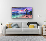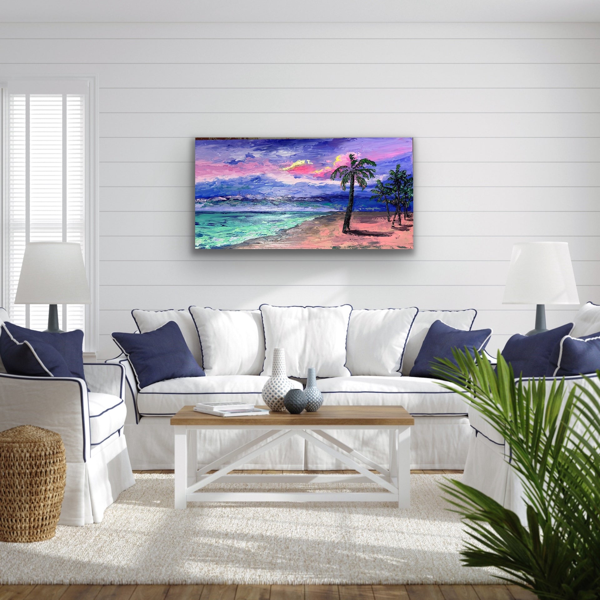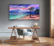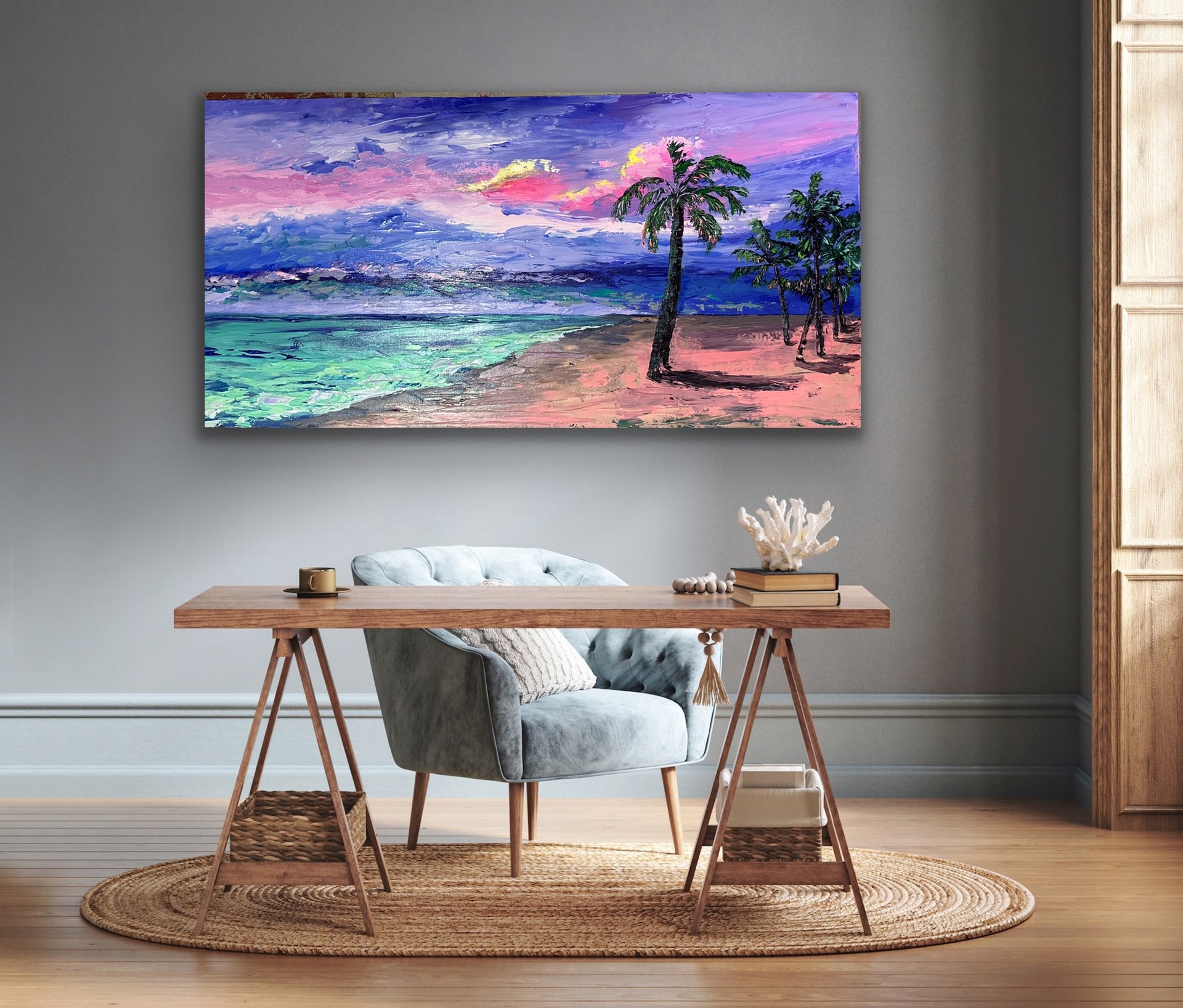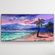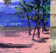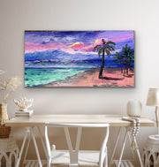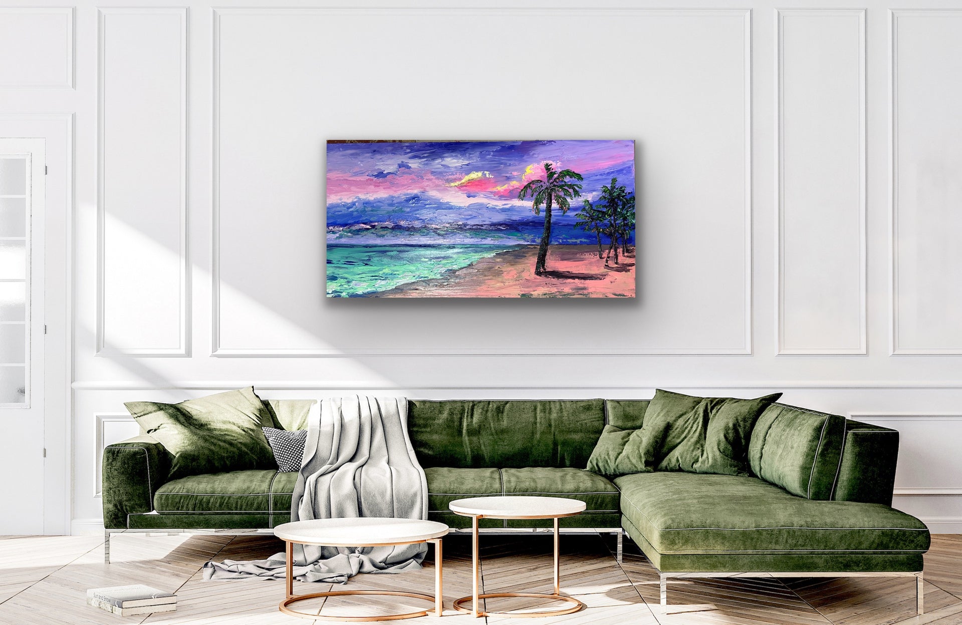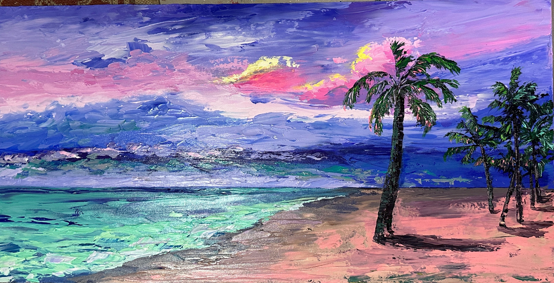 "Paradise Dreaming" is a vibrant seascape, brought to life with a palette knife impasto technique. This painting features a stunning pink beach adorned with graceful palm trees. The ocean's waters shimmer with hints of blue, reflecting the kaleidoscope of colors above. The sky features a mesmerizing tapestry of billowing clouds, swirling in shades of blue, pink, purple, and turquoise, all creating a dreamlike atmosphere. The bold and dynamic textures of the palette knife technique enhance the vividness and depth of this tropical paradise, inviting viewers to immerse themselves in its serene and colorful beauty. I hope it brings peace and joy!