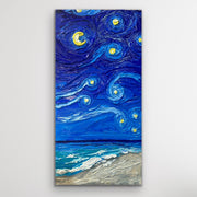 A luminous moon anchors the scene, its soft light spilling across the sky and casting shimmering reflections onto the water below. The beach, a narrow strip at the bottom of the painting, is calm and subdued, letting the celestial expanse above steal the spotlight. Gentle, foamy waves roll to the shore in delicate strokes, mirroring the sky’s glow in silvers and soft blues.