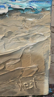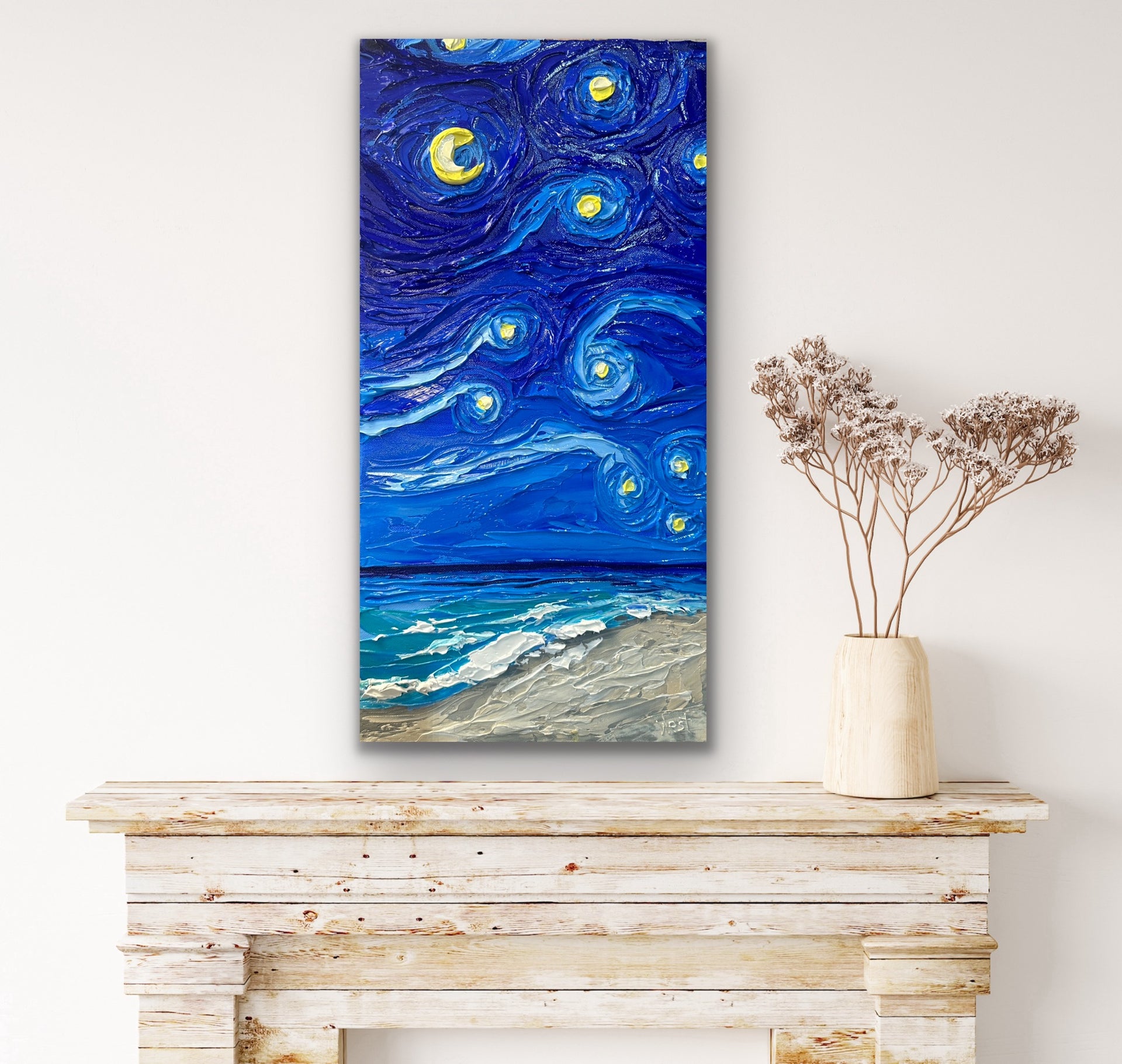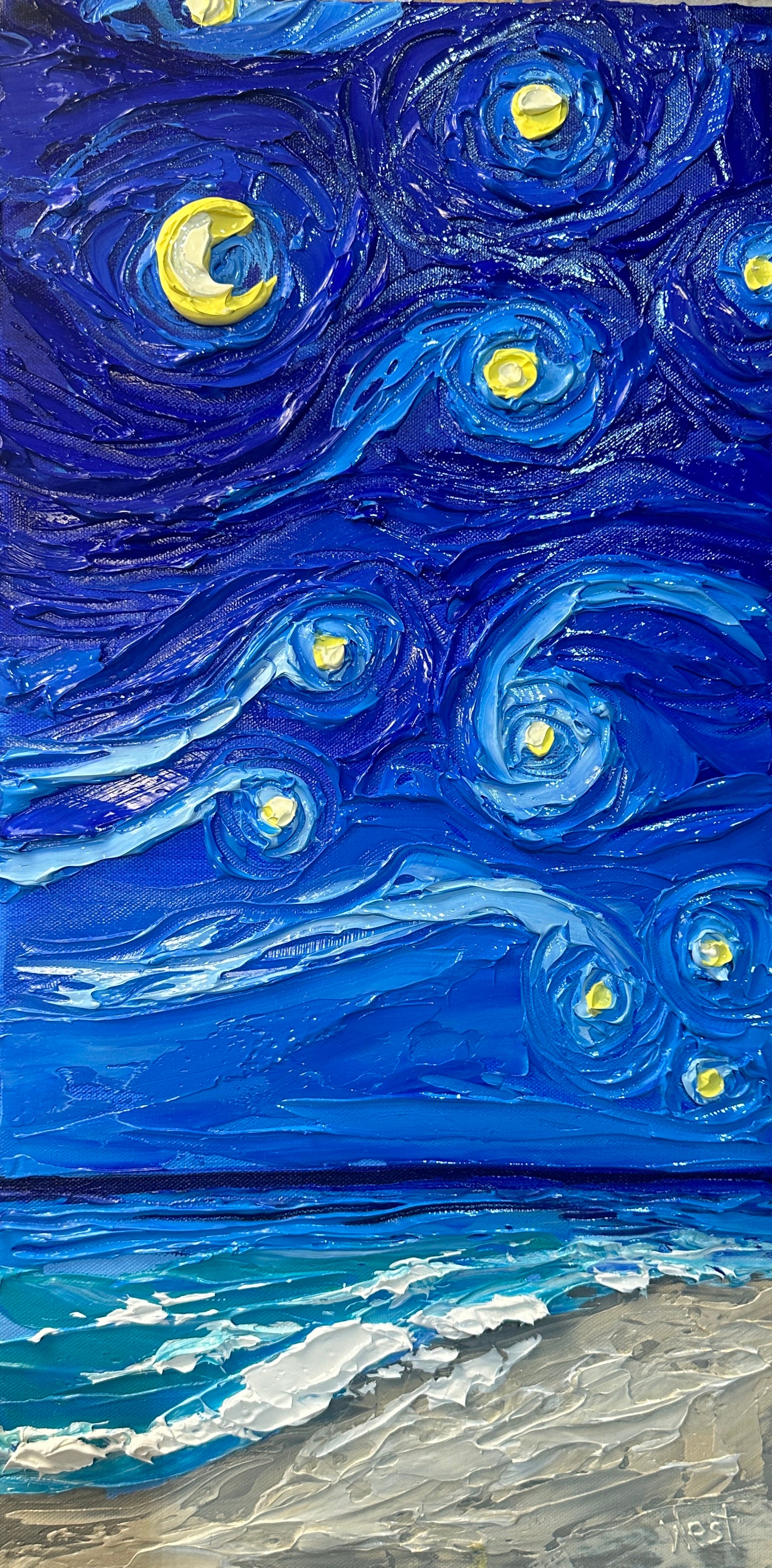 In “Where the Stars Meet the Sea, the vast, swirling sky takes center stage, filling most of the canvas with a vibrant, cosmic dance. Thick, impasto strokes bring a Van Gogh-inspired energy to the heavens, with deep blues, indigos, and purples weaving together, dotted by glowing stars. The stars, painted with layers of radiant white and golden yellow, pulse across the sky, each one thickly textured to feel almost within reach.