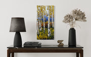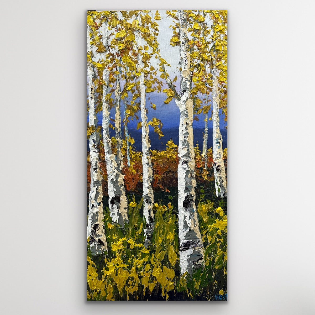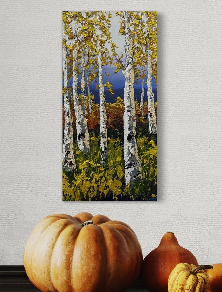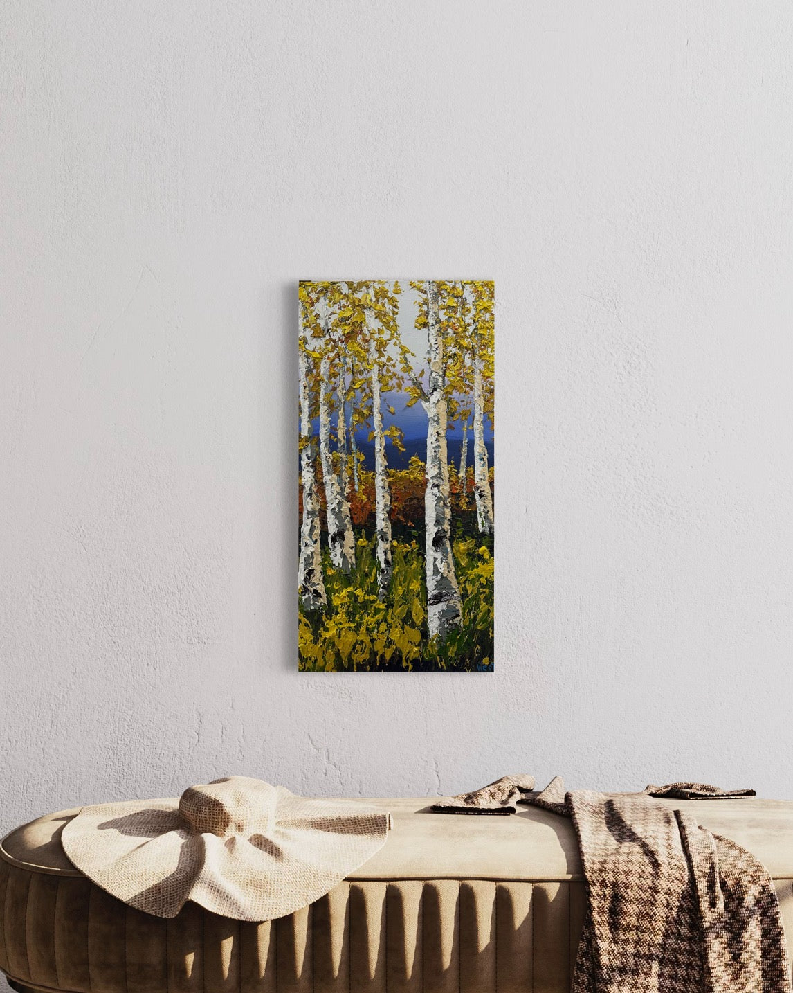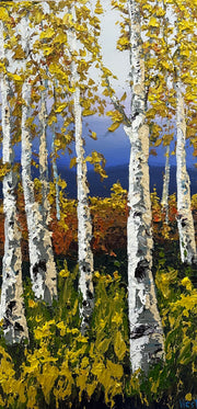 "Autumn Serenity" captures a beautiful scene of thickly textured tall white trees just as the leaves are falling. Set against a stunning backdrop of blue-ridged mountains, the vibrant beauty of deep yellow leaves both on the trees as well as scattered on the forest floor will brighten any room.