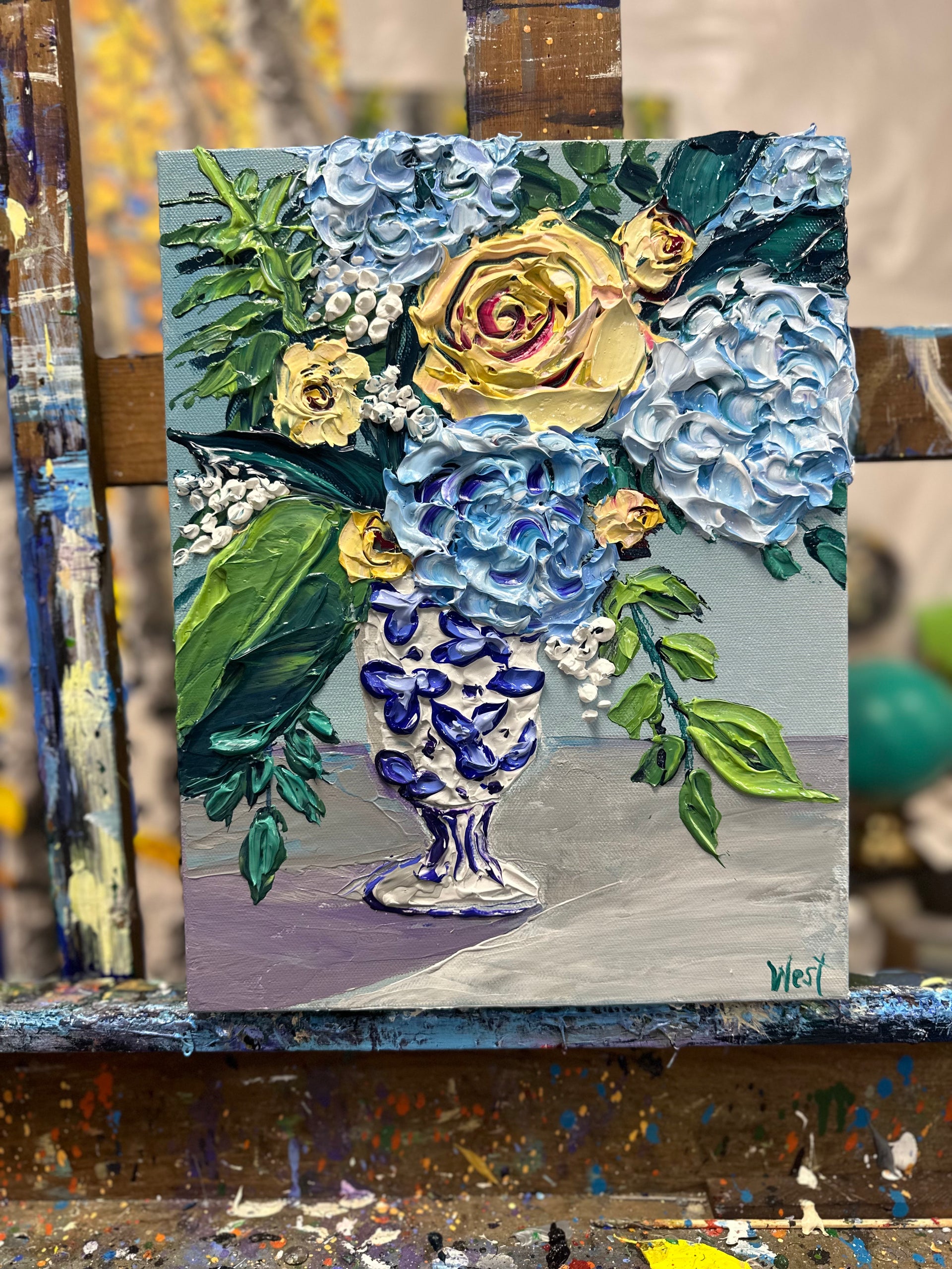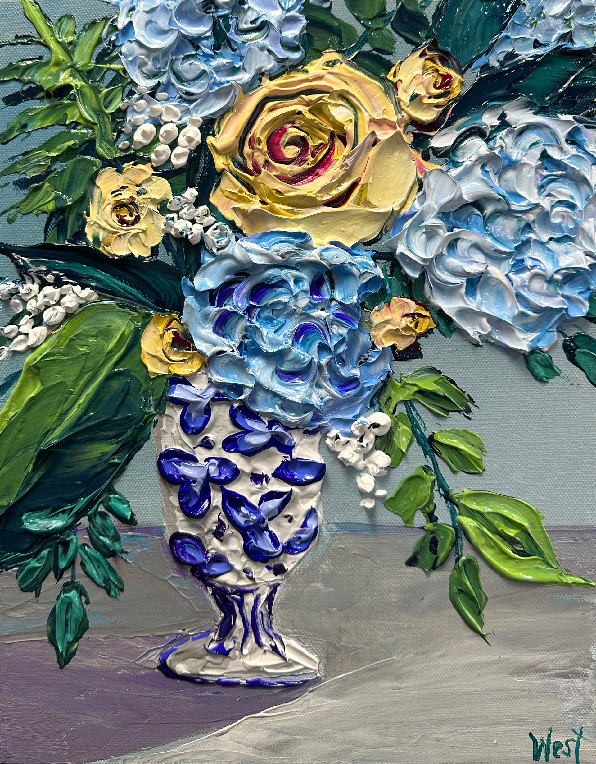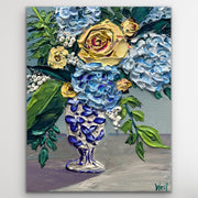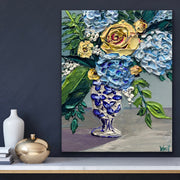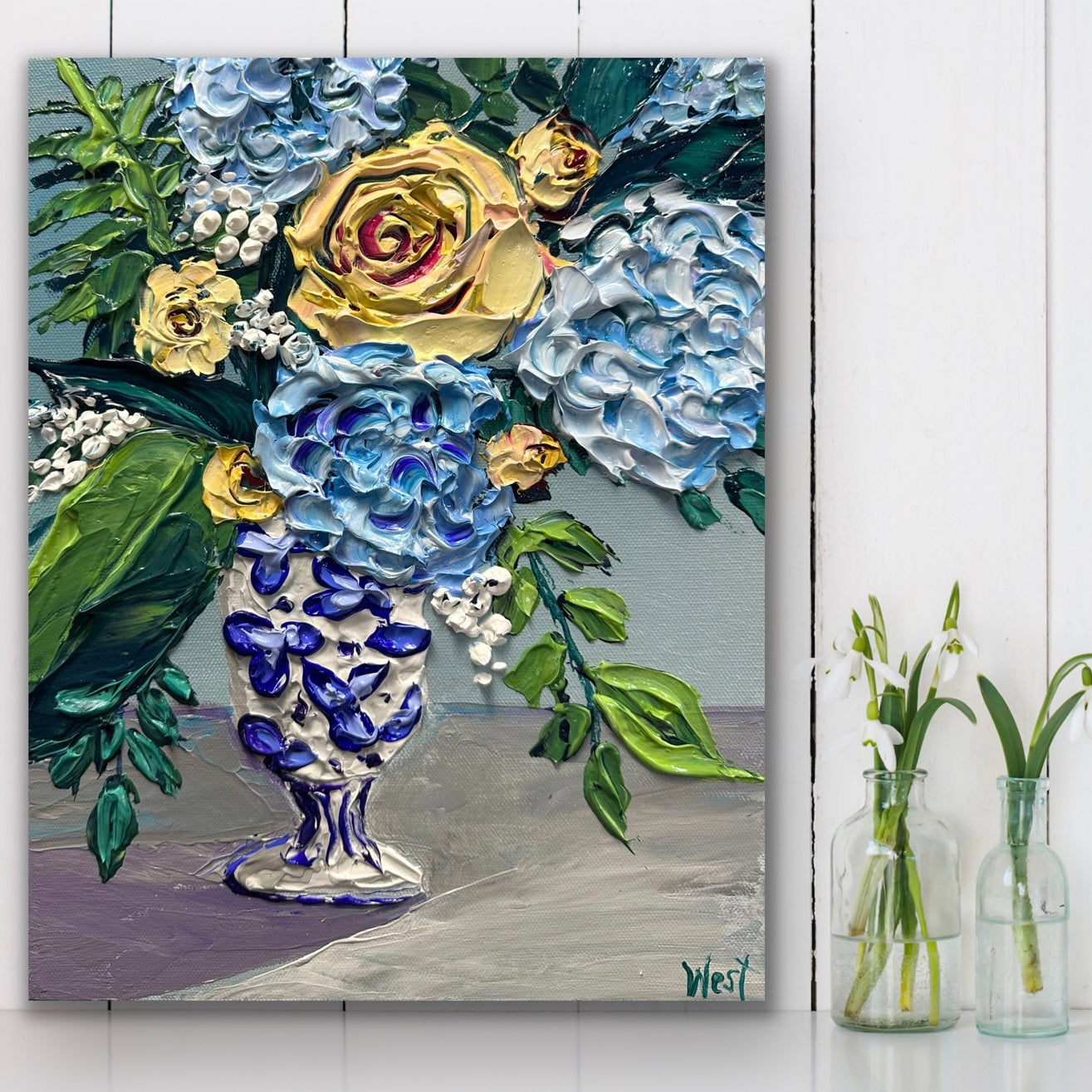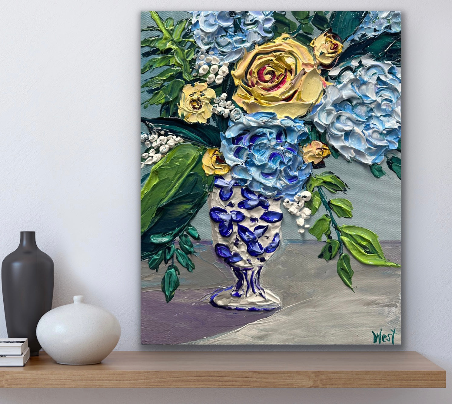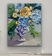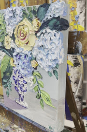 In "Blossom Serenade" I captured this lovely floral arrangement held in a classic and elegant ginger jar vase. The soft yellow-pink roses are surrounded by exquisite hydrangeas, their delicate petals rendered in thick, textured stroke of the palette knife that give them a tactile quality that makes you want to reach out and touch.
