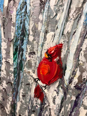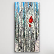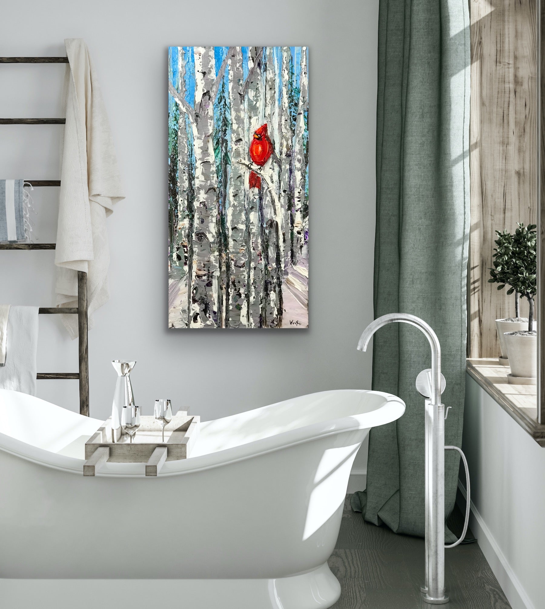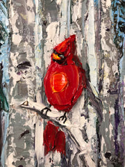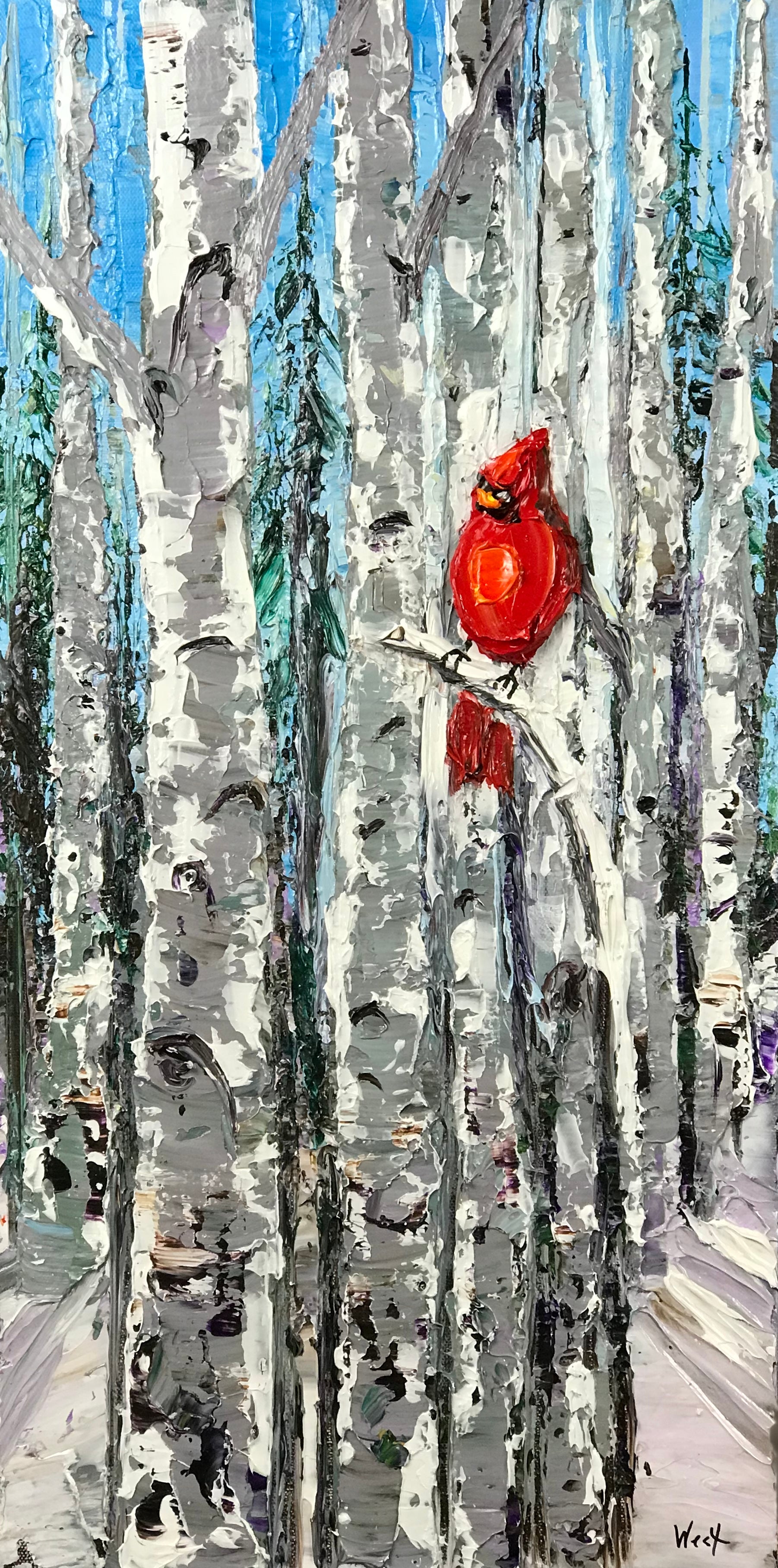 In Crimson in the Quiet, I wanted to capture the stillness of a forest moment — the kind where sound seems to fade and every detail feels sharper. The white trees, painted with textured strokes, create a serene backdrop for the brilliant cardinal perched among them. Its vivid red stands out against the cool grays and whites, a small but powerful presence in the calm. This piece is about noticing the beauty that lingers in quiet spaces and the way a single splash of color can warm an entire scene.