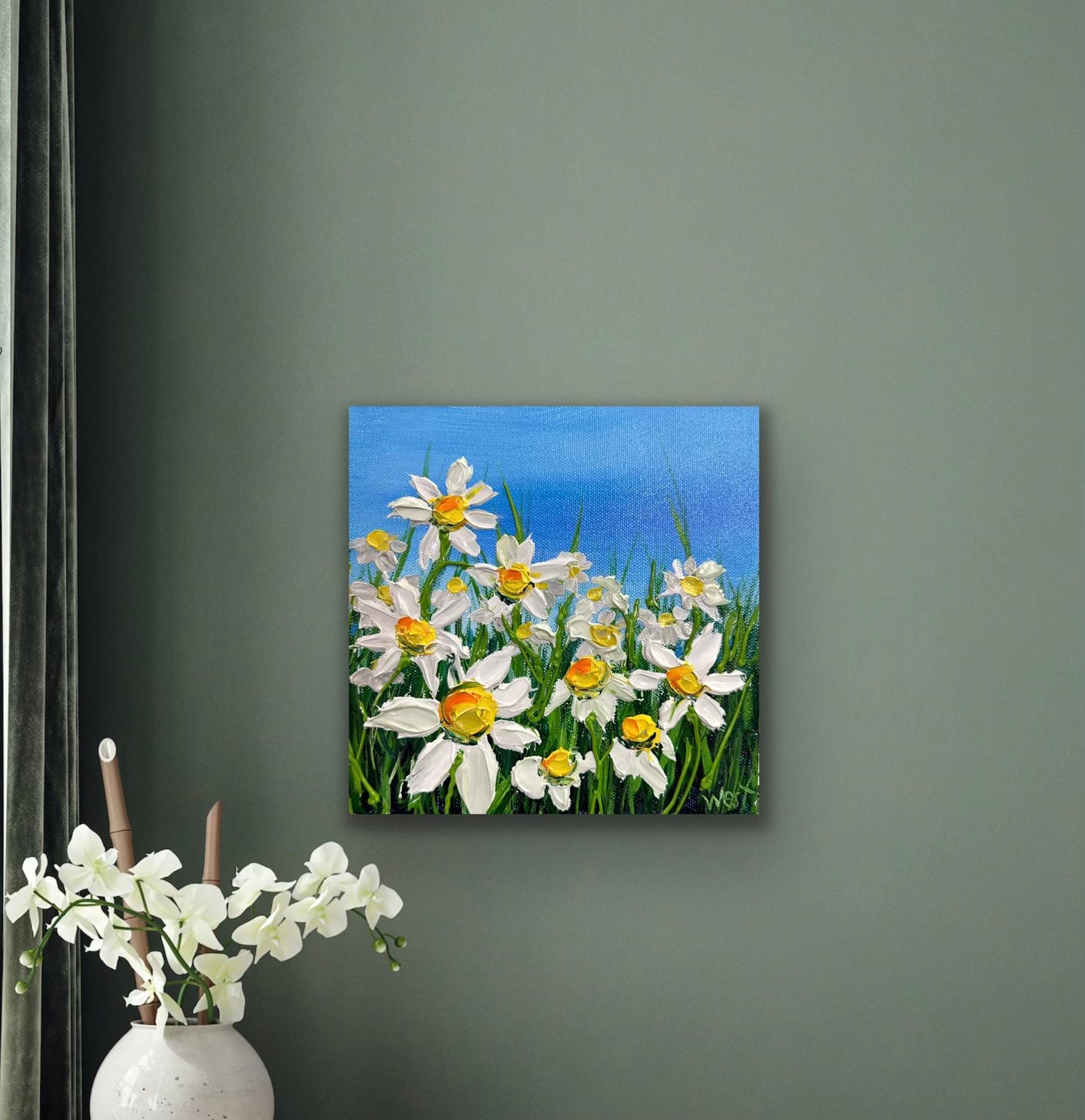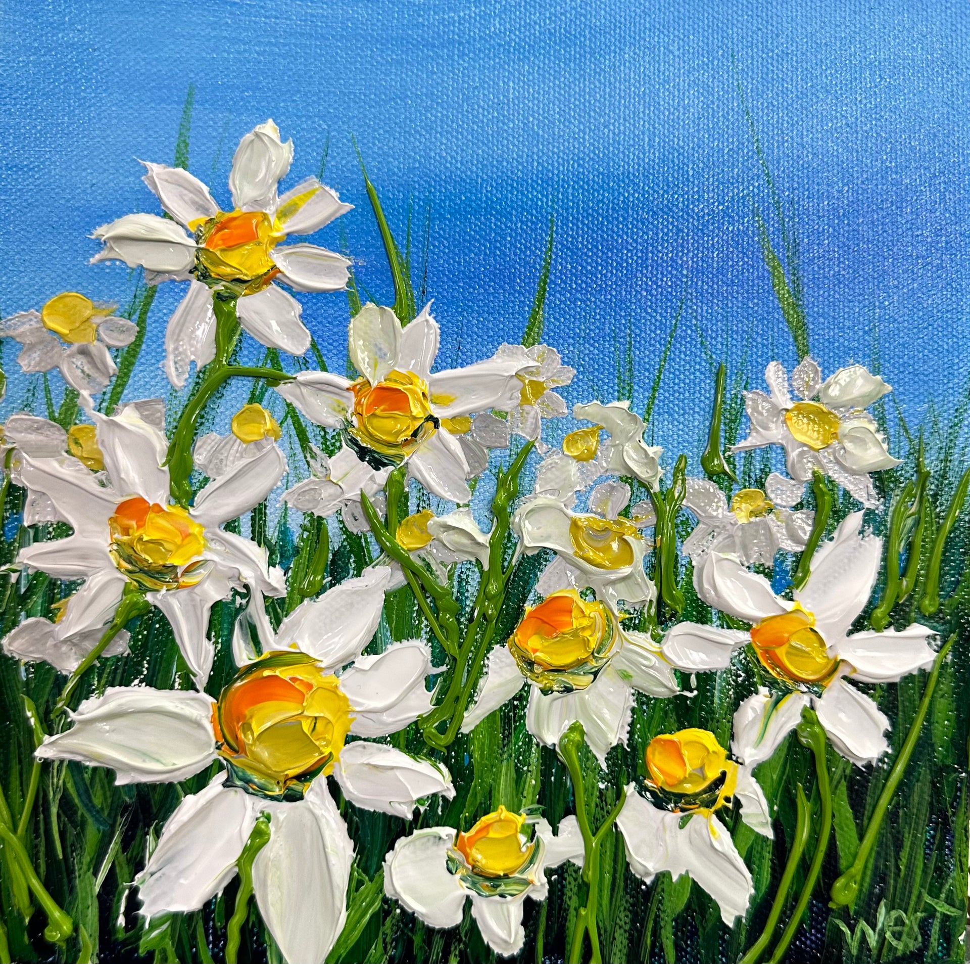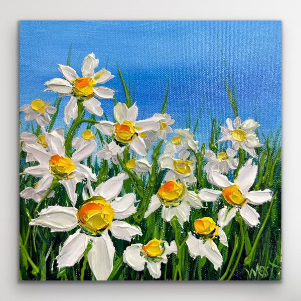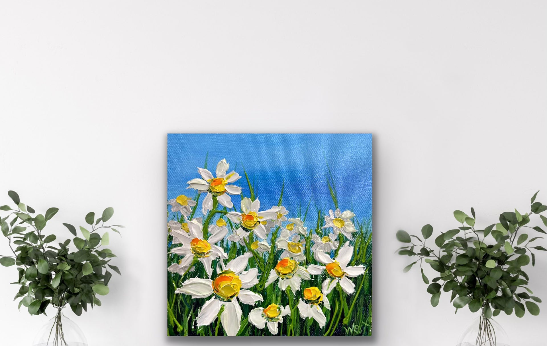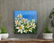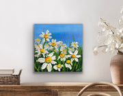 "Daisy Dream" is an enchanting painting that captures the essence of a dreamy, sun-kissed meadow adorned with the beauty of delicate daisies. This artwork is framed by a serene light blue background that accentuates the vibrant white and yellow hues of the petals. I love the joy that daisies can bring to any home. Bring the sun-kissed beauty of a meadow into your home with "Daisy Dream". Feel the warmth of this enchanting painting, and bring a little joy into your life or that of someone you love.
