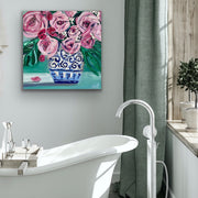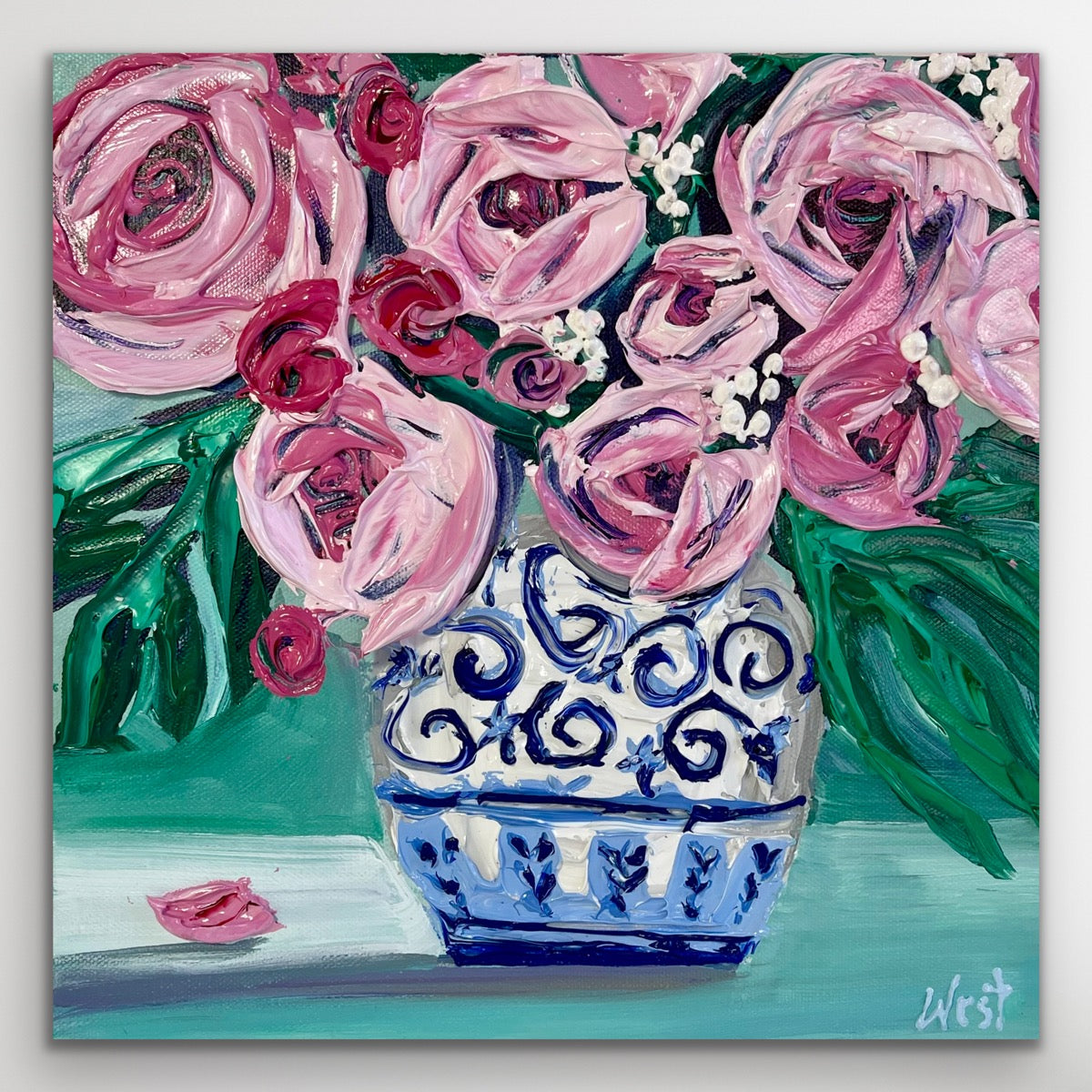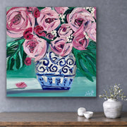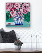 "Enchantment in Bloom" is a palette knife painting that captures the beauty and allure of pink and red roses in a blue and white ginger jar. The painting is alive with vibrant colors and bold, textural brushstrokes that convey a sense of movement and energy.