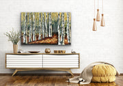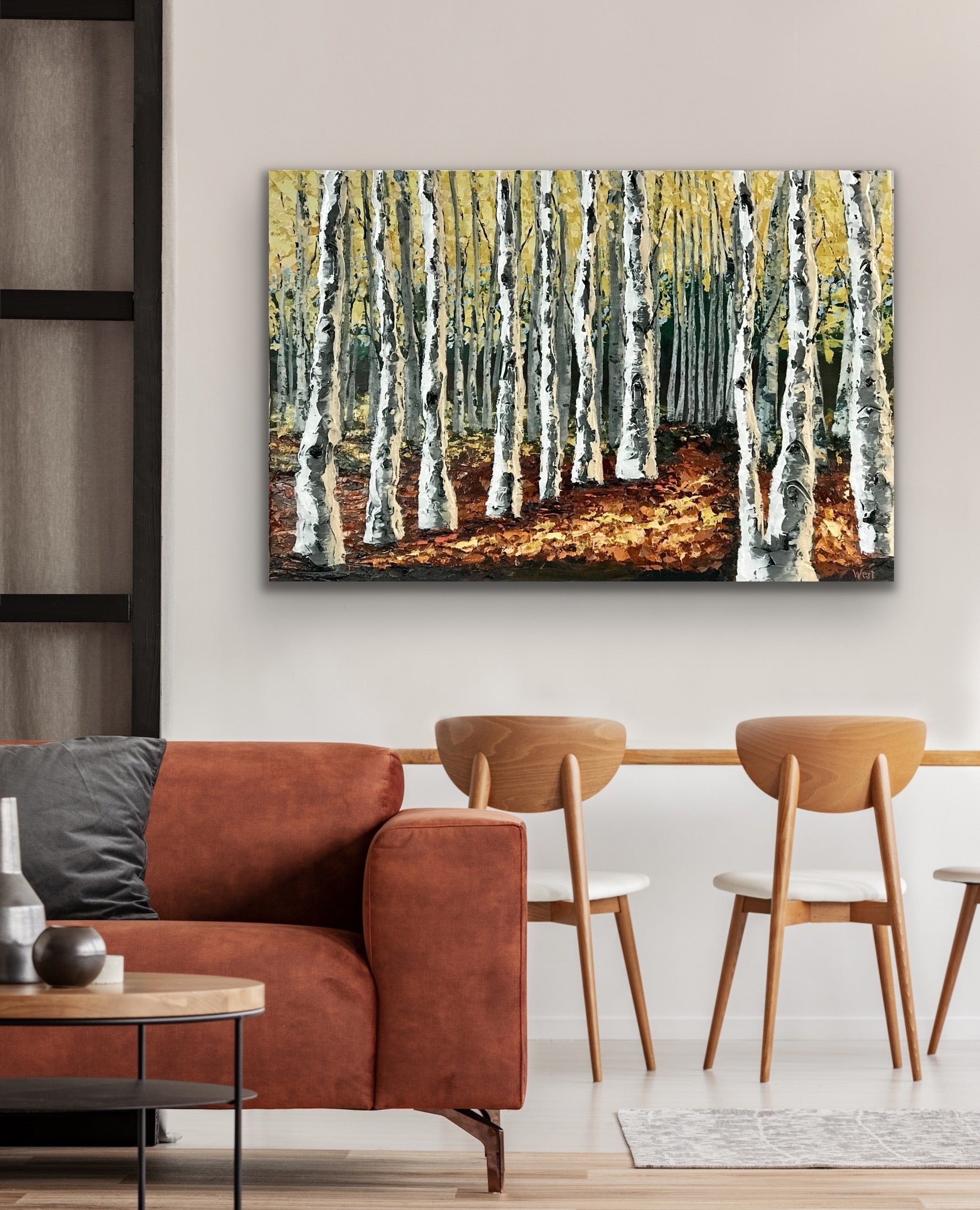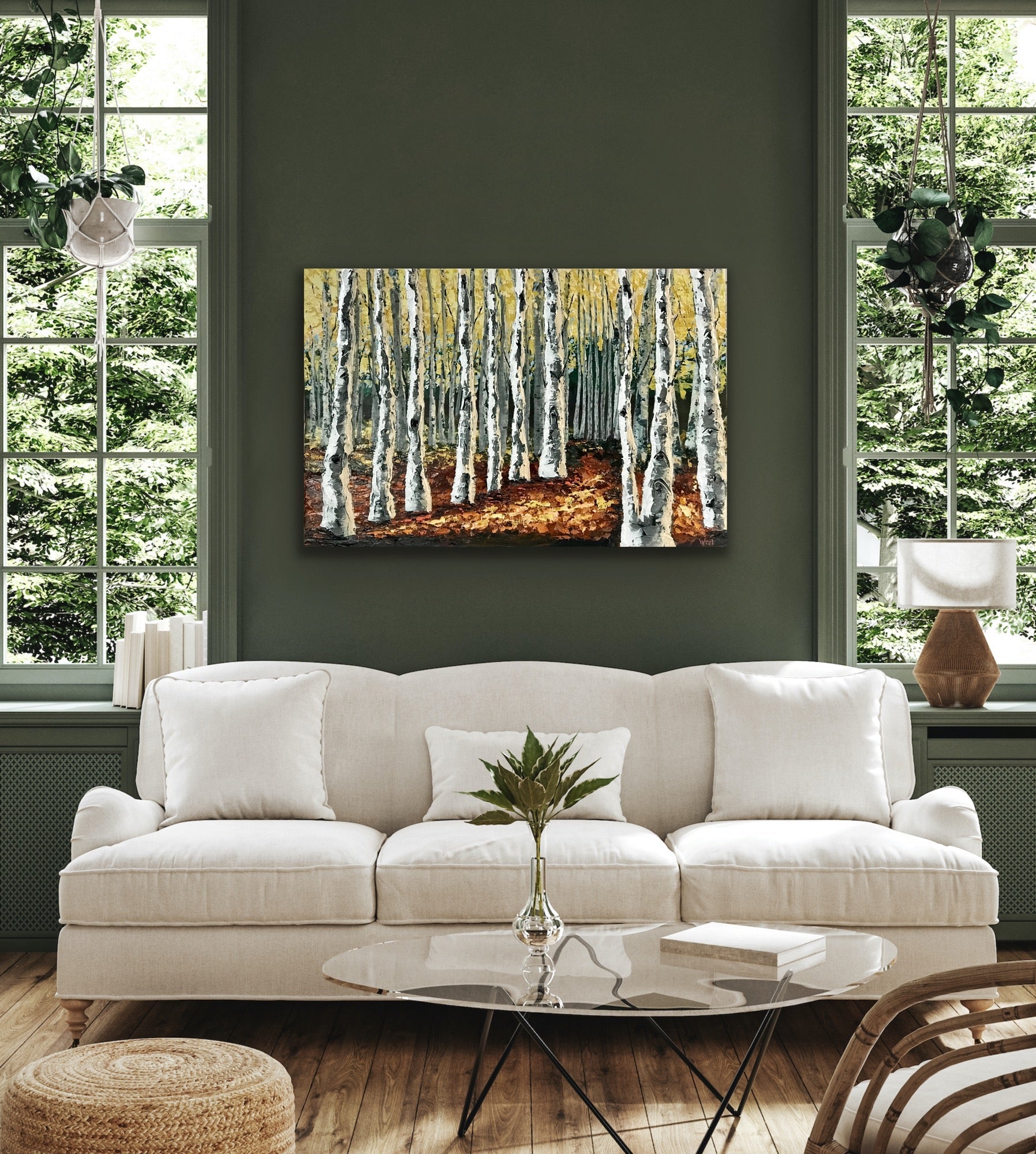 "Fall Splendor" will take you on a peaceful walk through a gorgeous aspen forest in the Fall. You can see far into the forest as you enjoy this stunning piece, which features yellow, oranges, rich salmon, touches of blue and green.