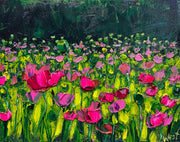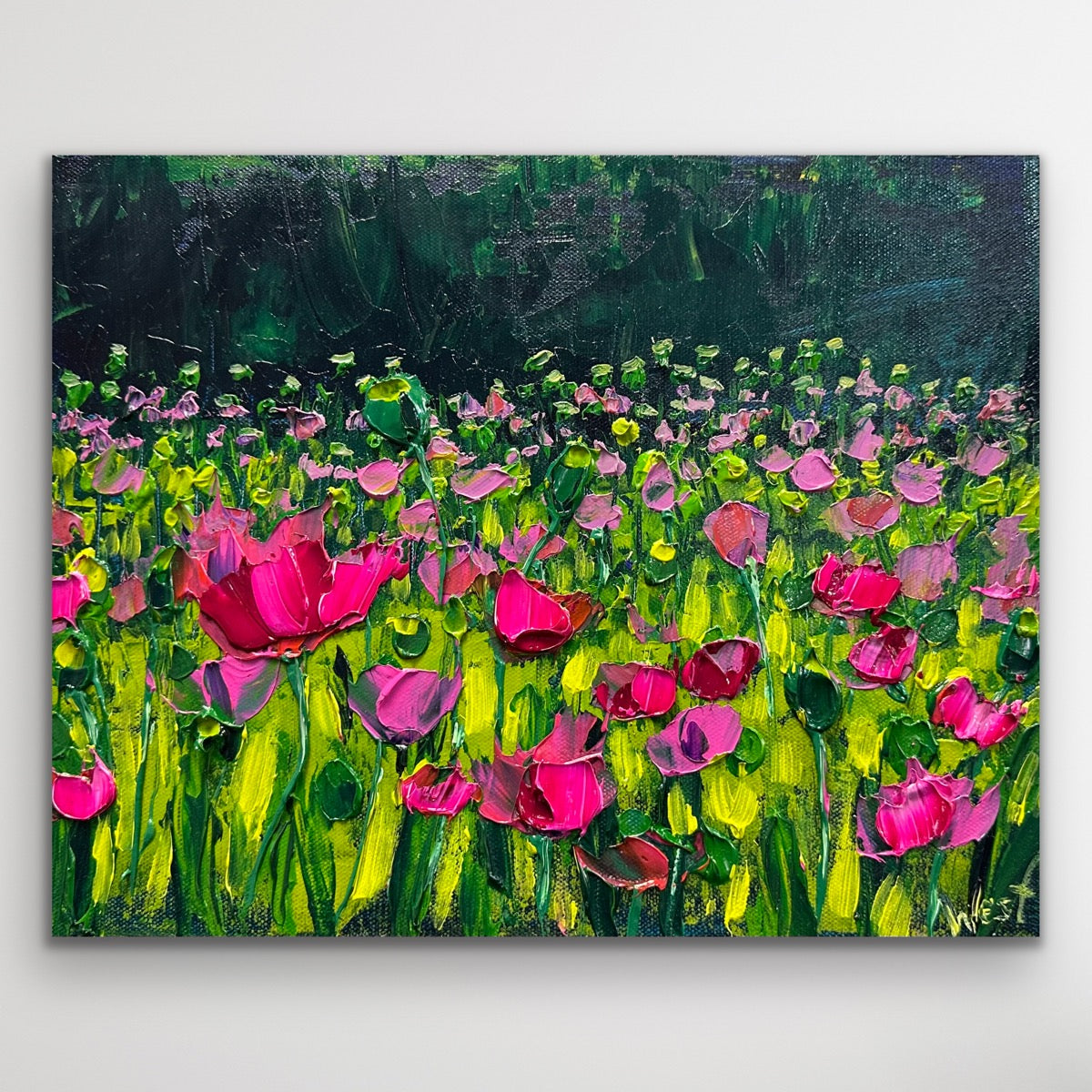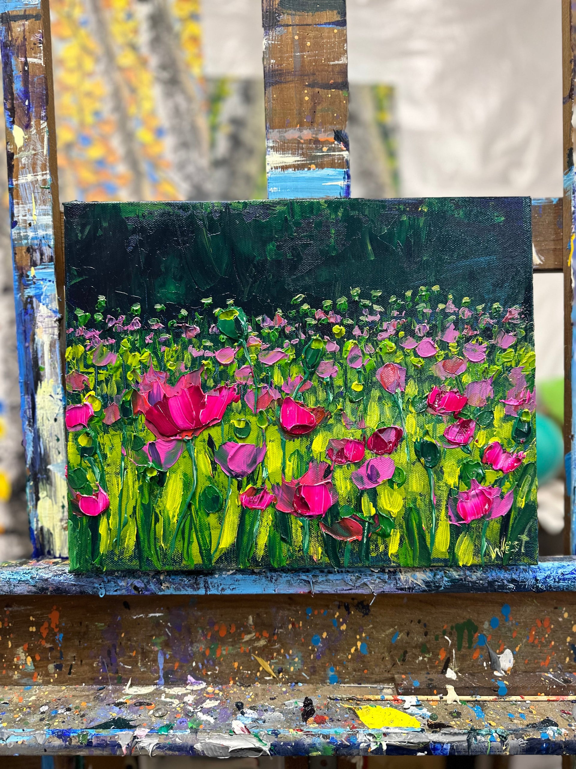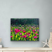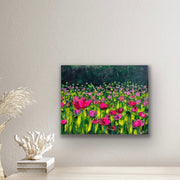This vibrant piece comes alive thanks to the the vivid fuchsia tulips set against a deep, lush, and dense forest green background. The thick paint creates a textured and tactile piece of art that invites you to run your fingers over the canvas and step into the breathtaking scene.