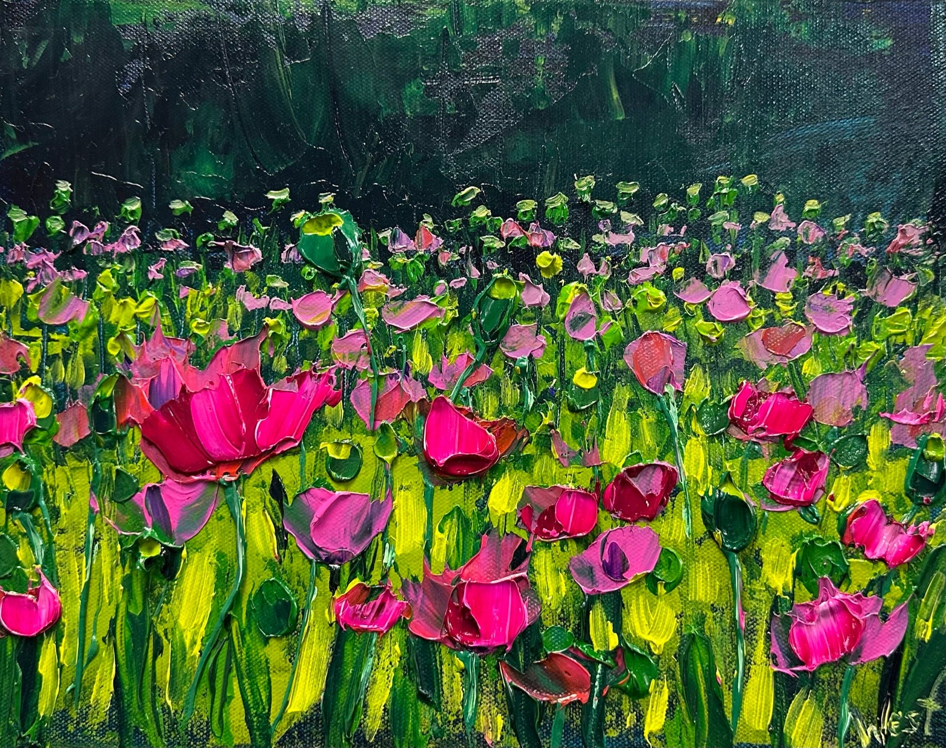 Each fuchsia flower bursts forth with energy, the petals thickly layered with impasto palette knife strokes that give them a three-dimensional quality. I hope you love it as much as I do!