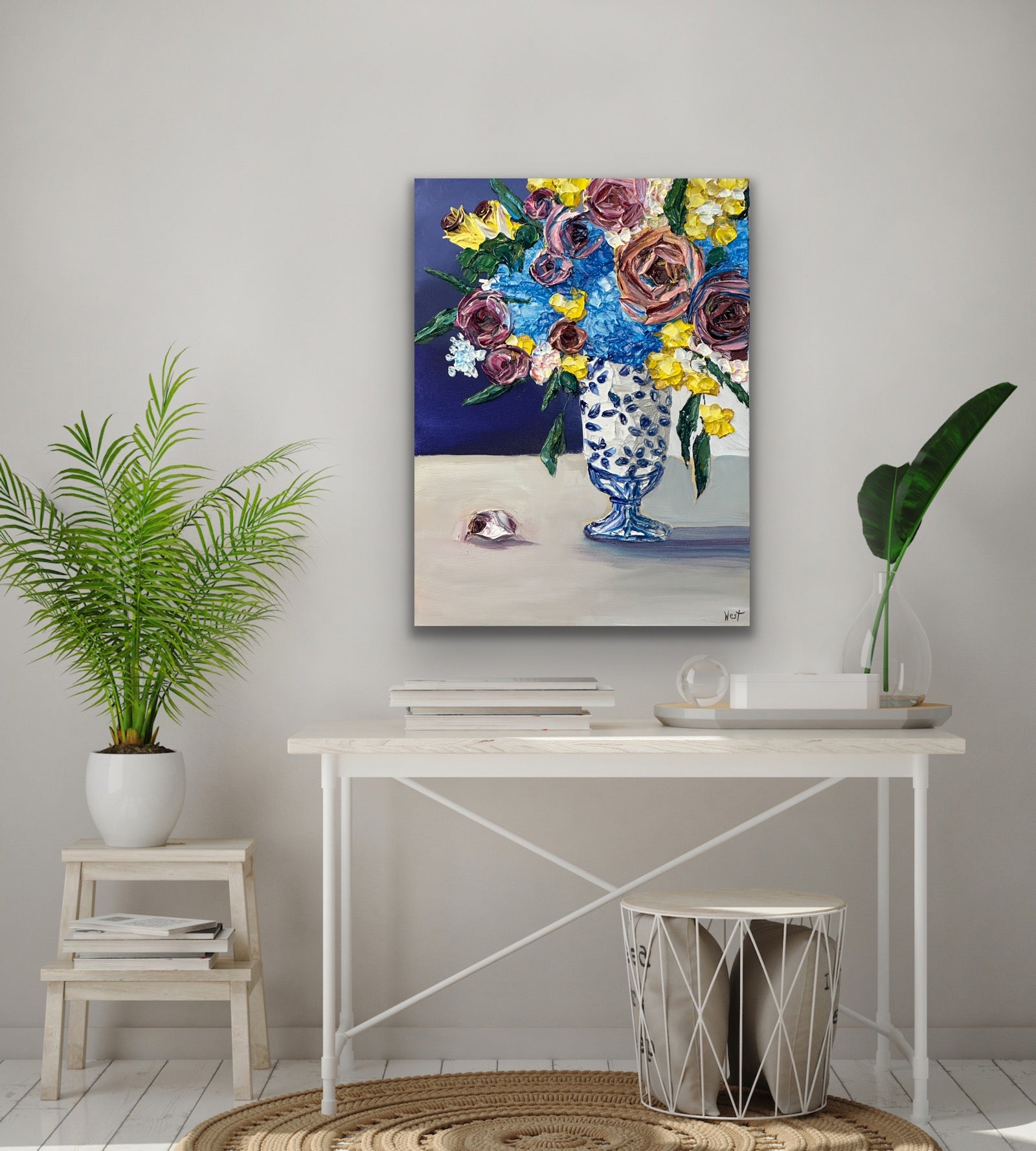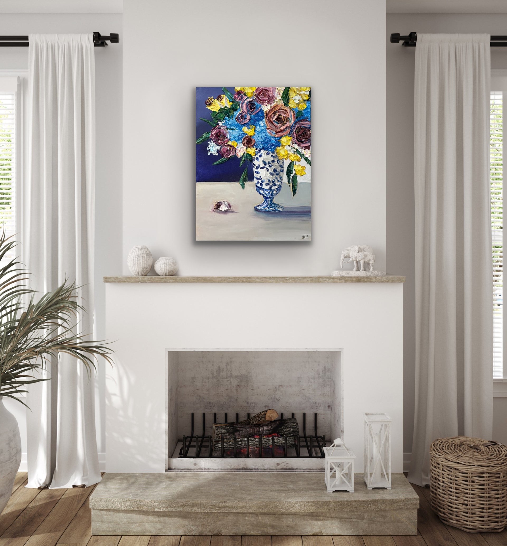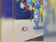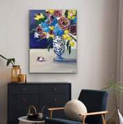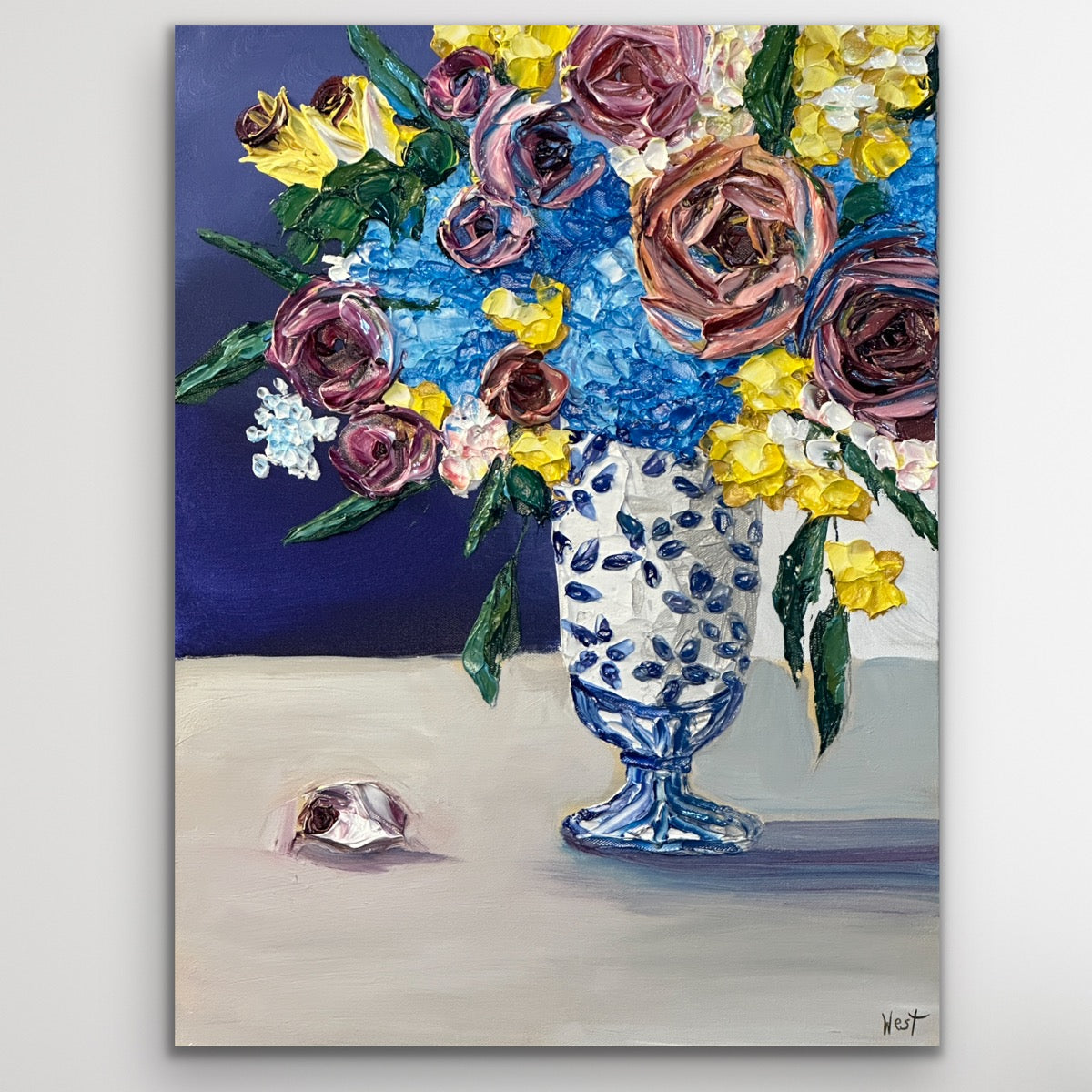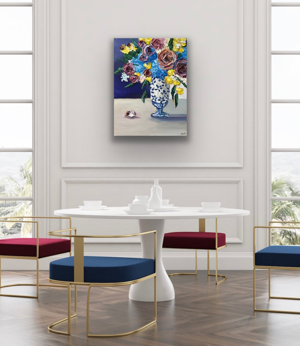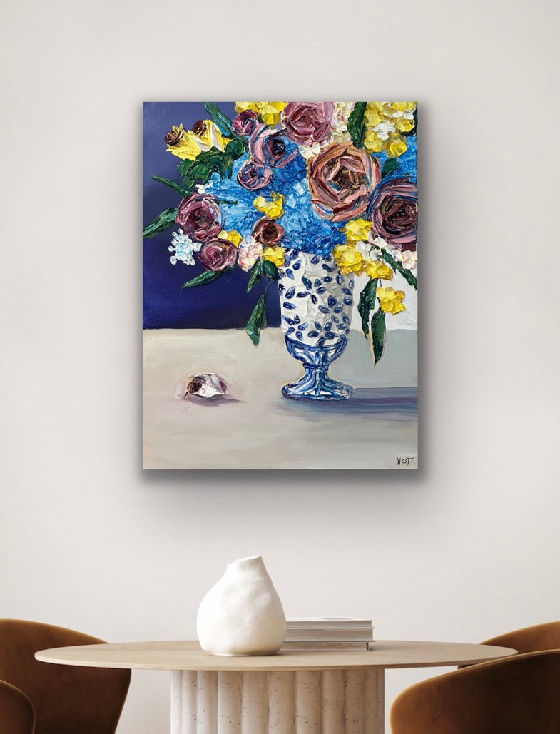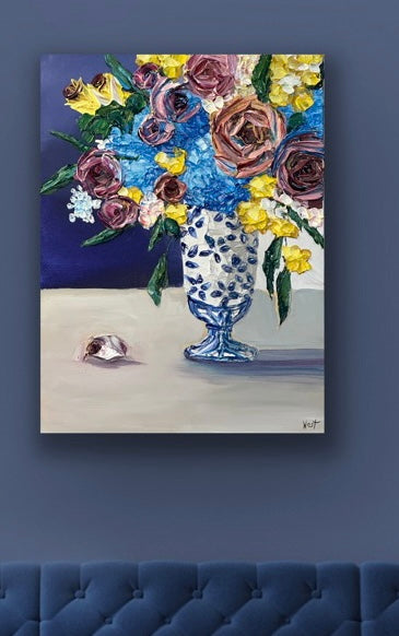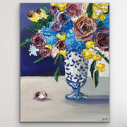 "Ginger Jar Dreamscape" is an lovely still life featuring thickly textured roses embraced by graceful and tender blue hydrangeas-- all gathered beautifully in a ginger jar chinoiserie vase. Delicate yellow flowers and deep amethyst roses complete the arrangement bringing life, warmth and serenity to the piece. Will it be yours or your loved one's?