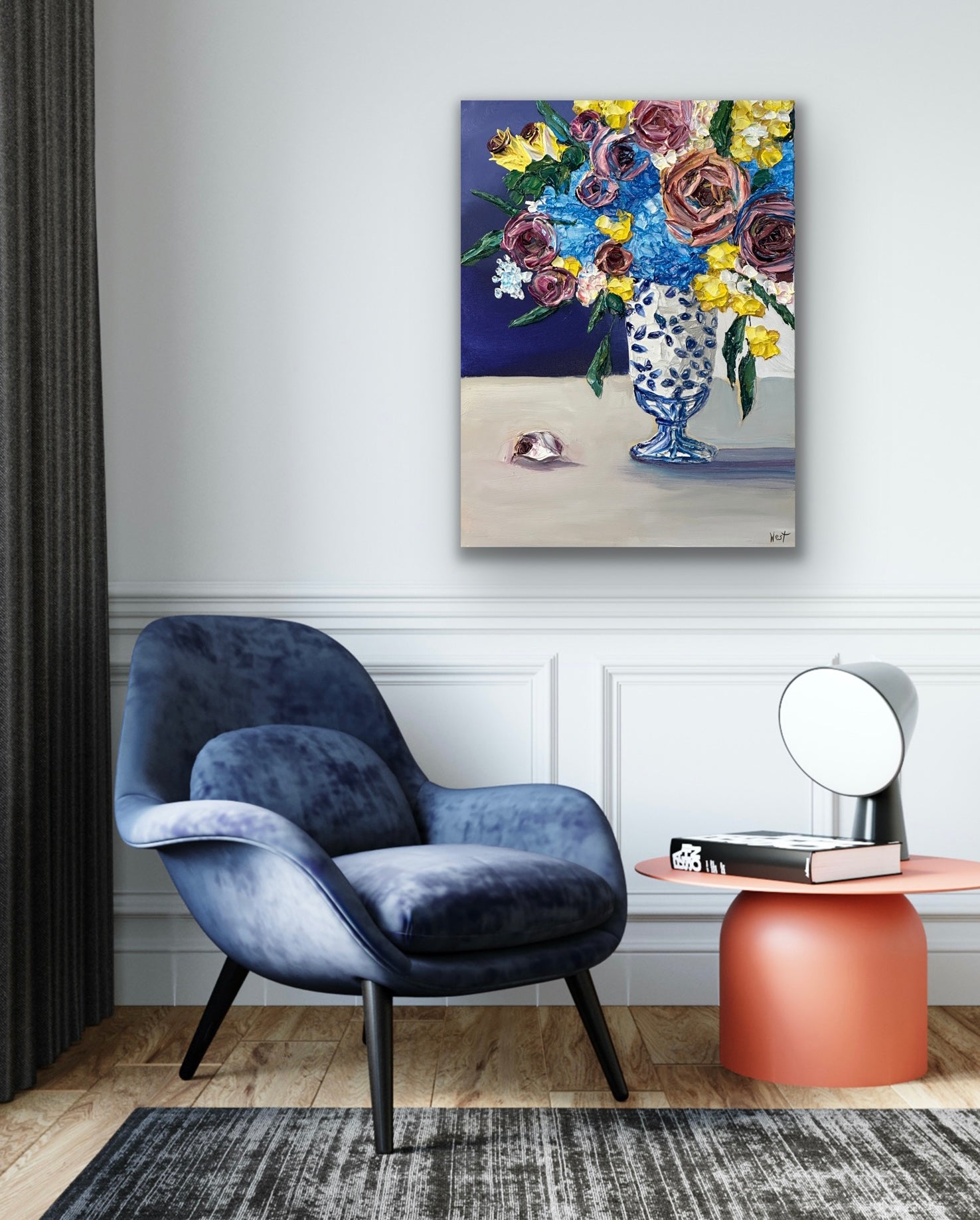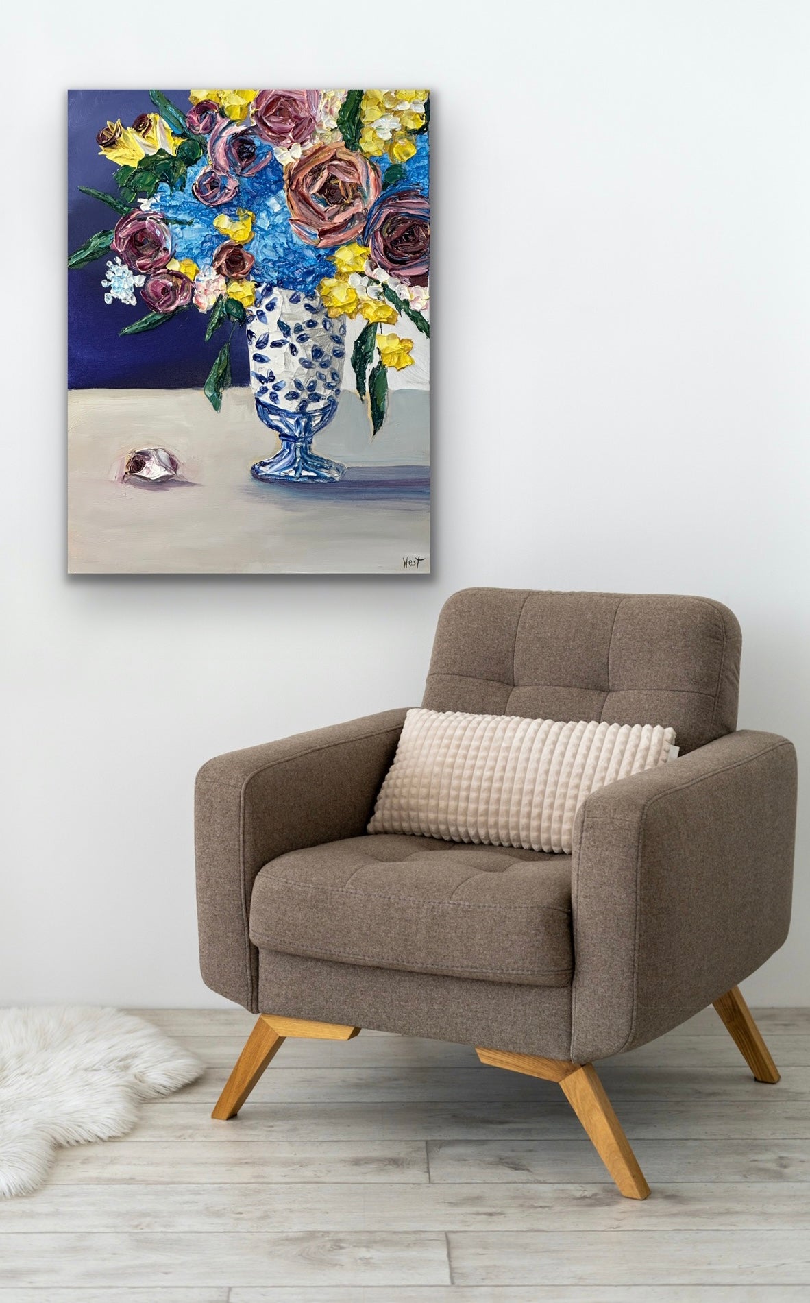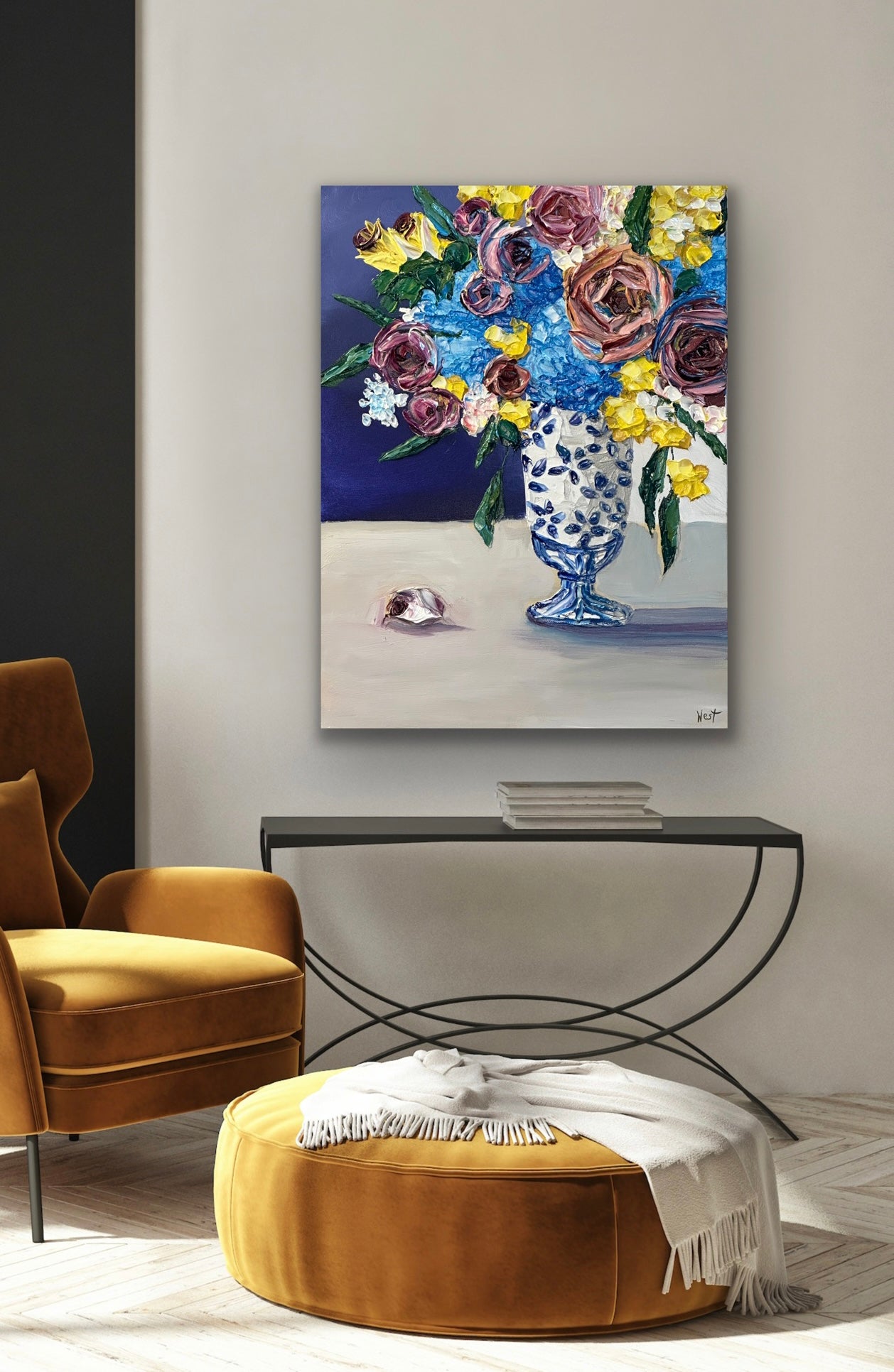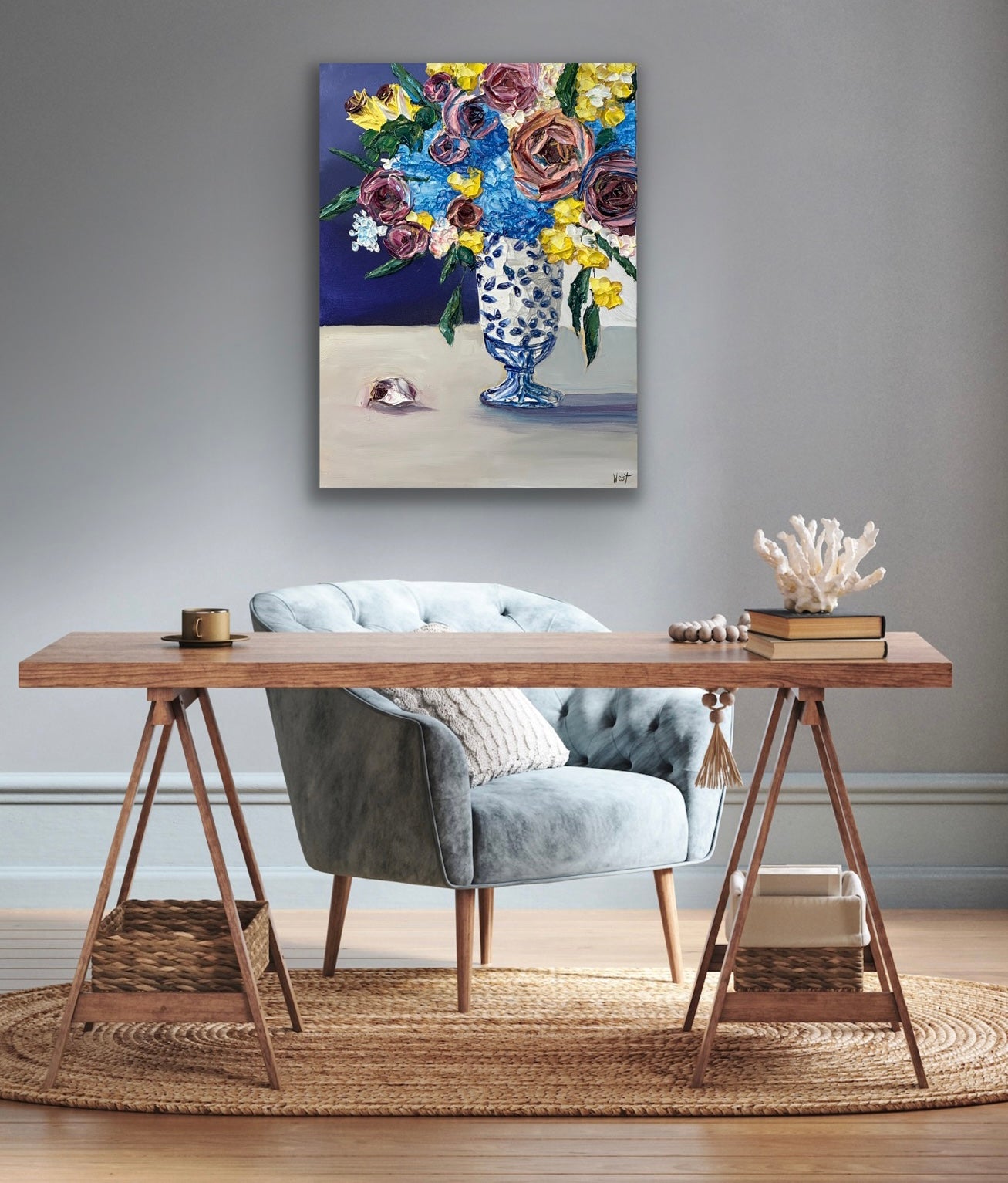 "Ginger Jar Dreamscape" is an lovely still life featuring thickly textured roses embraced by graceful and tender blue hydrangeas-- all gathered beautifully in a ginger jar chinoiserie vase. Delicate yellow flowers and deep amethyst roses complete the arrangement bringing life, warmth and serenity to the piece. Will it be yours or your loved one's?