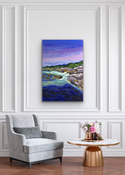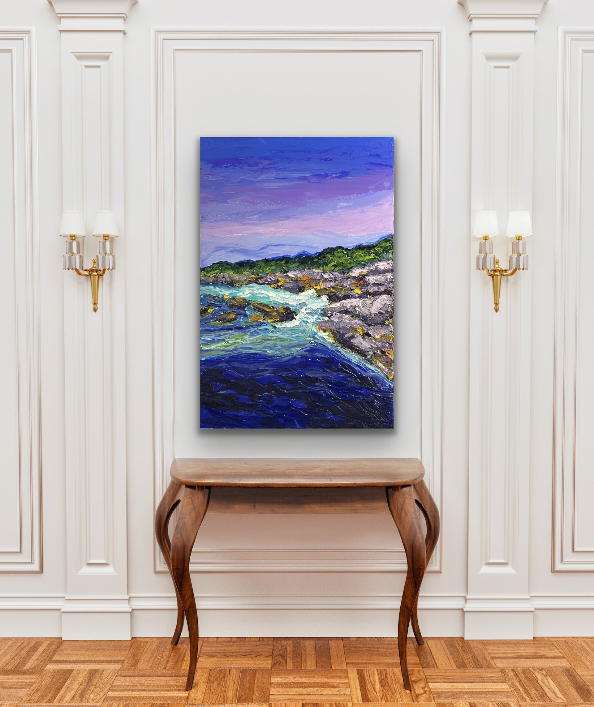 The sky above is bathed in soft blue, lavender and pink tones, creating a gentle contrast to the intensity of the falls. As sunlight touches the surface, I added glimmers of lavender, turquoise and ultramarine blue to make the water sparkle, as if the whole scene is alive with energy. The trees that line the riverbank are vibrant and full of life, their colors dancing in the light. To me, this piece is all about the adventure—the wild beauty and unrestrained power of nature, captured in a single moment of dynamic harmony.