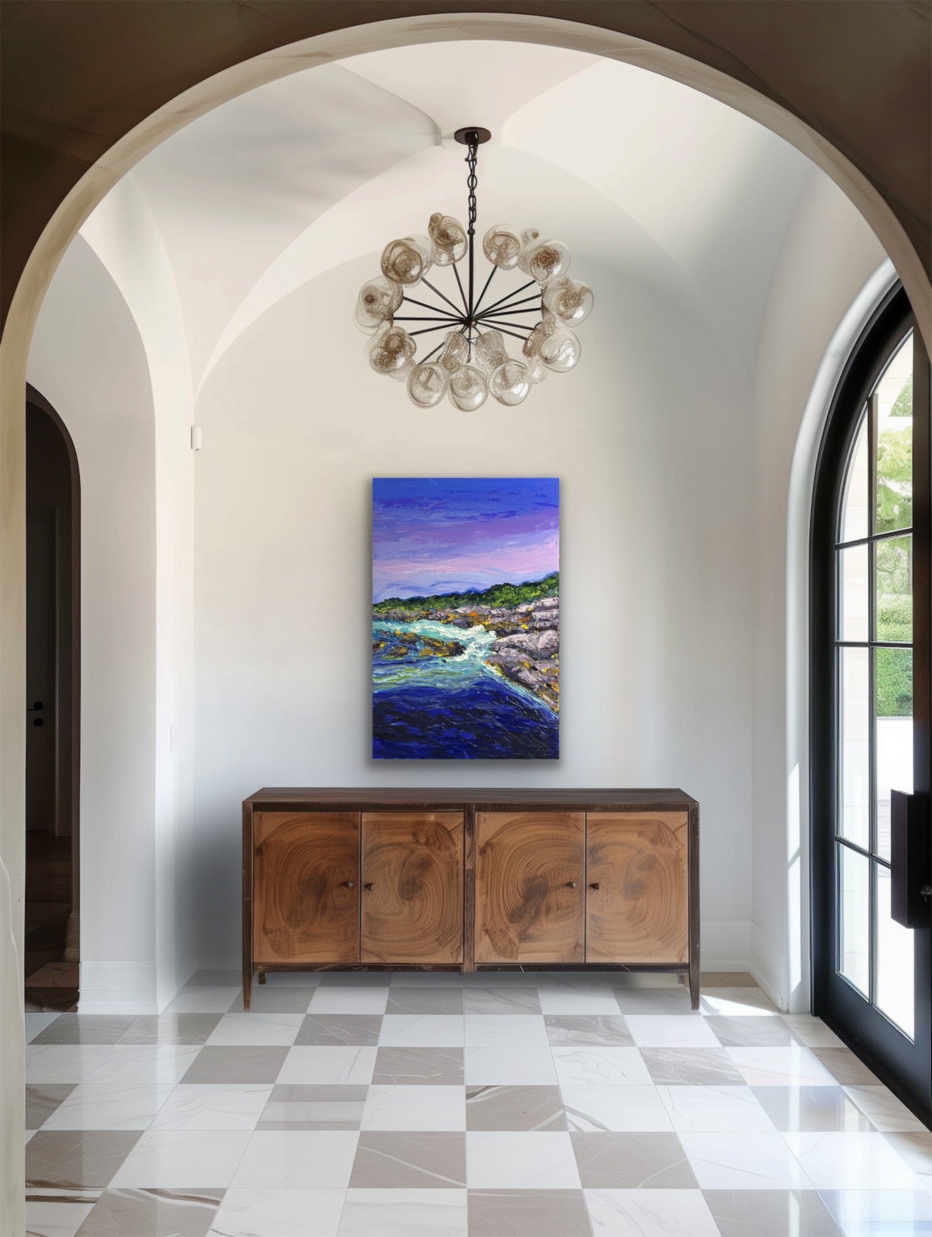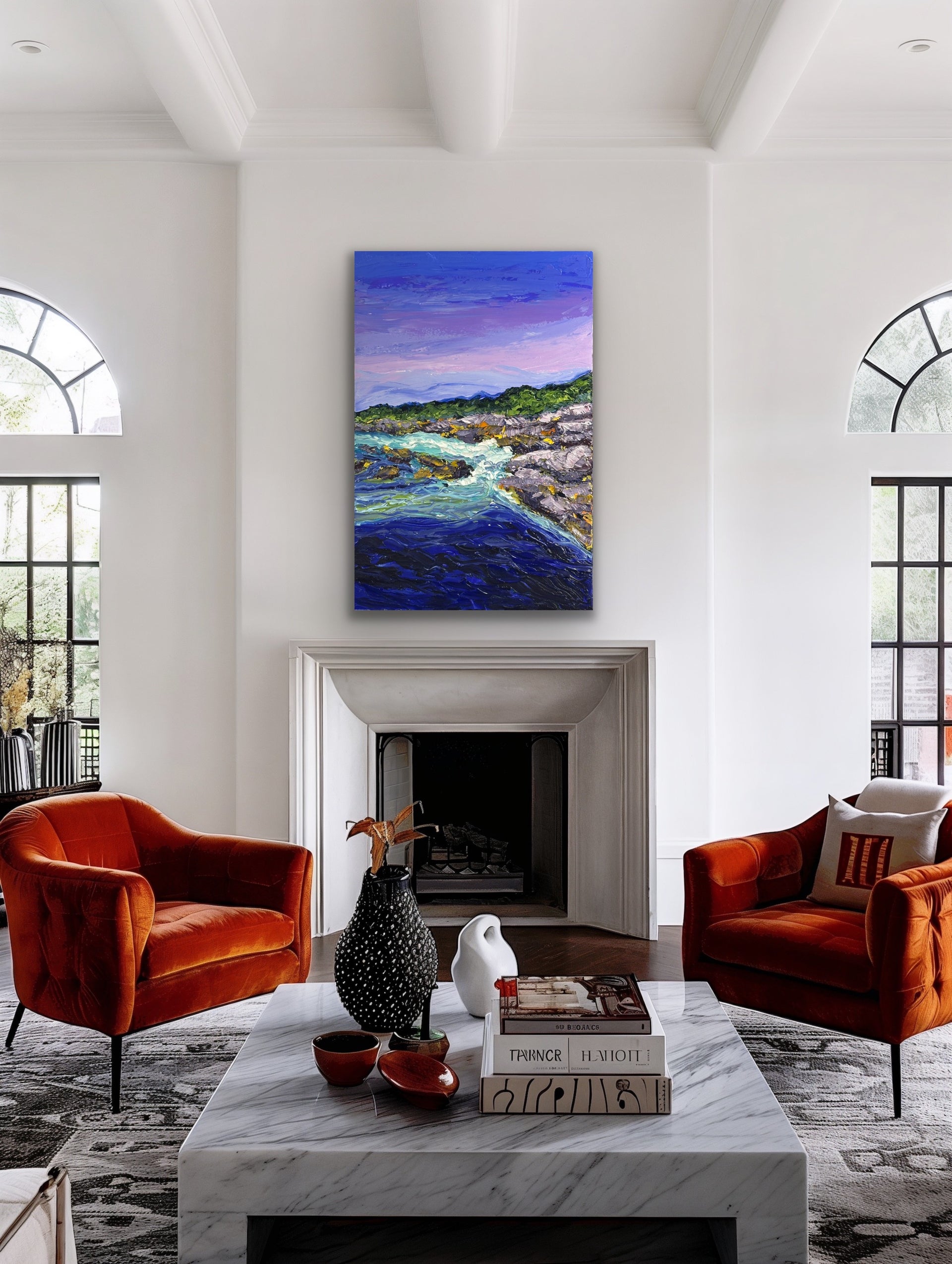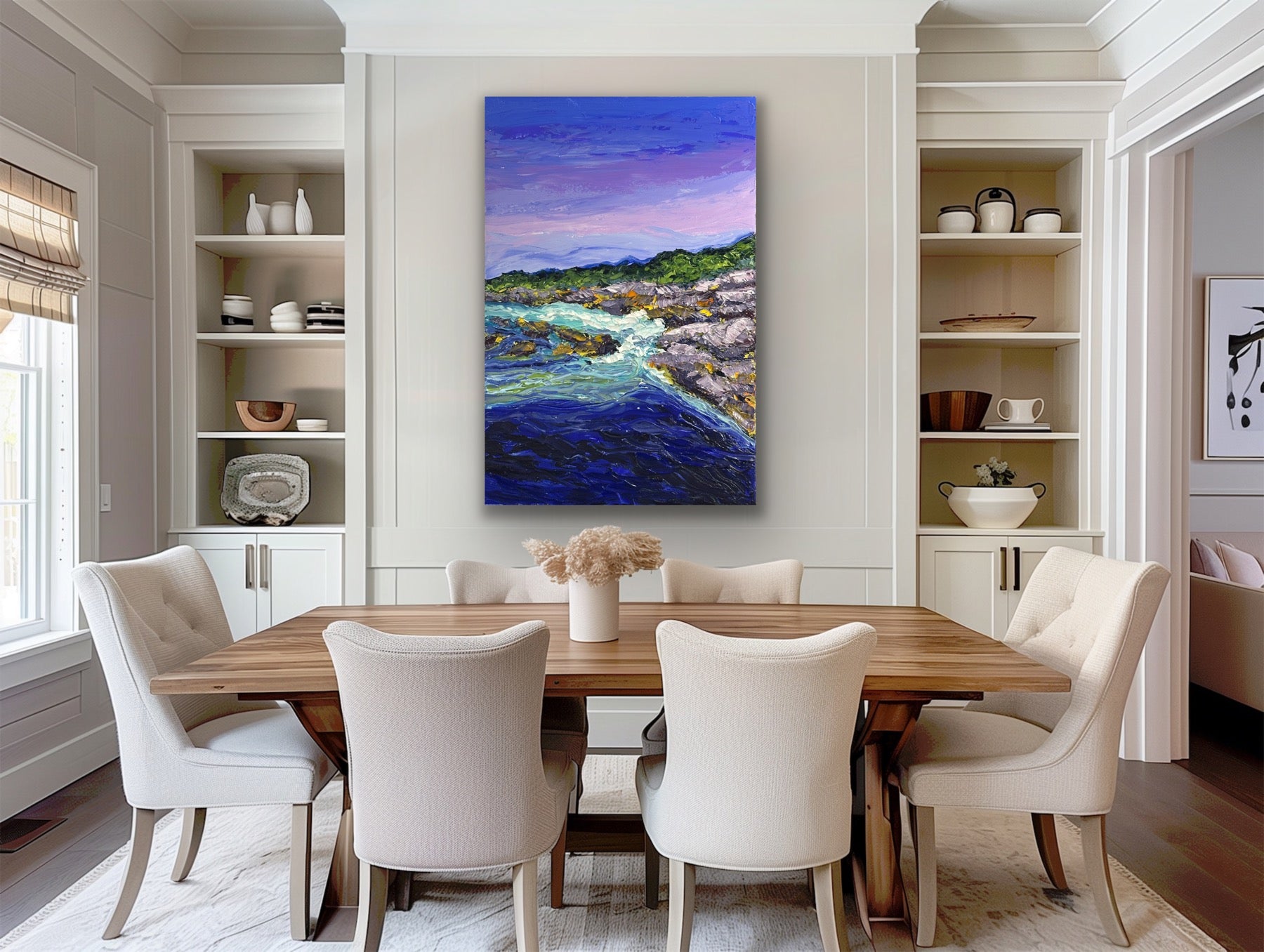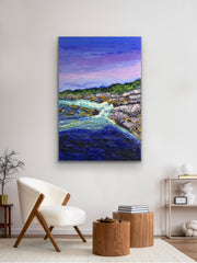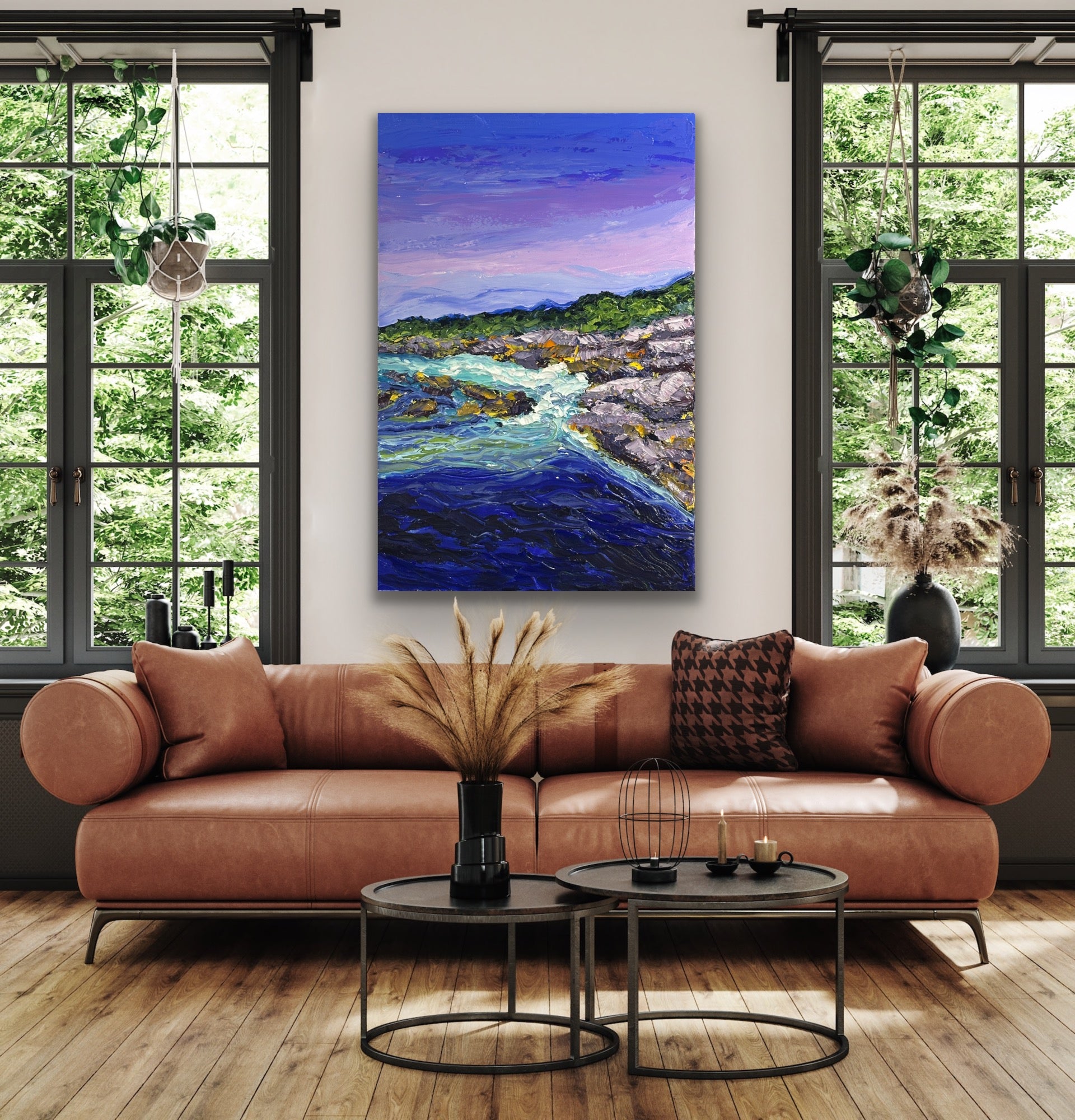 "Great Falls' Wild Adventure" is my way of capturing the raw energy and breathtaking beauty of the iconic Great Falls, Virginia landscape. The water flows in deep blues and purples, transitioning into rich teal and turquoise, with the white-tipped rapids crashing against the rugged cliffs. I wanted the water to feel alive, pulsing with movement and power.
