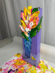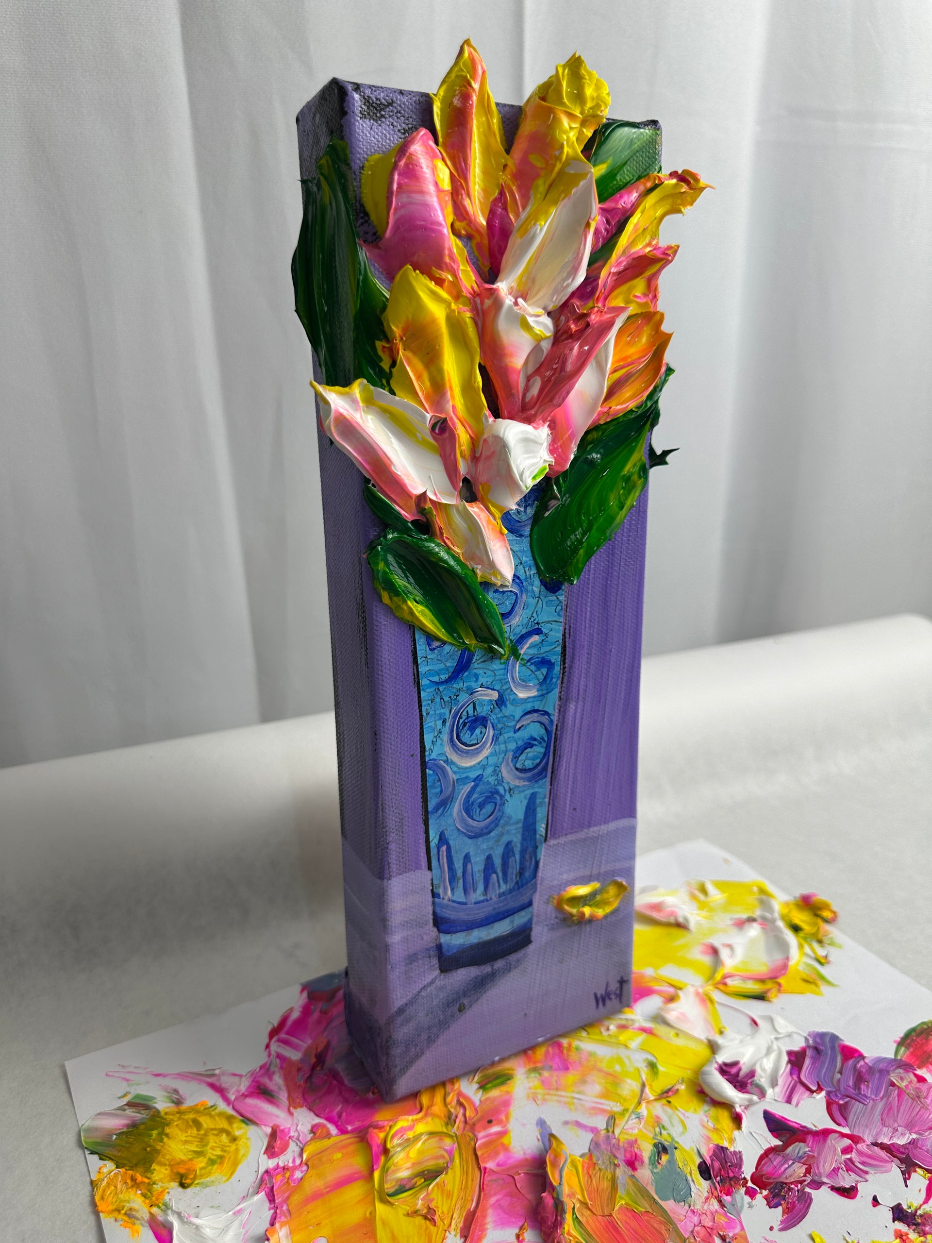 Happy Hearts Bouquet is a vibrant impasto painting that brings thickly textured pink and yellow tulips to life. Each tulip is crafted with rich, expressive palette knife strokes, creating bold, lively blooms that seem to burst with energy. The flowers are elegantly arranged in a ginger jar vase, which I’ve created by hand-painting and collaging papers onto the canvas, adding layers of texture and depth. The combination of palette knife technique with mixed media collage creates a harmonious balance, with the soft, flowing petals of the tulips contrasting beautifully against the intricate, handcrafted vase. This piece radiates warmth and joy, capturing the essence of love and happiness through its colorful blooms and dynamic texture.