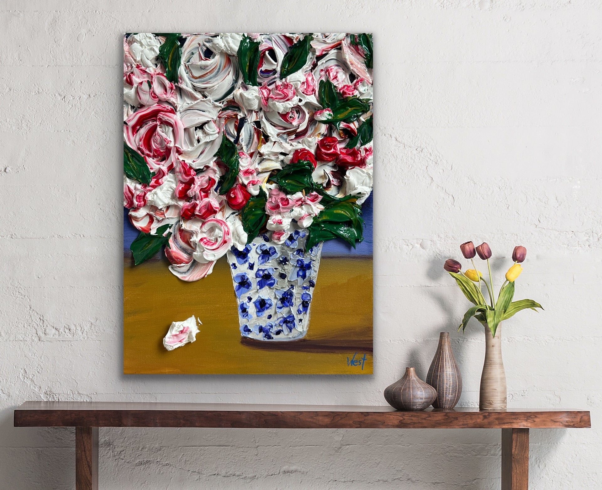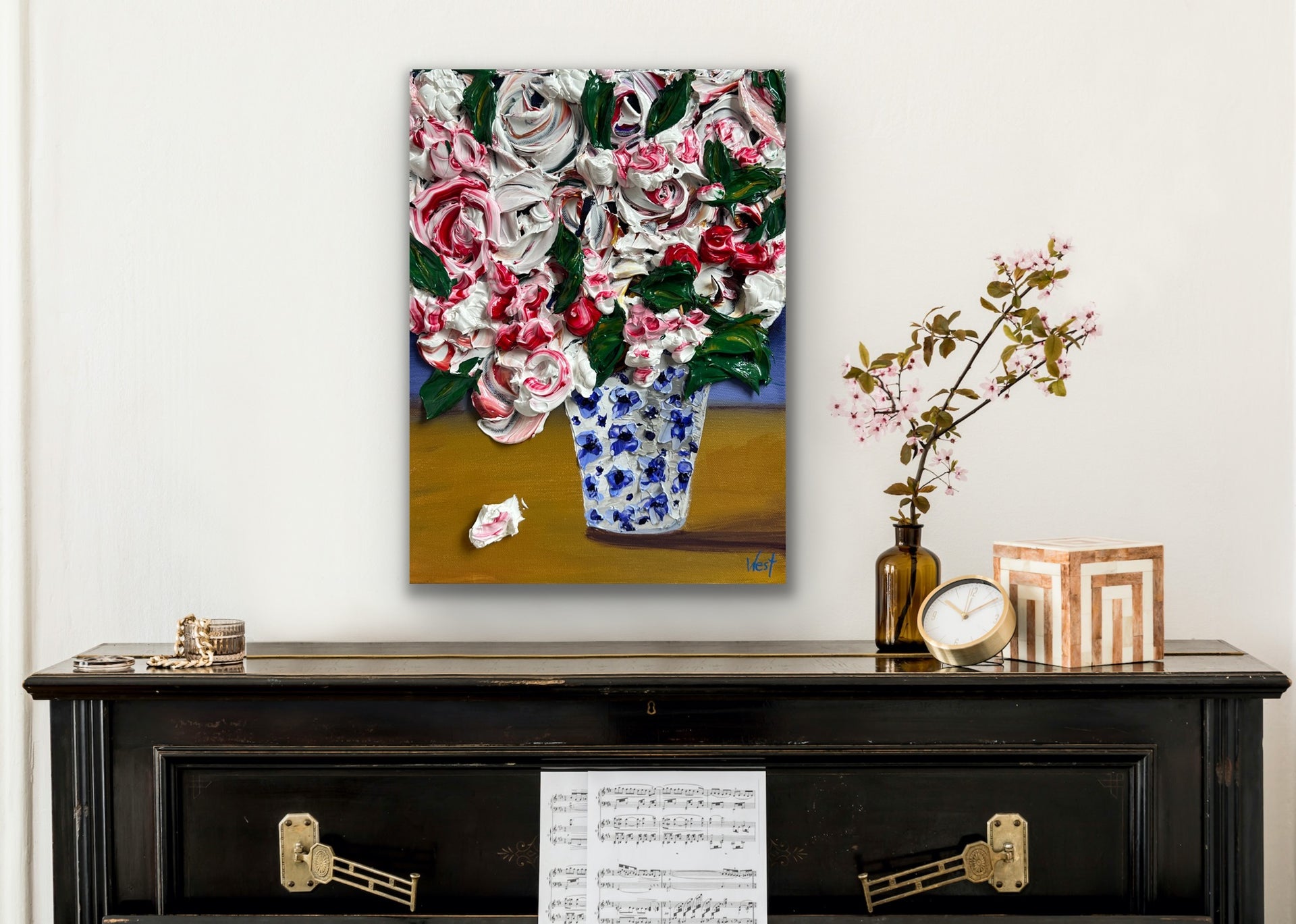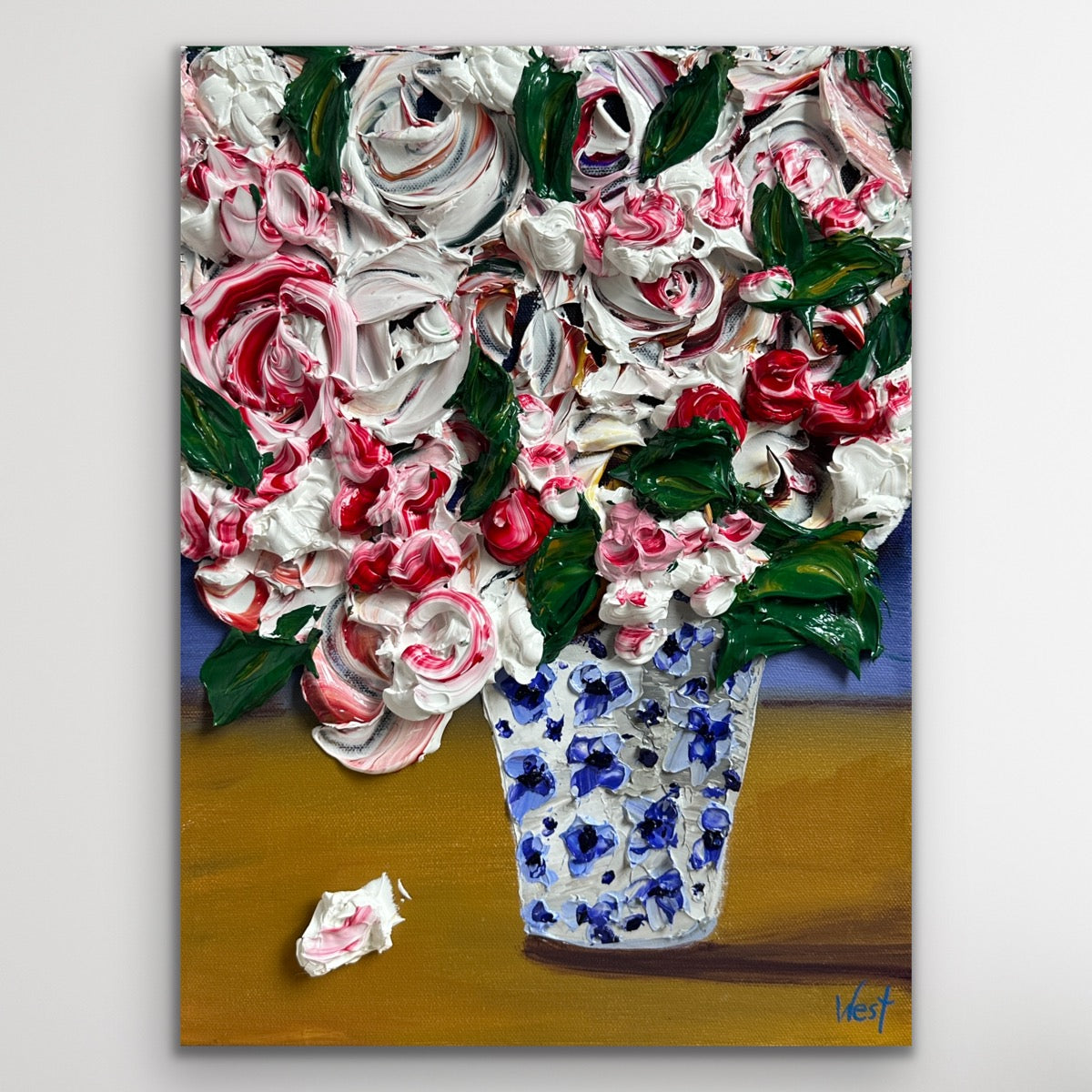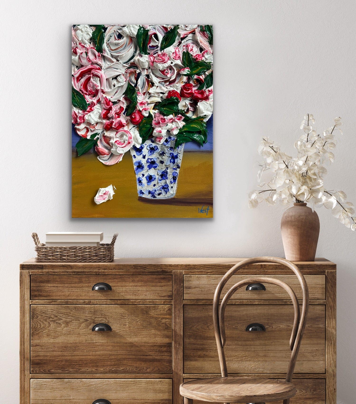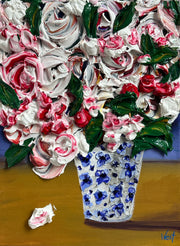 "Harmony in Petals" is all about celebrating the beauty of roses in their fullest, most abundant form. I used thick, textured layers of paint to bring out the richness of the white petals, with soft touches of crimson pink to add warmth and depth. The ginger jar anchors the composition with its timeless charm, while the heavy impasto makes the flowers feel almost sculptural. This piece was such a joy to create—each stroke felt like I was shaping the roses themselves.