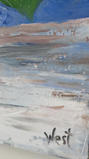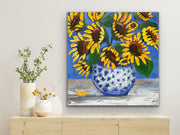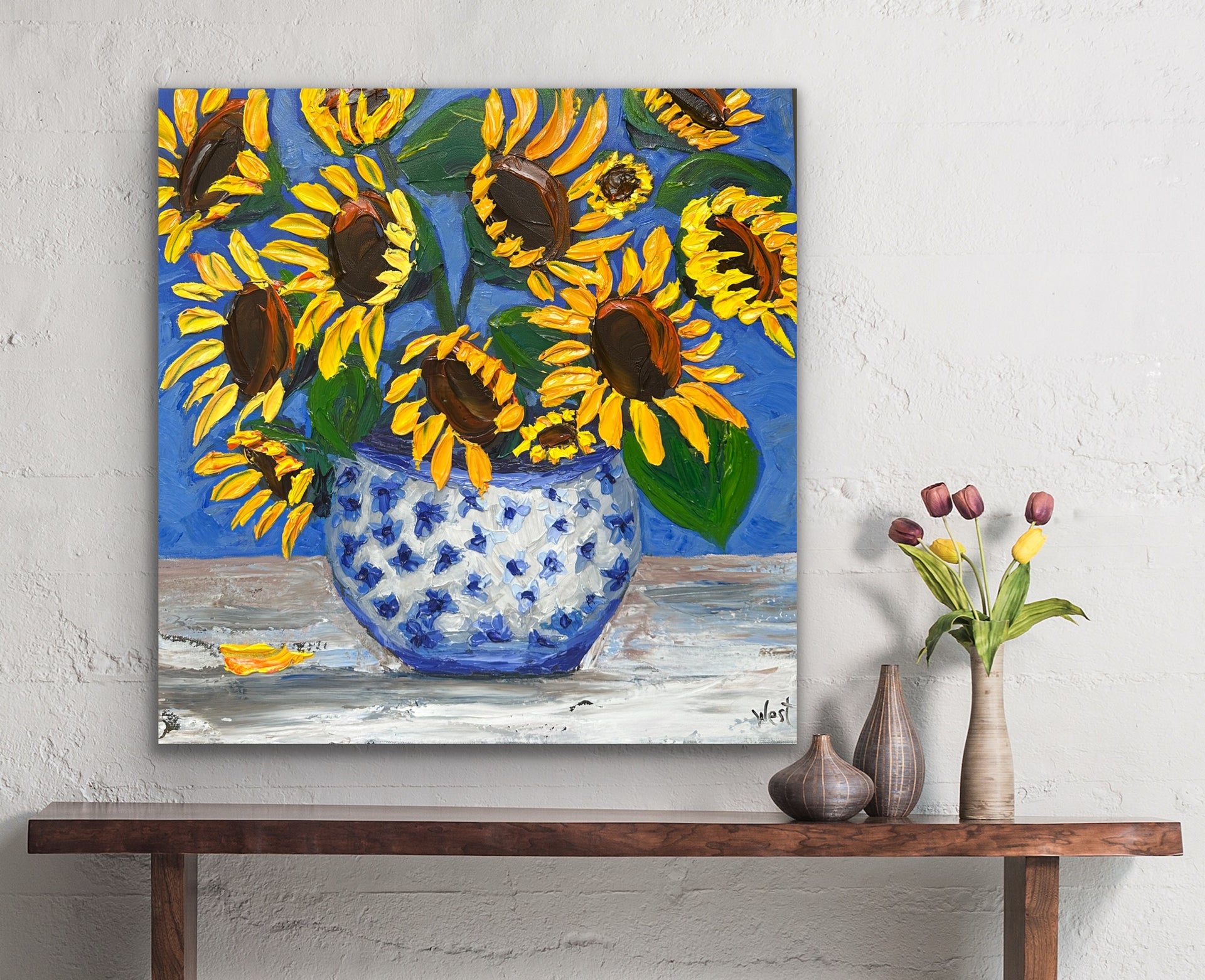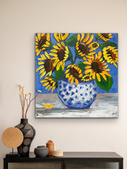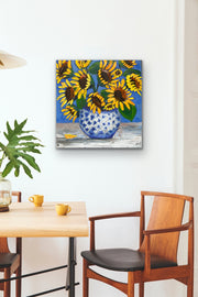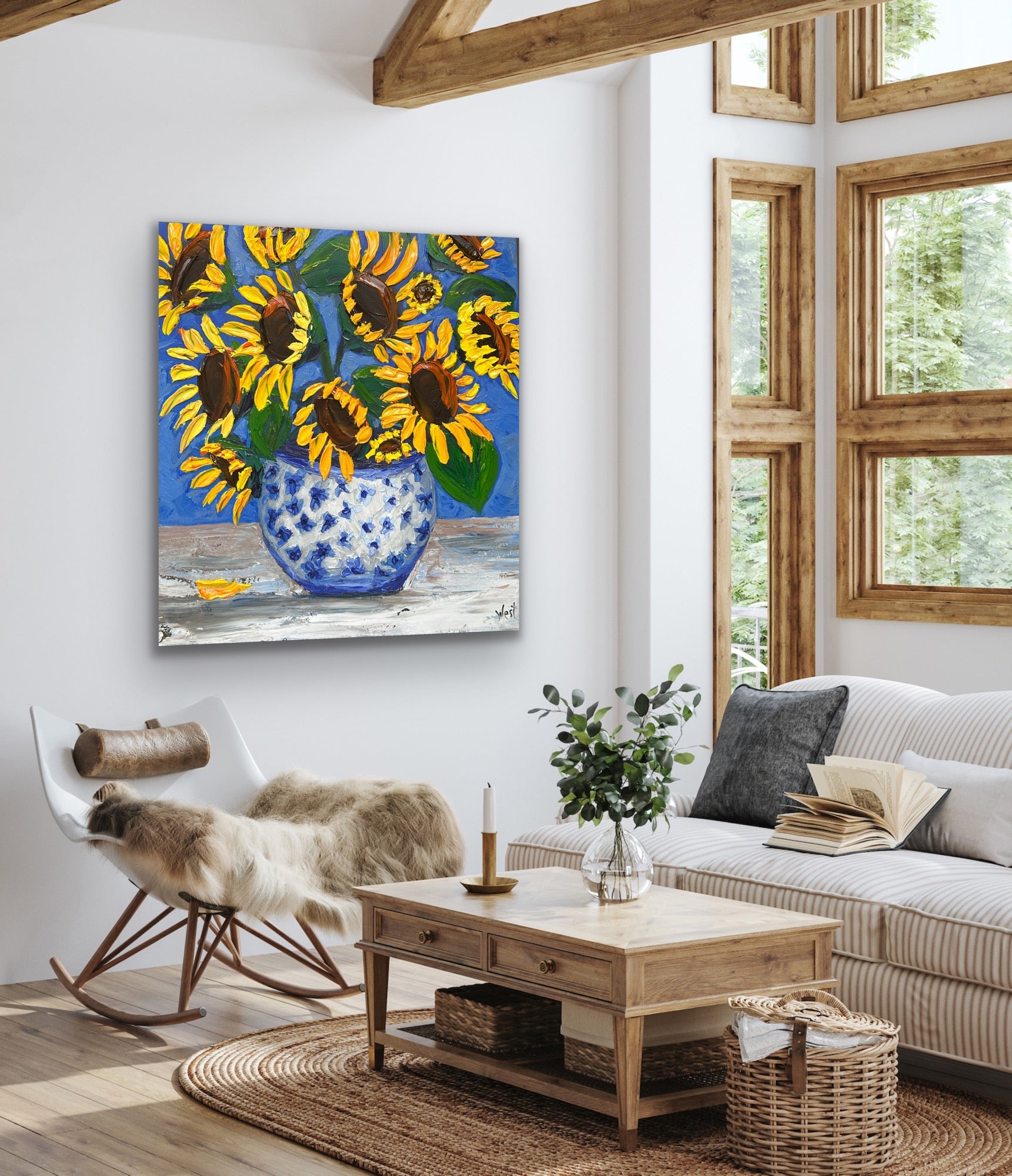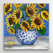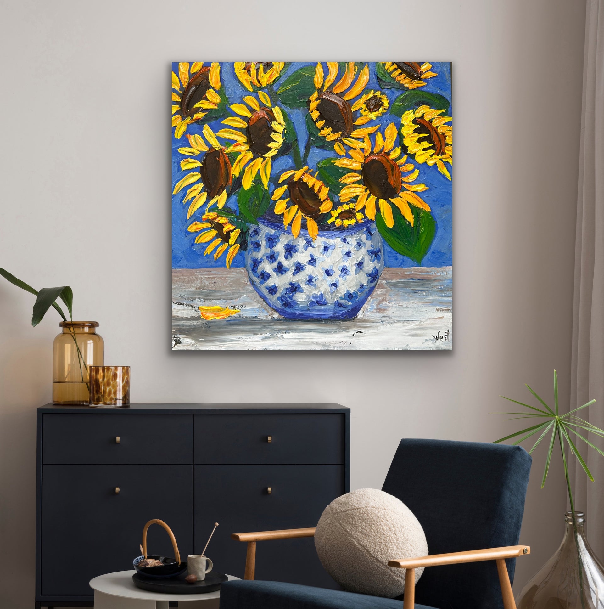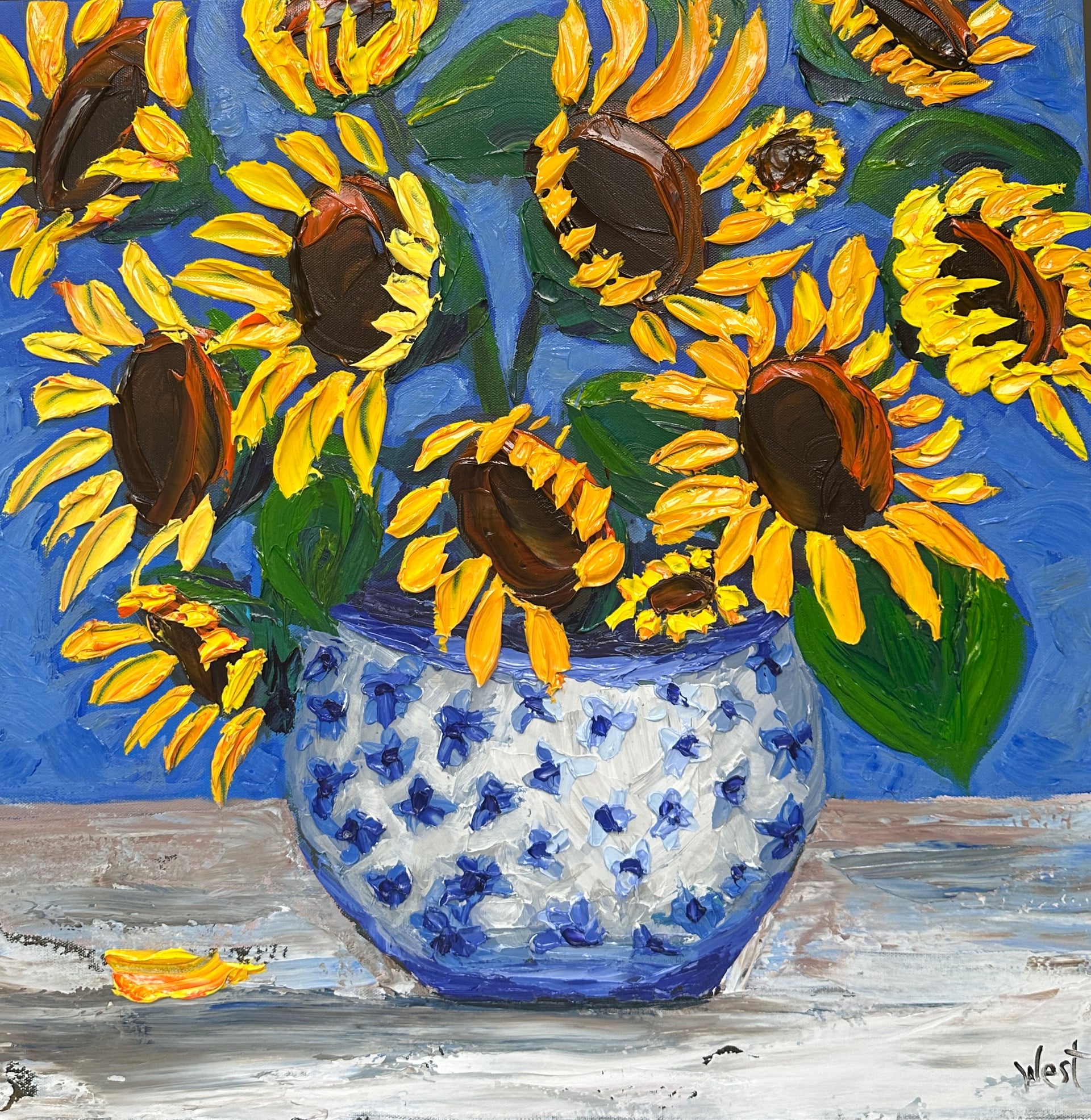 “Heart of Sunshine” is one of my favorite still life pieces, and it was such a joy to create! The large, cheerful sunflowers practically glow as they fill a classic blue-and-white ginger jar vase. I used a palette knife to build up the thick, textured petals, which give the flowers a sense of depth and movement. The complementary blues in the background were a deliberate choice to make the sunflowers feel even warmer and more vibrant. And that single fallen petal on the table? It’s a little detail I love, adding a sense of quiet charm to the piece. It’s my hope that this painting brings a sense of joy and light to anyone who sees it!