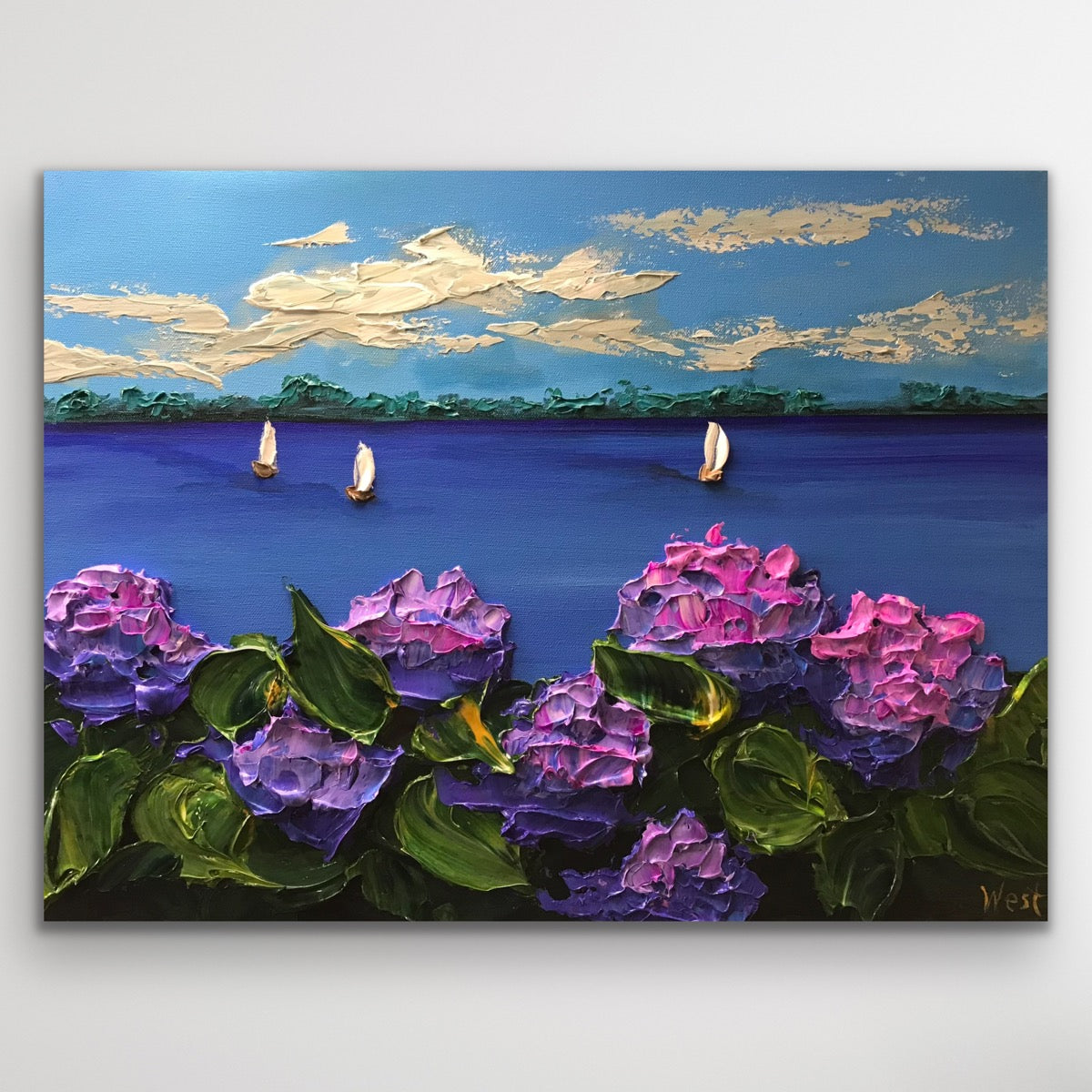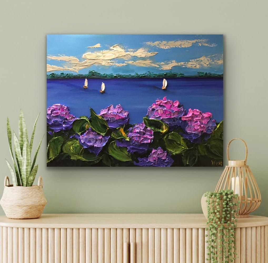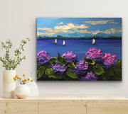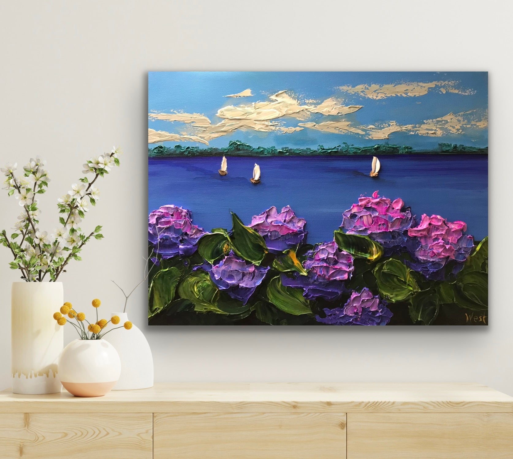 -Original palette knife painting – coastal floral seascape with hydrangeas and sailboats