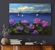 This impasto painting is a celebration of summer’s serenity, where vivid blooms meet the endless stretch of sea and sky. At the forefront, lush hydrangeas rise in thick, textured layers of violet and magenta, their petals sculpted with a palette knife to feel almost alive. Their rich greens anchor the scene, spilling forward with a sense of abundance, making this a striking piece of luxury wall art for collectors and coastal interiors.