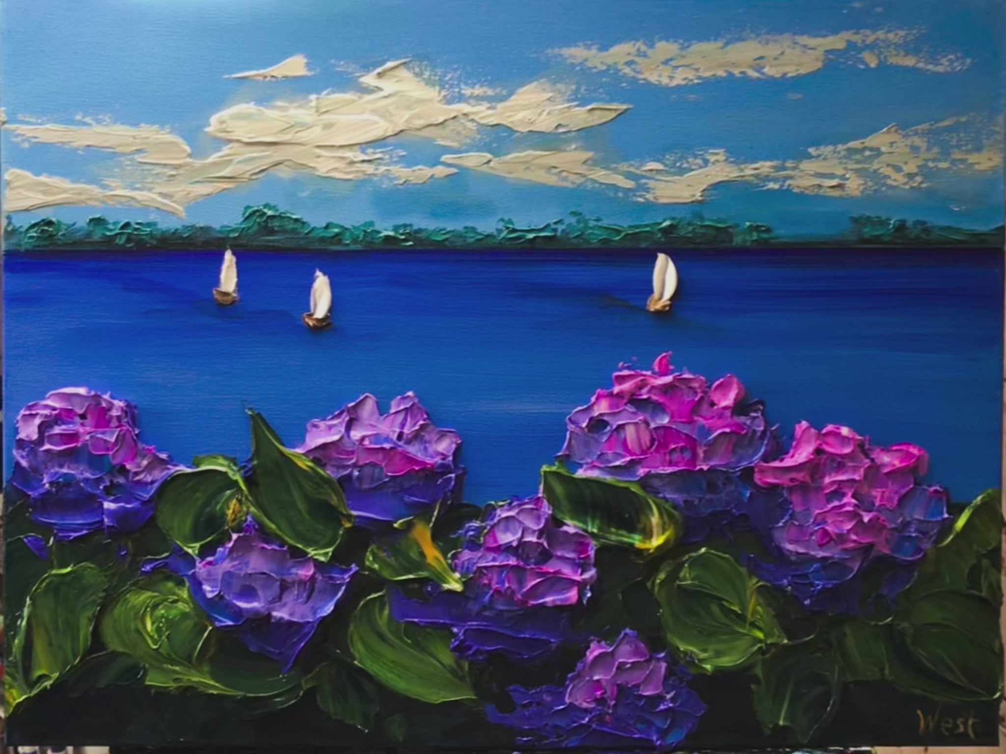 I’ve always adored hydrangeas—their fullness, their shifting colors, and the way they seem to carry both elegance and joy. Painting them here felt like capturing a piece of my own happiness, blending their beauty with the calming rhythm of the sea. For me, Hydrangea Horizons is about savoring that perfect harmony of flowers, water, and sky—moments where the world feels both peaceful and full of life.