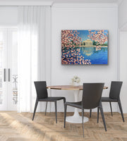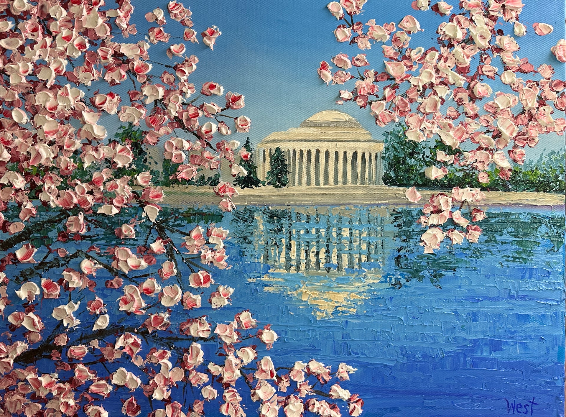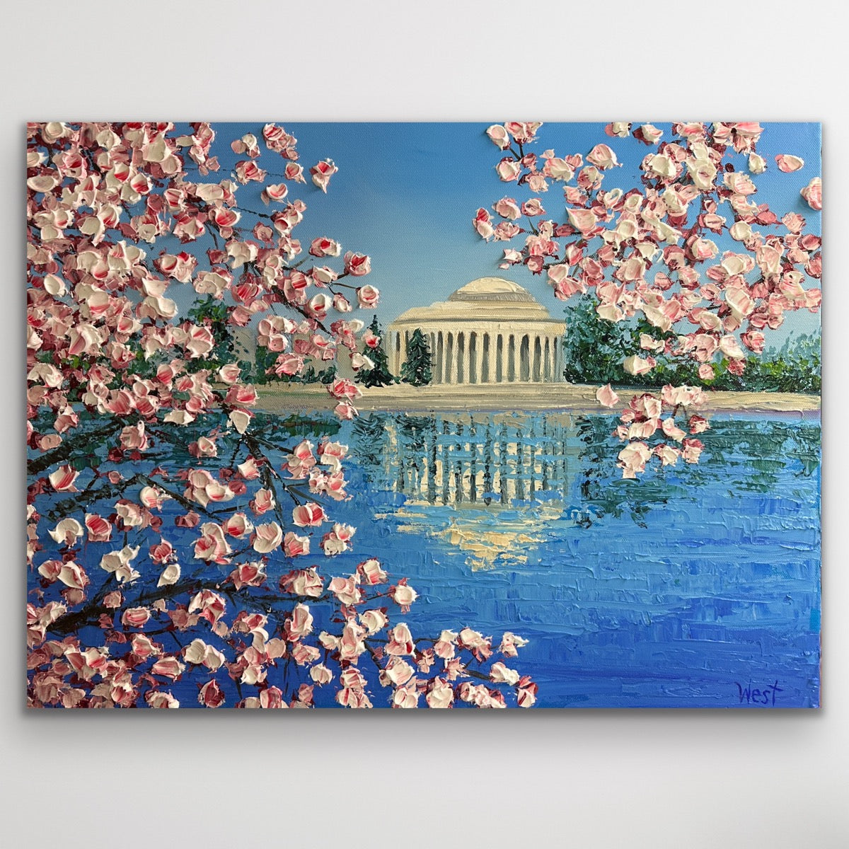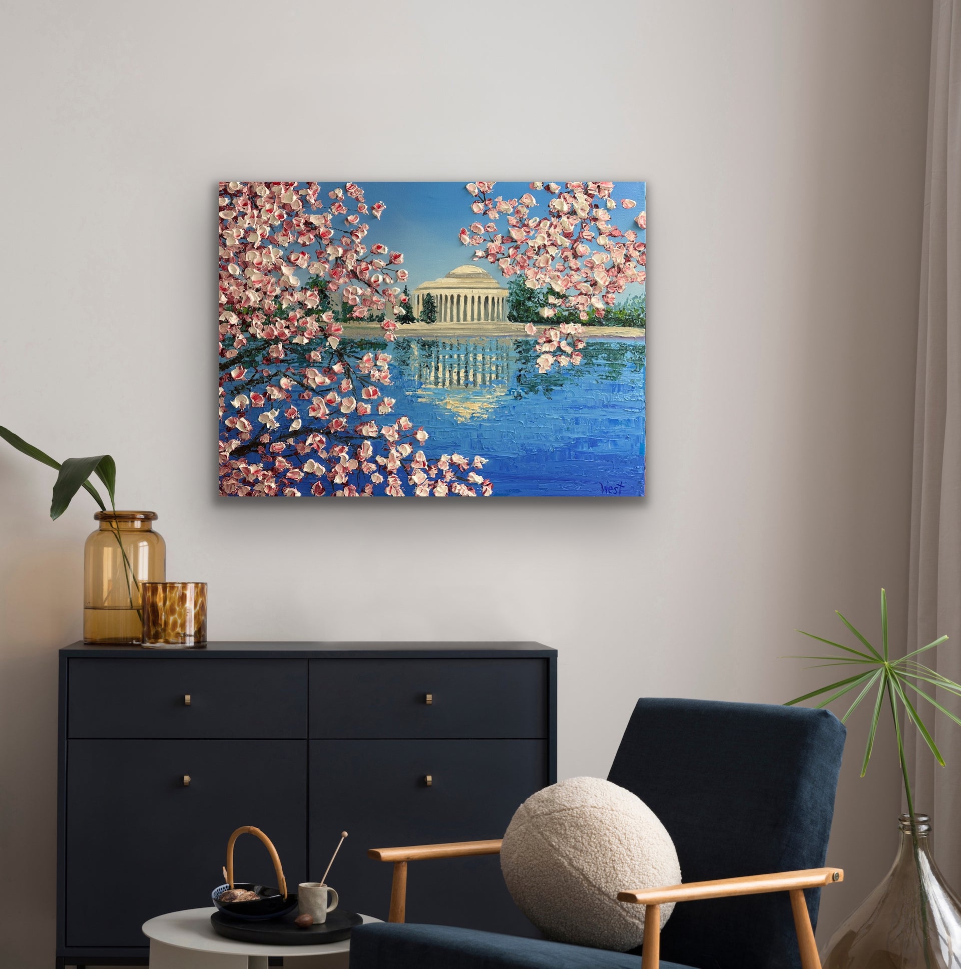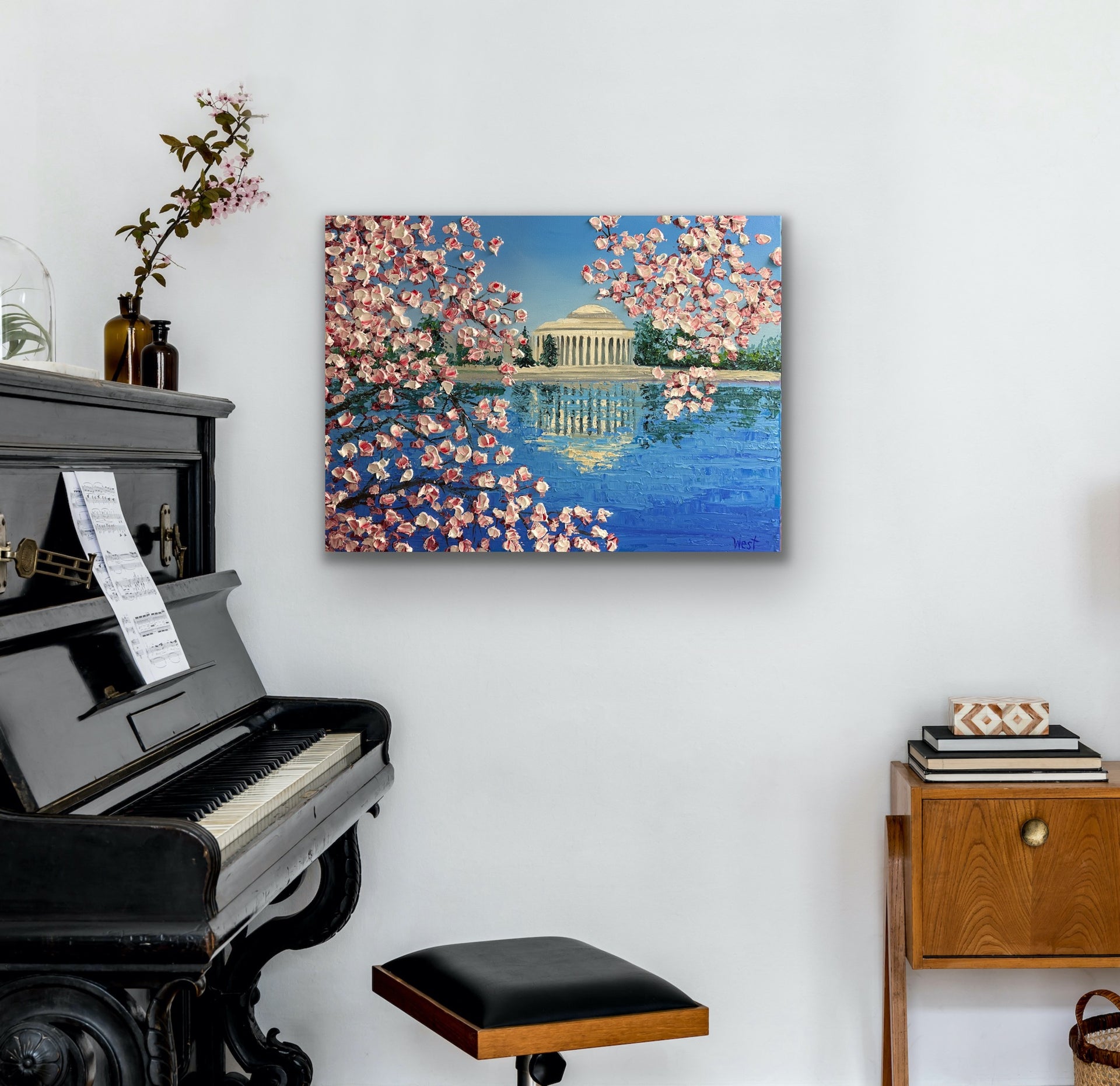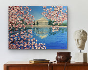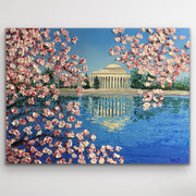 In "Jefferson in Bloom," the Jefferson Memorial is framed by the ethereal beauty of blooming cherry blossoms. The soft, delicate pink petals create a veil-like effect, partially obscuring the memorial and infusing the scene with a sense of enchantment and serenity.