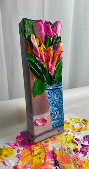In Joyful Arrangement, I wanted to capture the playful energy of yellow and pink tulips in full bloom. Using thick, impasto strokes with my palette knife, I brought the vibrant petals to life, giving them texture and dimension that almost seem to leap off the canvas. The tulips are nestled in a ginger jar vase, which I created by hand-painting and collaging papers, giving it a unique, layered quality that complements the dynamic blooms. This piece is all about celebrating the joy and vibrancy of spring—its cheerful colors and textures are meant to bring warmth and happiness into any space.