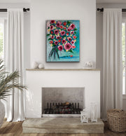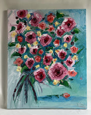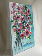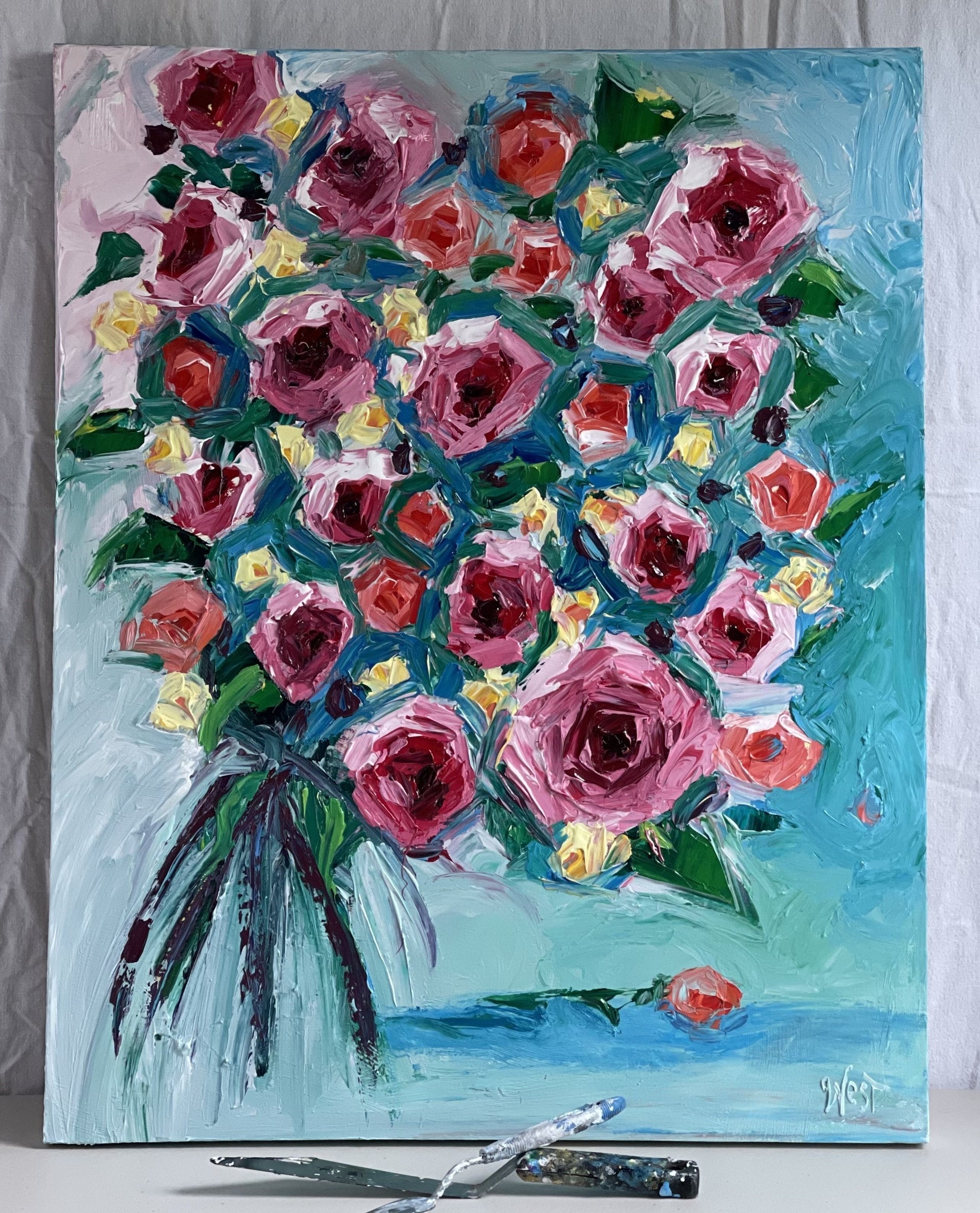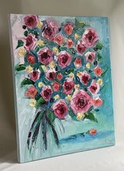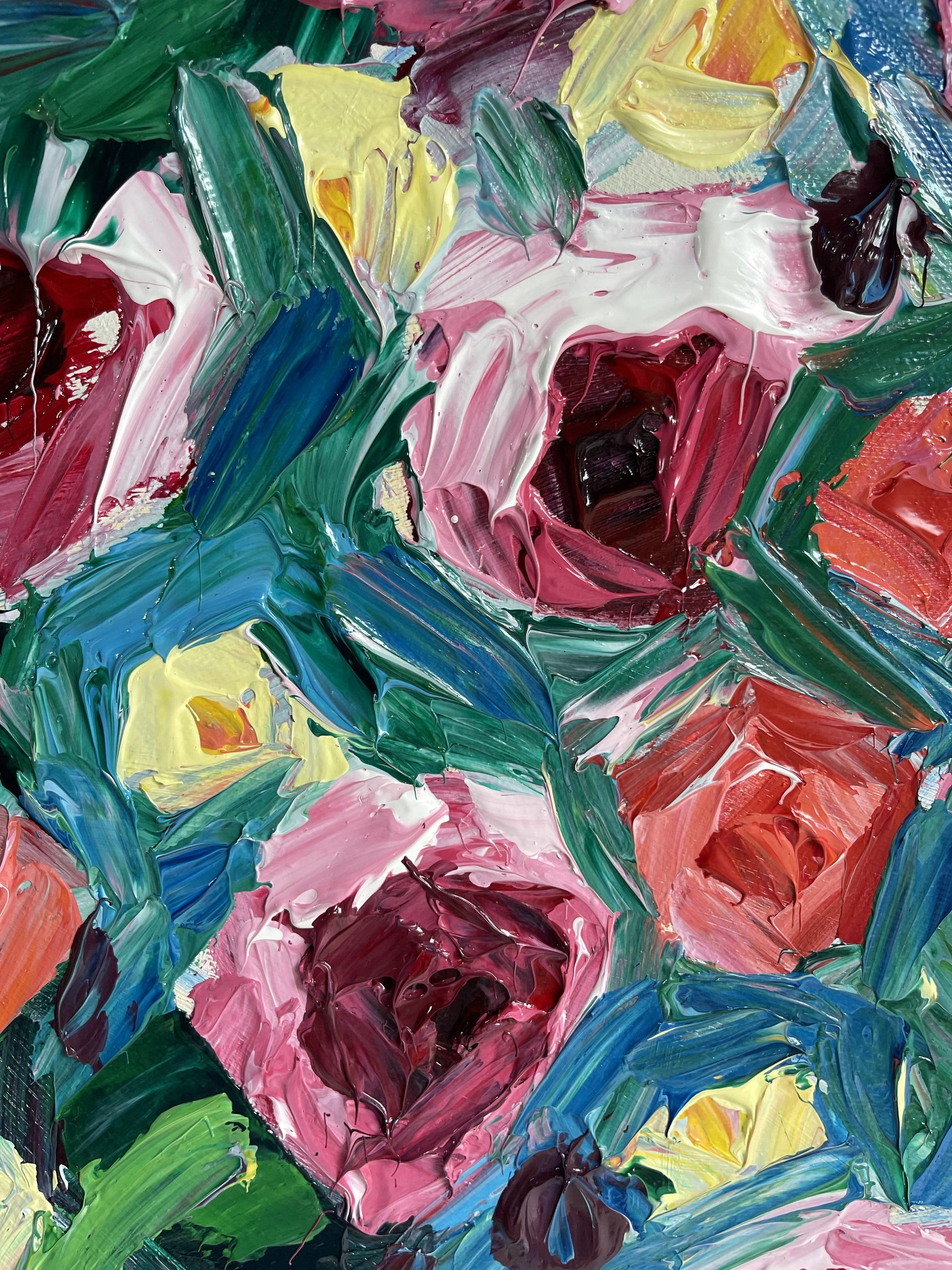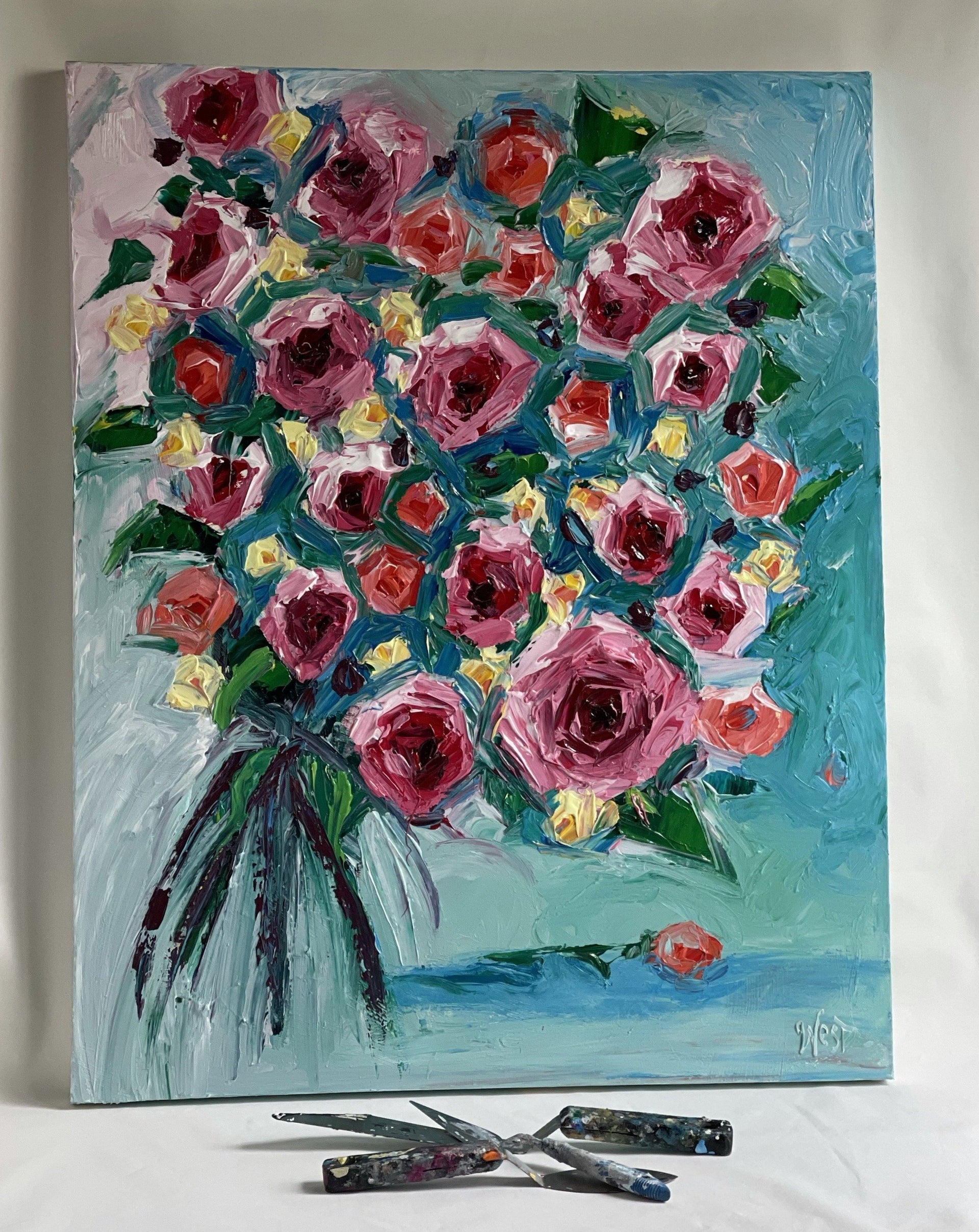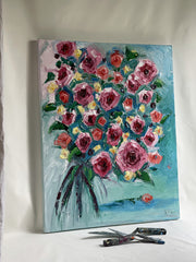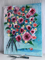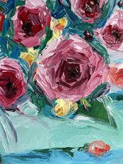 My "Rose Party" was created 100% with my fingers using the highest quality acrylic paints and mediums. No brushes or other implements of any kind were used to create this stunning rose, salmon and yellow bouquet. I hope you love it as much as I do!