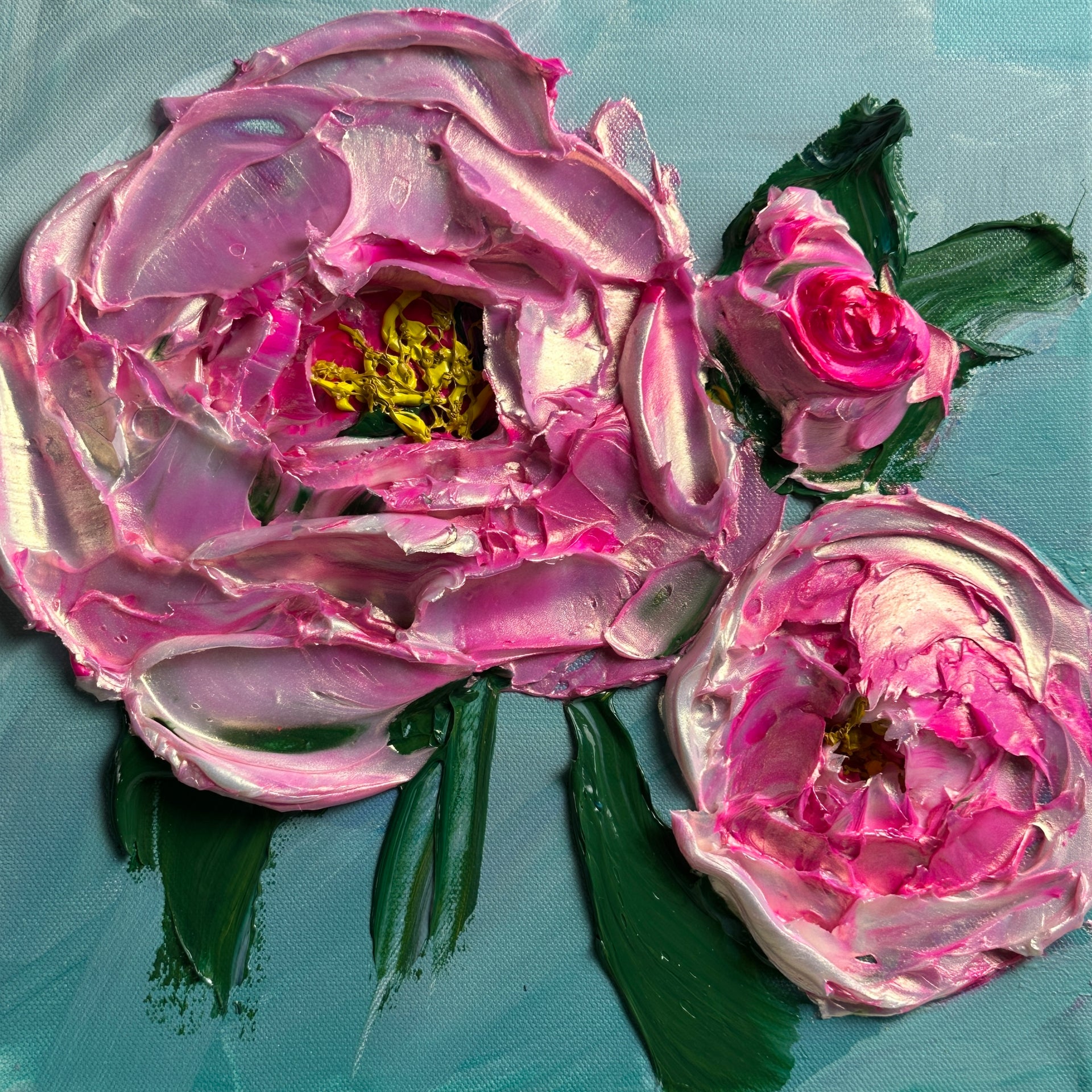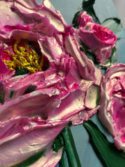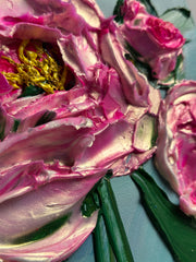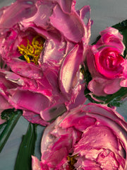 Bold, bright, and full of life, Petals Like Light captures the dazzling beauty of peonies in bloom. Each flower is sculpted with thick, expressive strokes of the palette knife, creating luminous texture and dimension you can almost feel. The vibrant pink petals shimmer with iridescent highlights, dancing against a cool, serene background. Radiating energy and elegance, this piece celebrates the joy and wonder of nature’s most radiant moments—like catching the perfect bloom at just the right light.