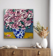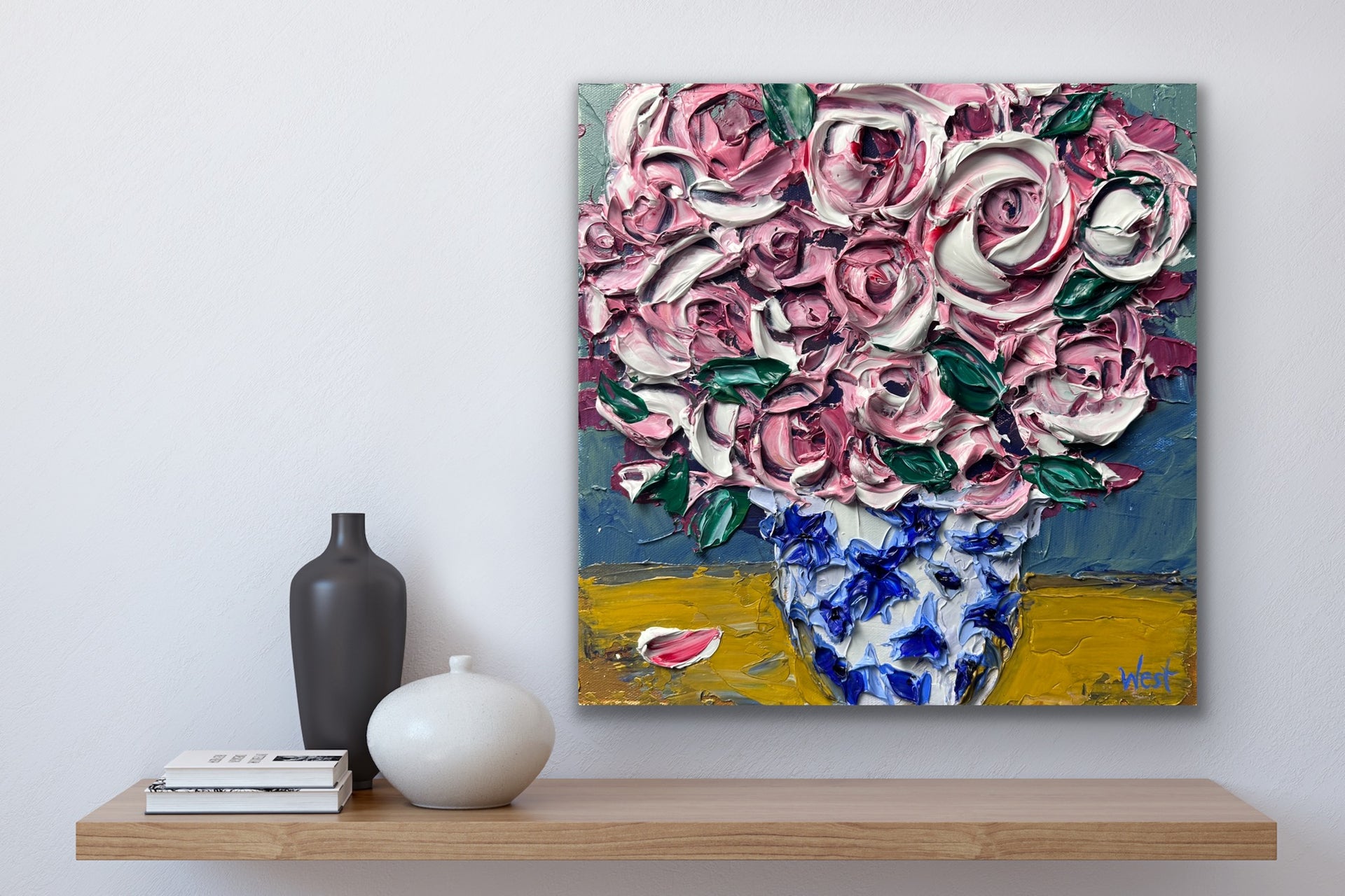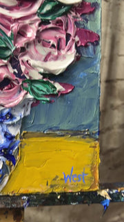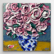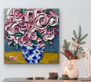 "Petals of Grace" captures the timeless elegance of roses in full bloom. Using a palette knife, I layered thick, textured petals in deep crimson and warm gold, creating a rich, tactile surface that invites you to explore every detail. The roses spill gracefully from a classic ginger jar, their bold colors softened by the gentle interplay of light and shadow. This piece is a celebration of beauty, warmth, and the quiet power of nature’s most romantic flower.