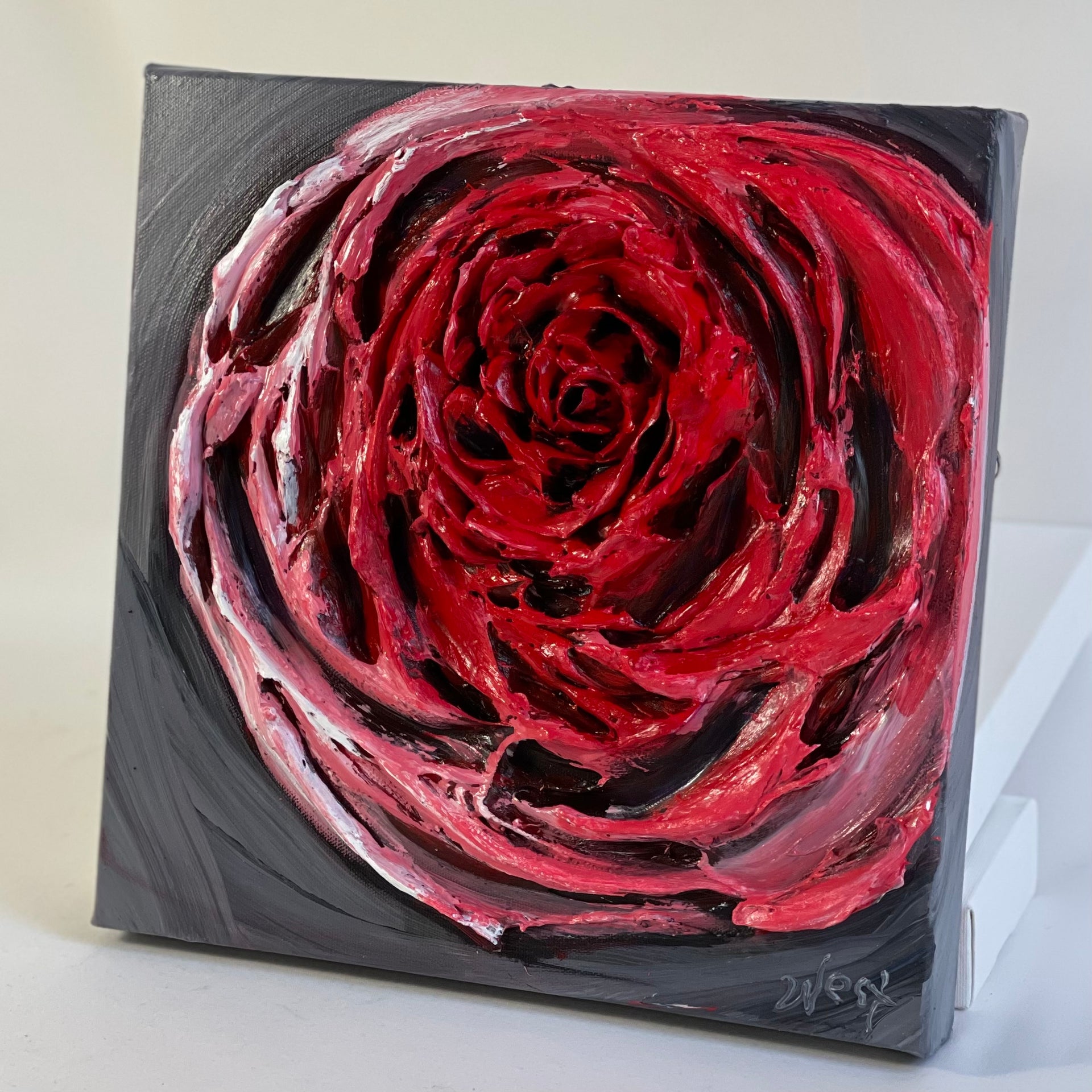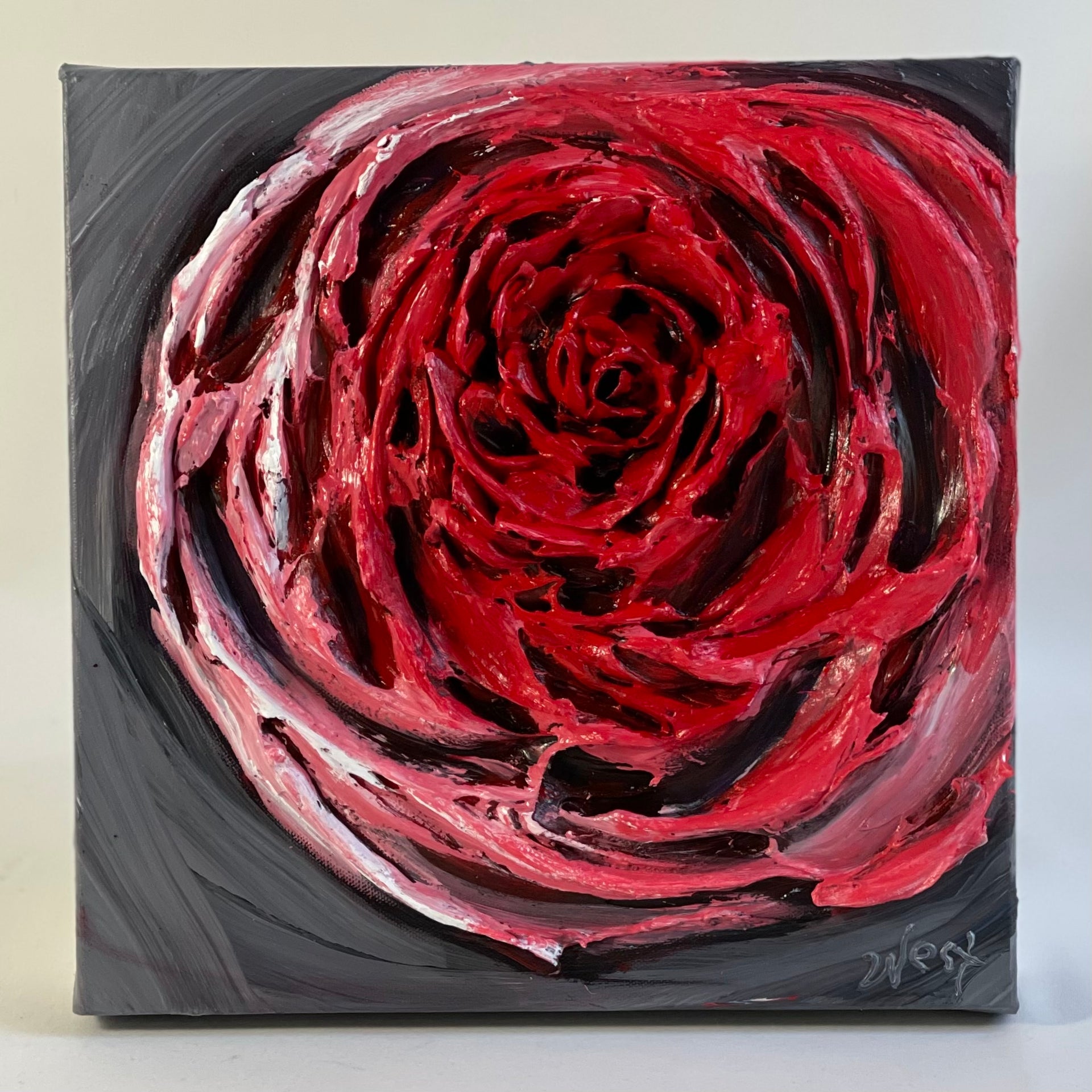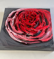 My "Peaceful Rose" was created with the country of Ukraine in my heart and mind. This is a highly textured piece where I used palette knives and texture medium with special techniques to create the depth of the center of the rose.