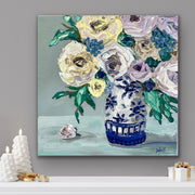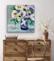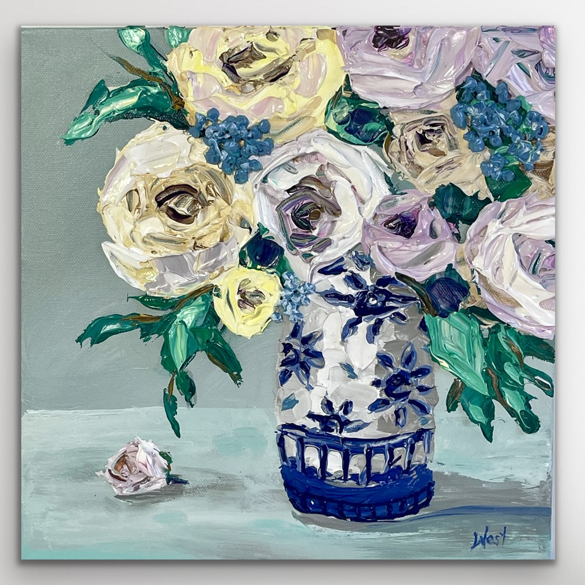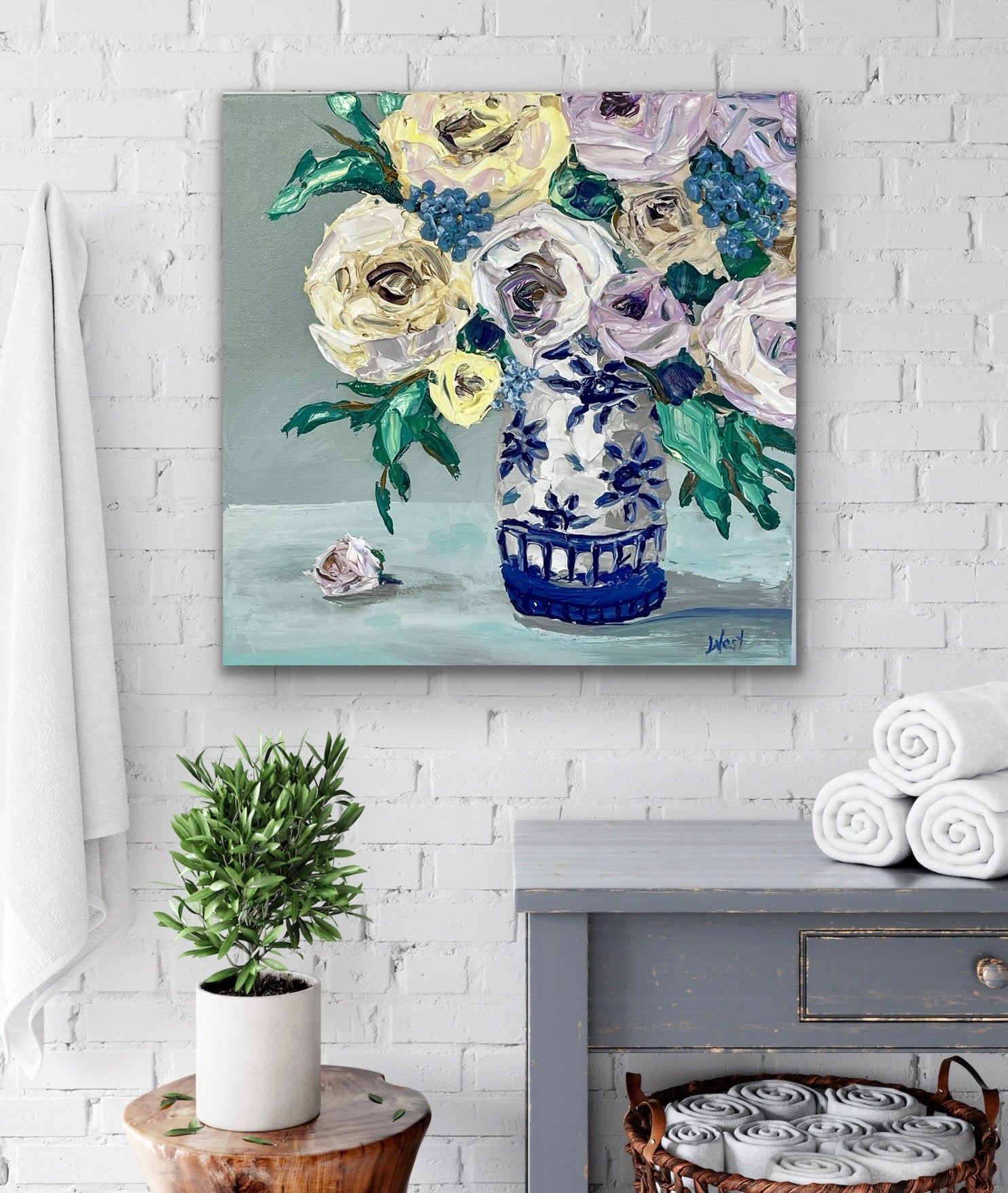 As the artist, I love my "Rose Whispers" for its stunning chinoiserie jar in deep blues and white, filled with roses in dusty rose, white, and lilac roses. I used palette knives to create what I hope is a unique visual experience and a creation you or a loved one will treasure in your home. The texture adds depth and dimension, giving the piece a tactile quality that draws the viewer in.