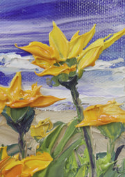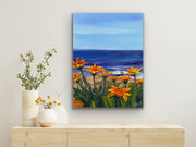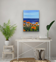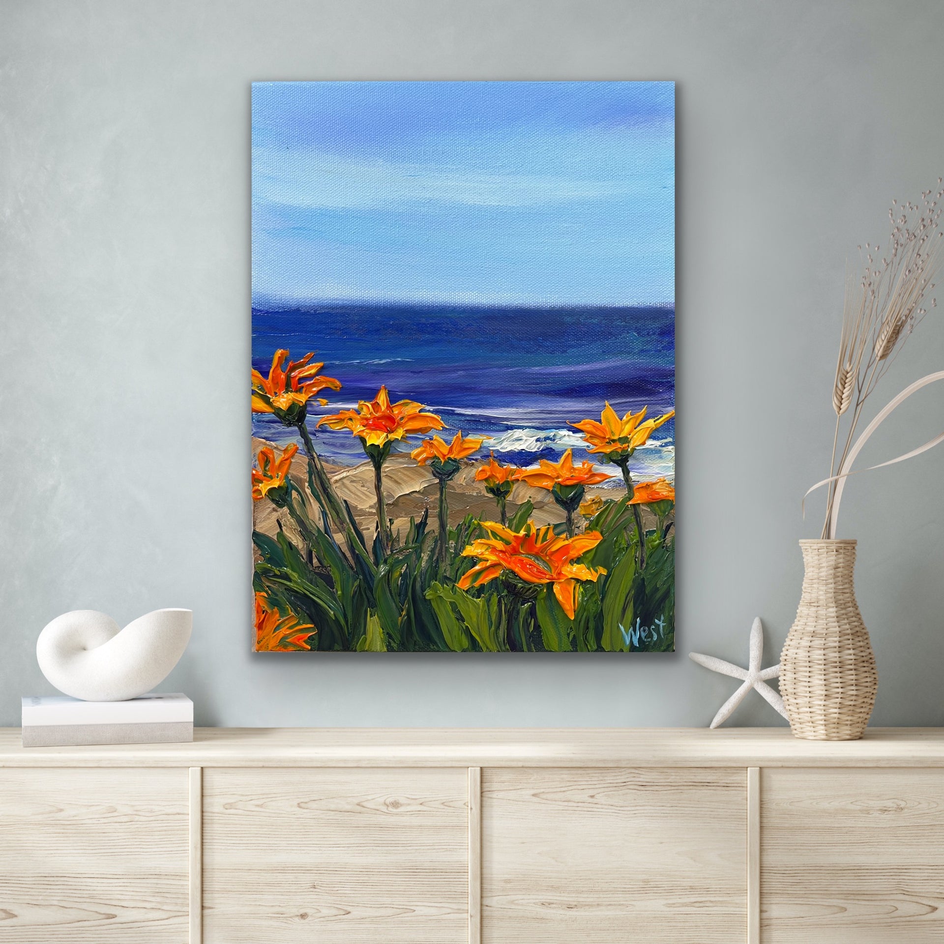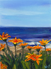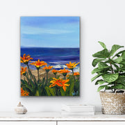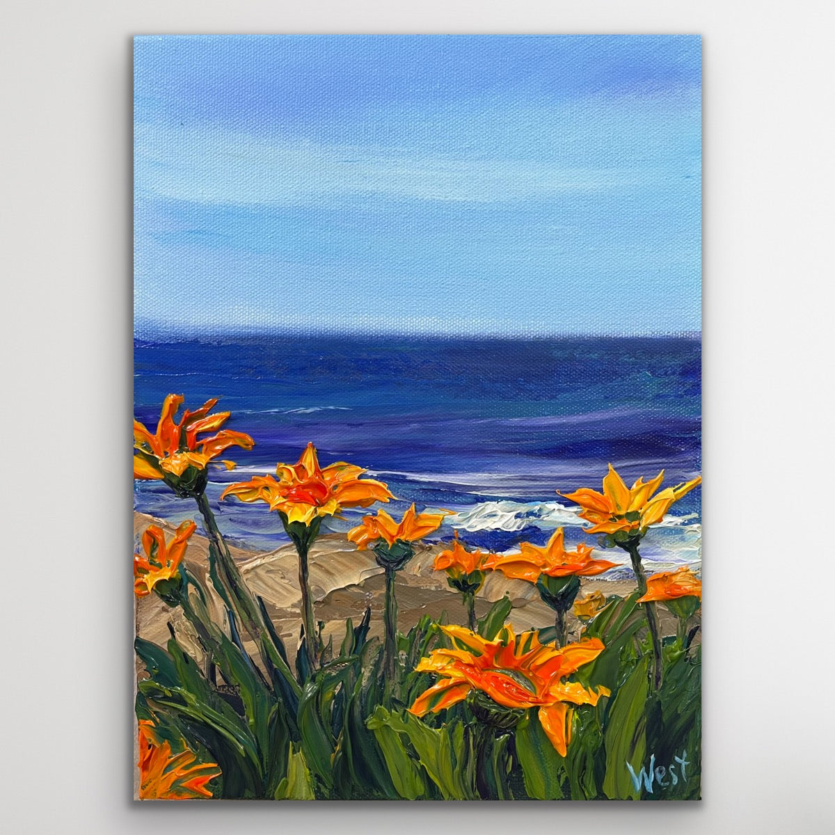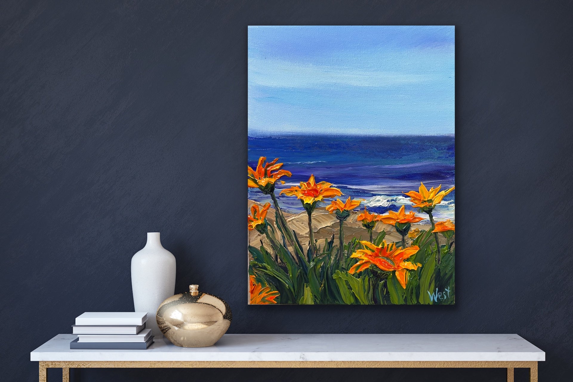 "Seaside Bouquet" is a peaceful scene of the lovely ganzania flowers growing by the seaside cliffs in the summer sun. I hope this piece resonates with you to bring the serenity of nature to your home or the home of someone you love.