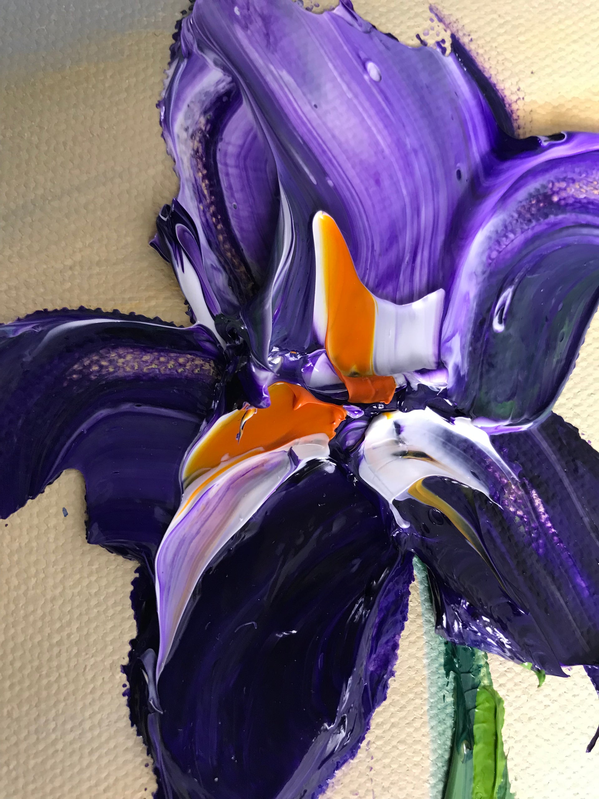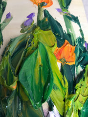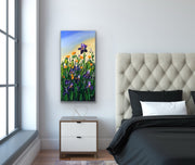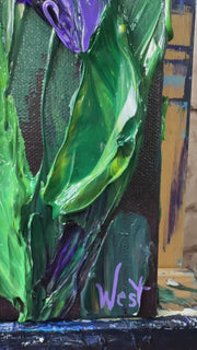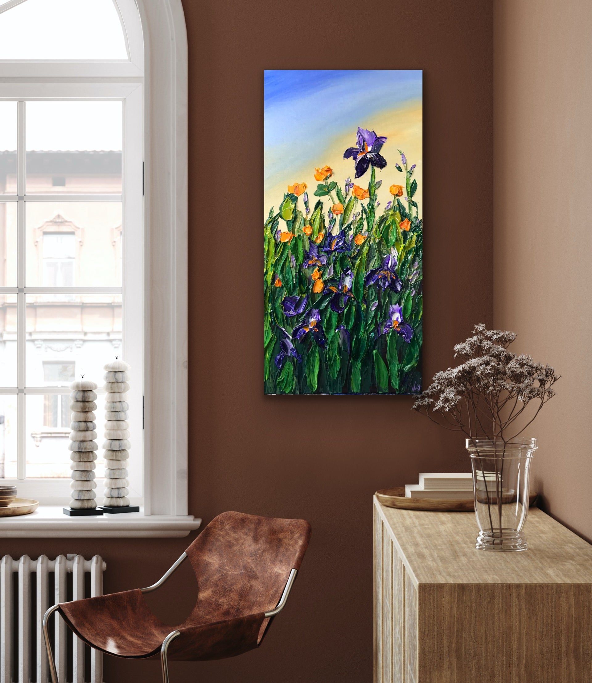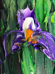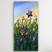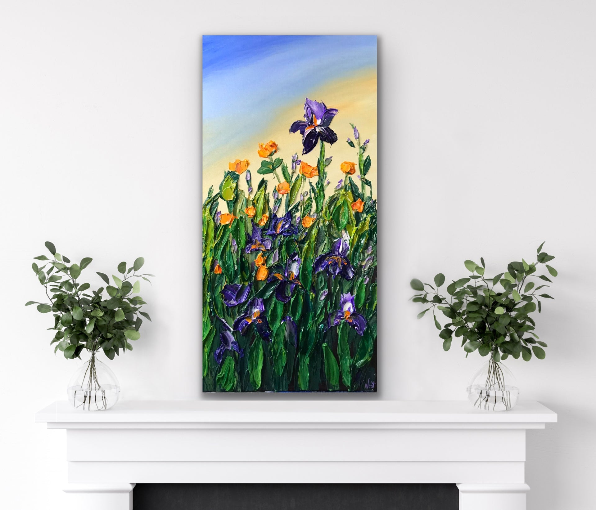 "Sky-Kissed Blooms" captures the enchanting beauty of irises bathed in the warm embrace of a sunset. The regal purple irises stand tall, their thick, textured petals seeming to catch the last golden light of the day. Each palette knife stroke breathes life into the flowers, making them appear as if they are gently swaying in the fading warmth of evening.
