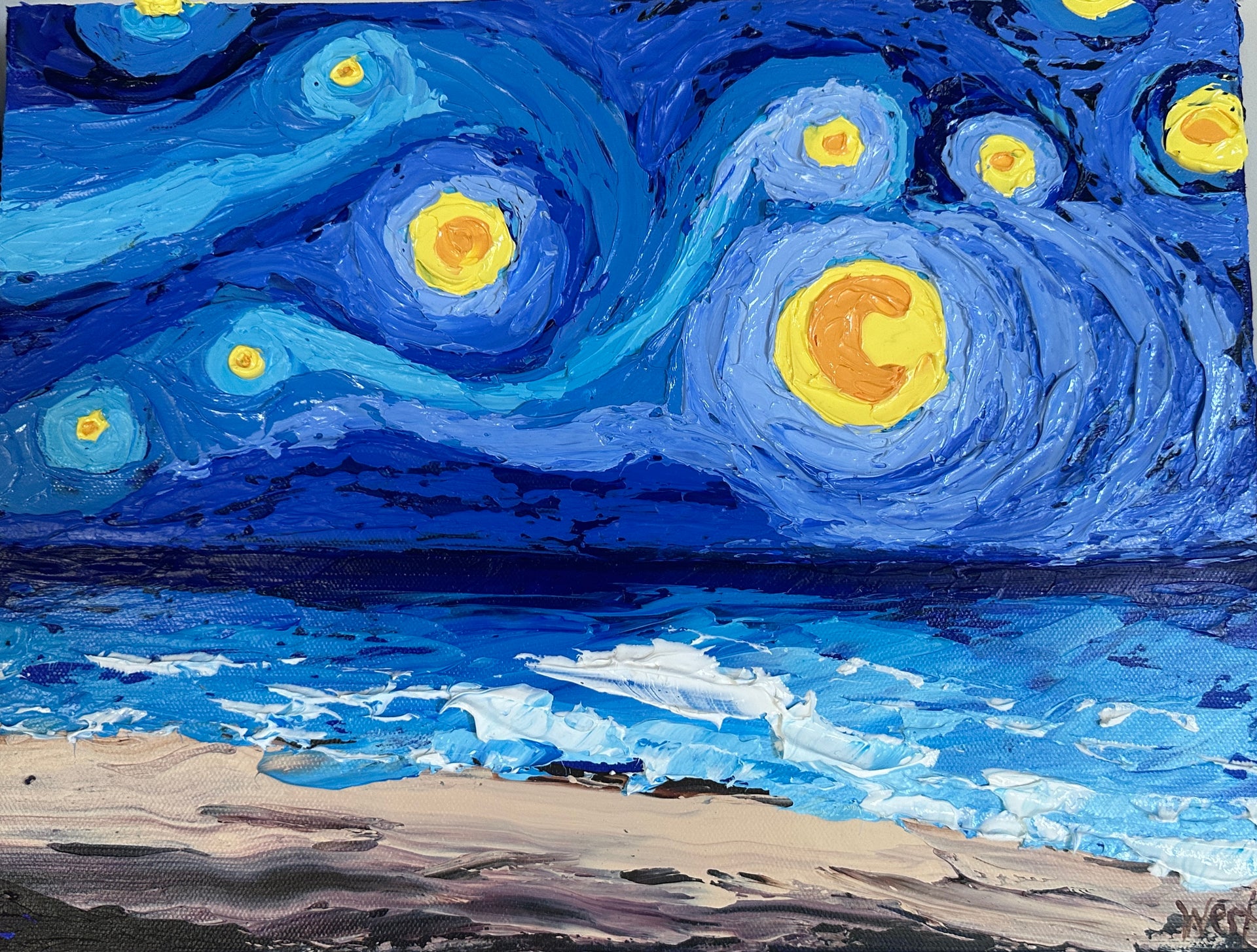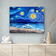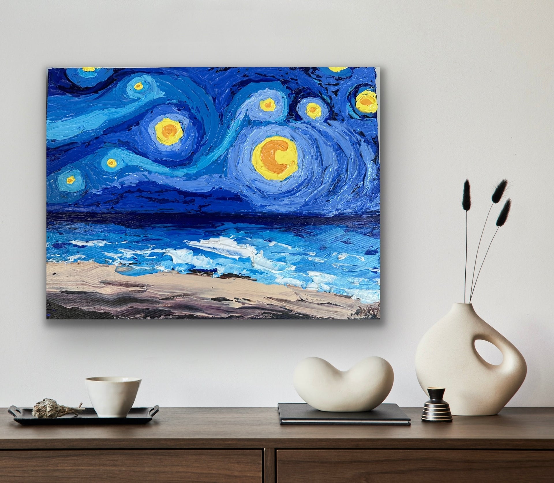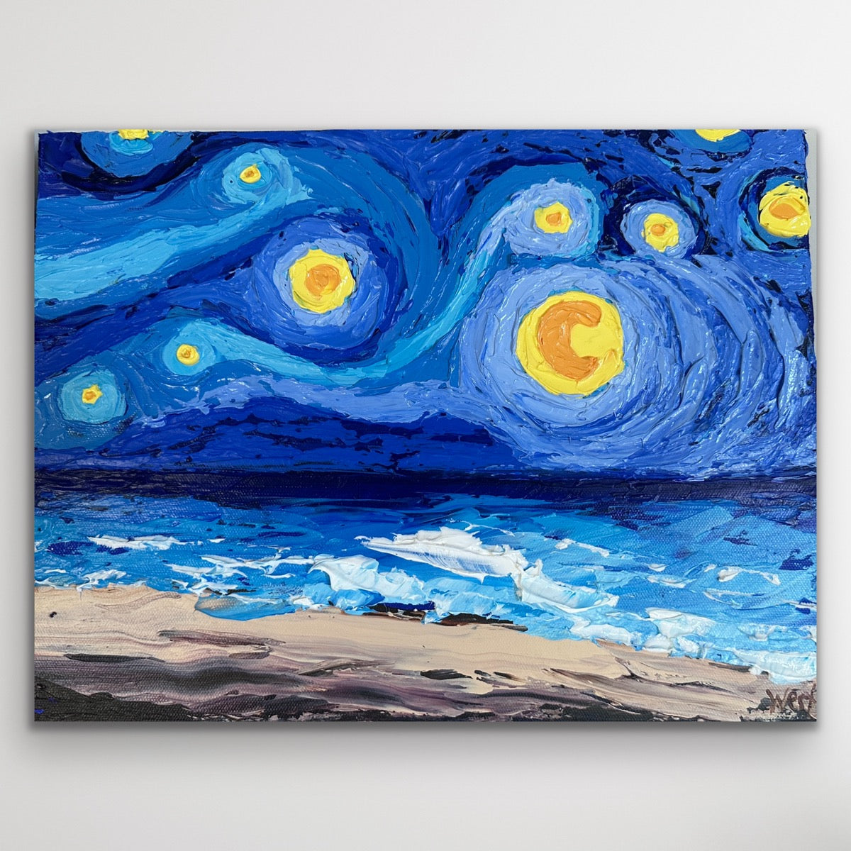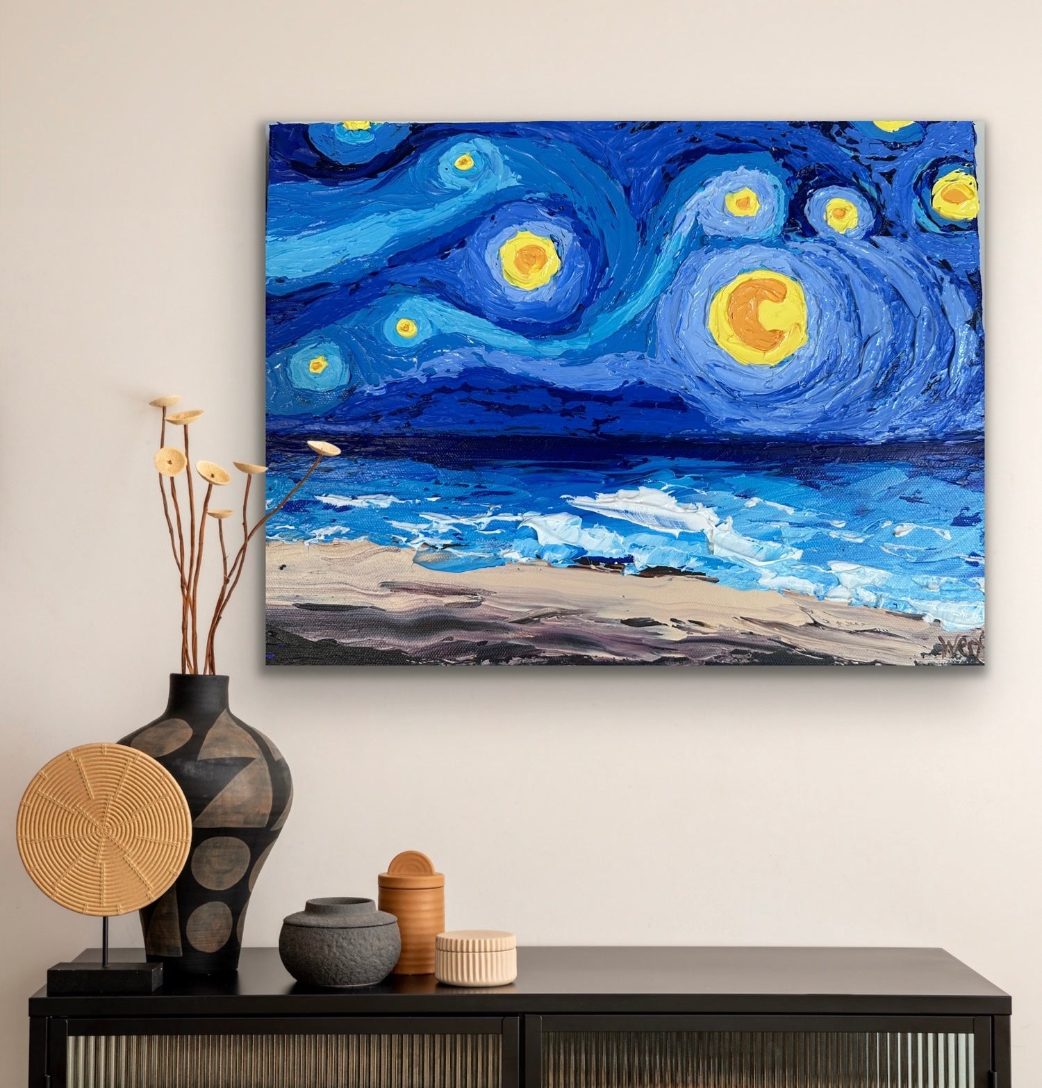 "Starry Ocean" is my Van Gogh tribute, capturing the enchanting beauty of a tranquil night by the ocean, where the boundaries between earth and sky dissolve into a harmonious dance. The canvas is a symphony of velvety blues and yellows, reflecting the tranquility of the night sea beneath the starry sky.